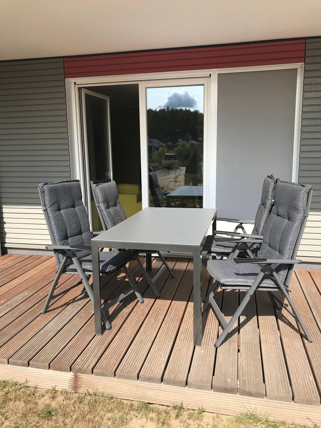 Die Terrasse mit kleiner Grünfläche ist nach Süden ausgerichtet und einem Tisch und vier Stühlen