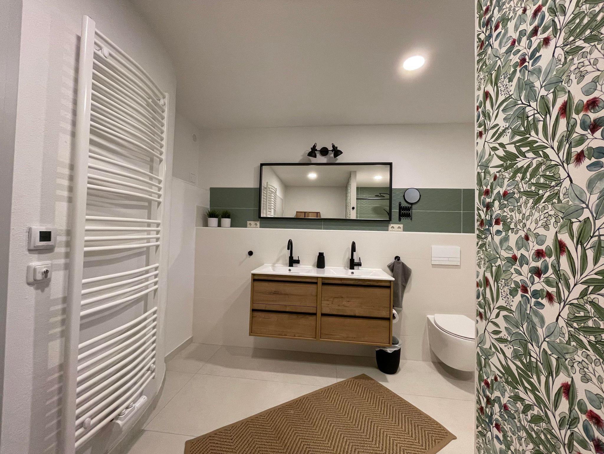 BAD/ WC - Das Hauptbadezimmer ist hell und modern ausgestattet - Doppelwaschtisch, ebenerdige Dusche, partielle Fußbodenheizung. Genug Stauraum und Ablagemöglichkeiten ergänzen die Funktionalität. Handtücher, ein gefüllter Seifenspender, Kosmetikspiegel und Föhn stehen für Sie bereit. Das kleinere WC ist mit Waschbecken, Spiegelschrank und einer kleinen Ablagemöglichkeit ausgestattet. WLAN steht kostenfrei zur Verfügung.