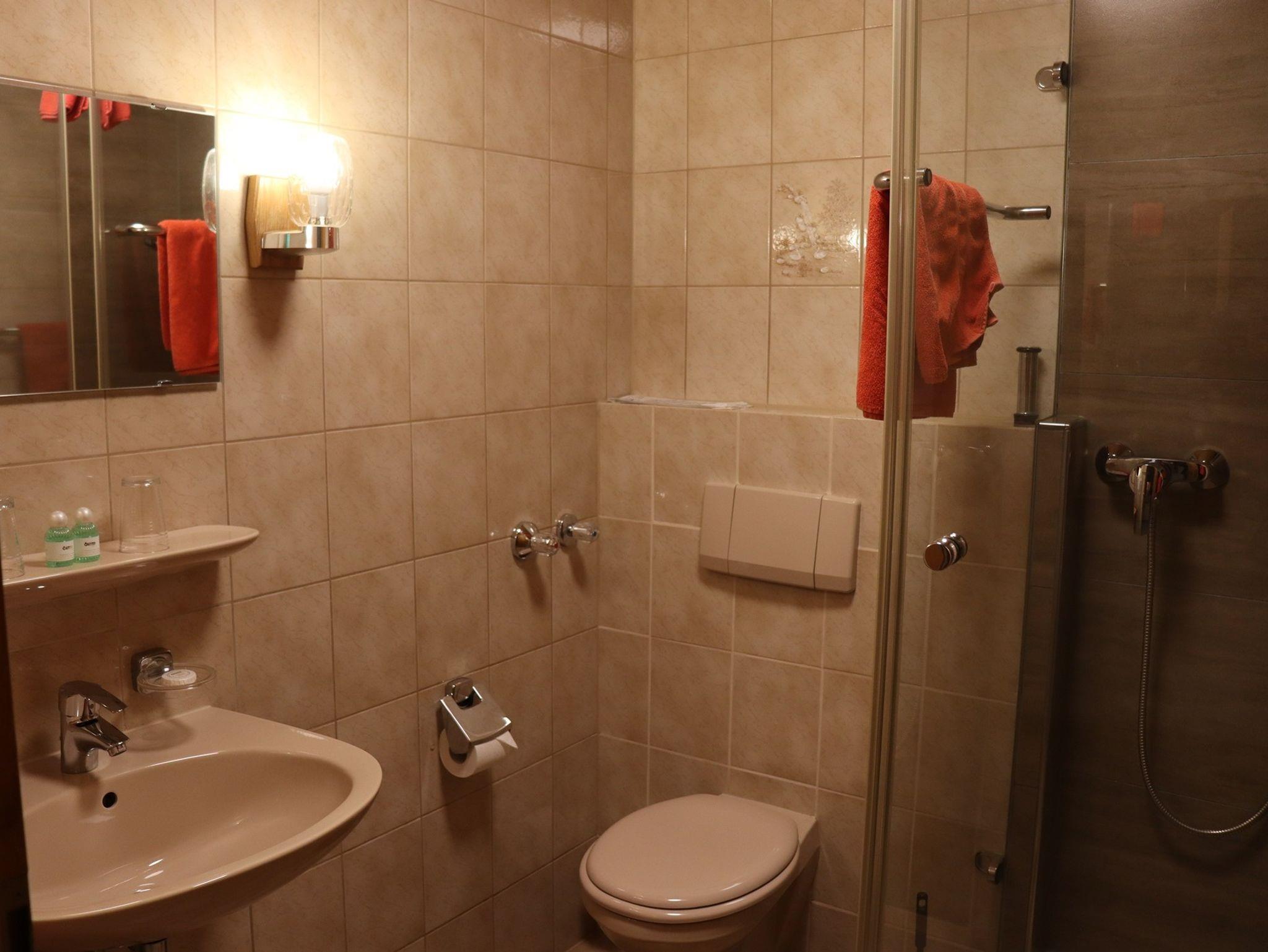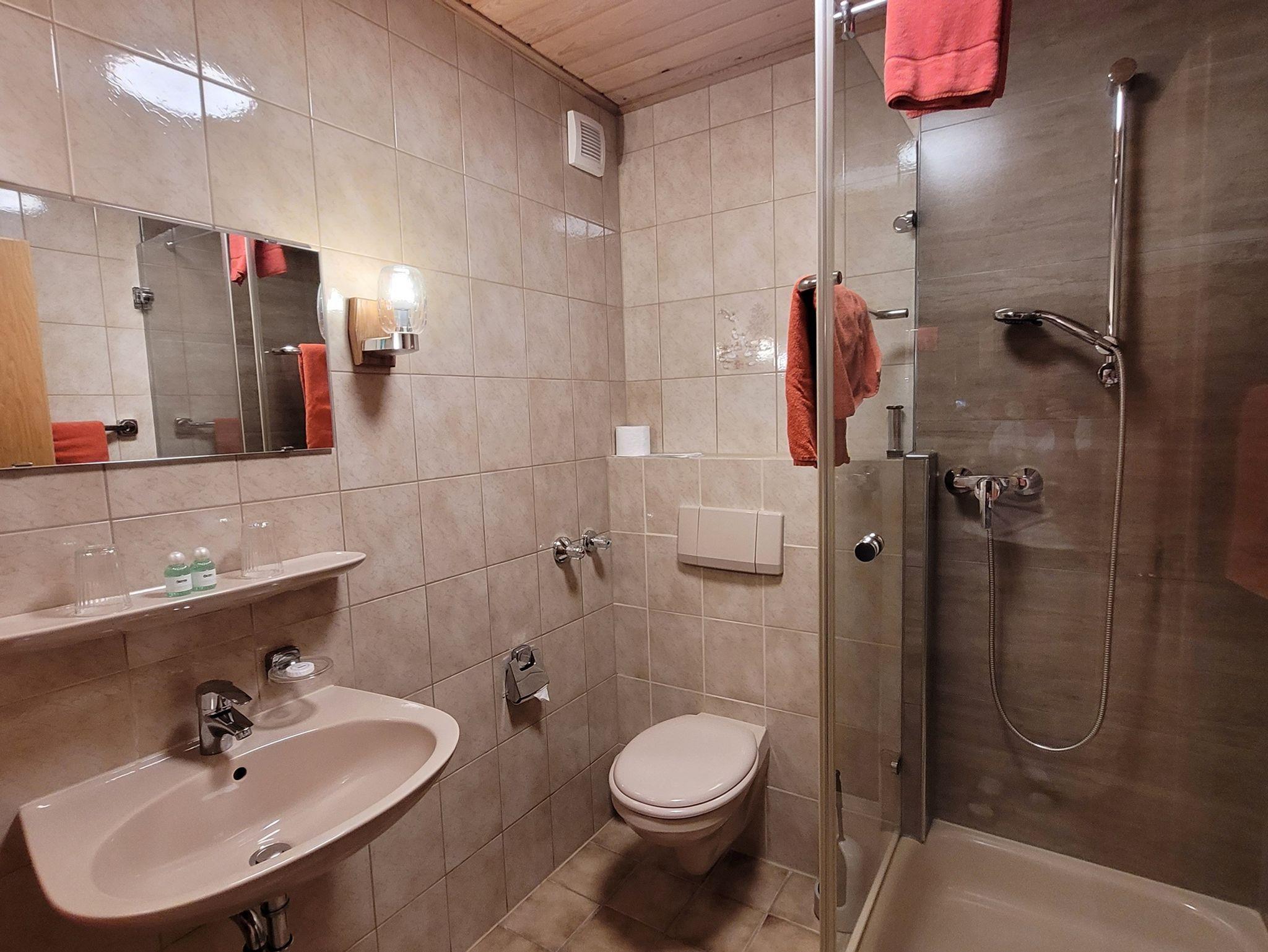 Unser Bad besteht aus Dusche, WC und Waschbecken. Einen Fön können sie gerne an der Rezepion verlangen. Für mitgebrachte Fahrräder haben wir eine Halle zum Unterstellen, wo man auch Steckdosen zu Laden für E- Bike findet.