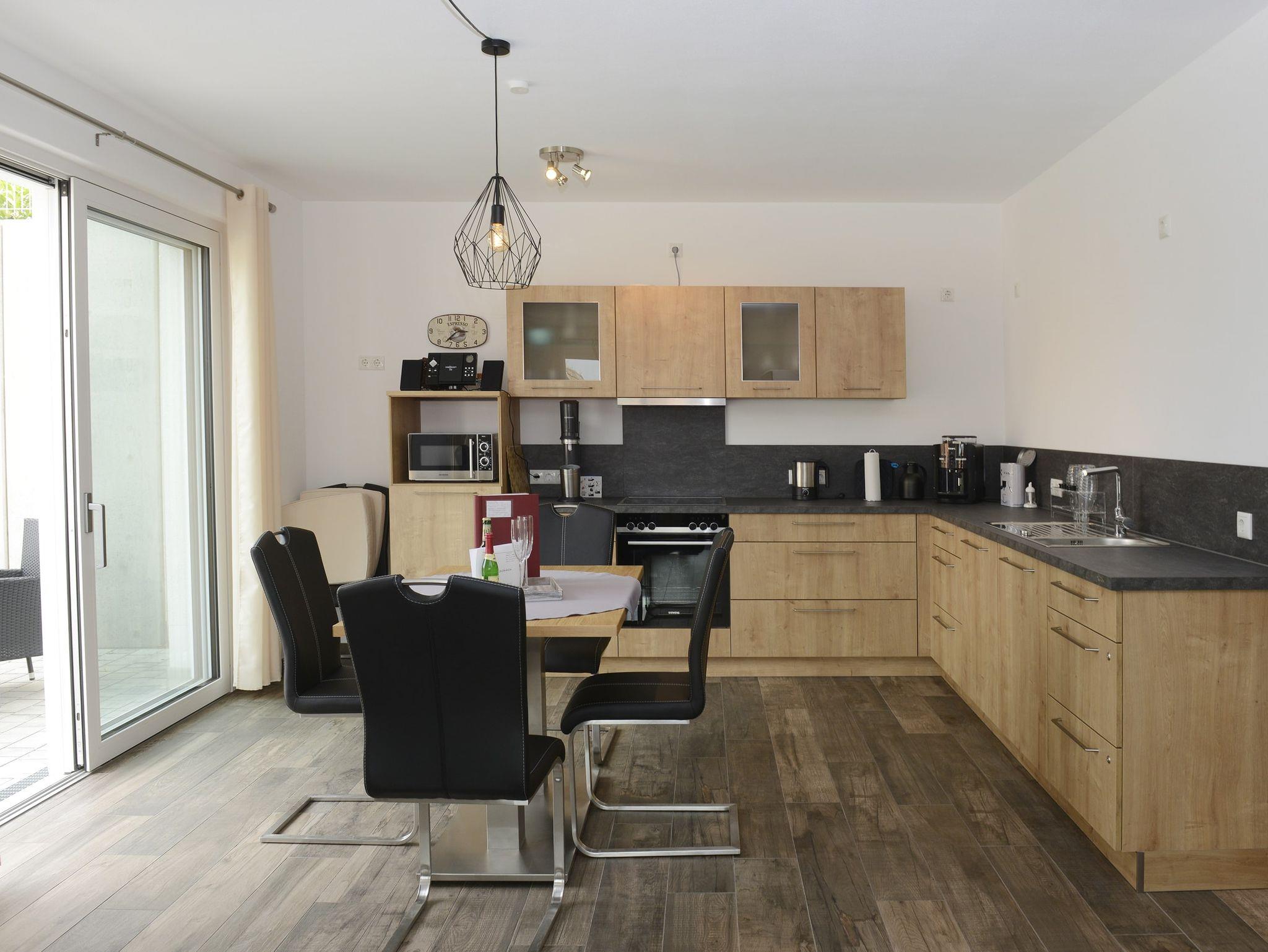 Die moderne, voll eingerichtete Küche beinhaltet neben den üblichen Elektrogeräten wie Geschirrspüler, Mikrowelle und Backofen auch einen Toaster, einen Wasserkocher, eine Kaffeevollautomaten (ganze Bohnen stehen bereit), einen Trinkwassersprudler sowie genügend Geschirr für alle anwesenden Urlauber.