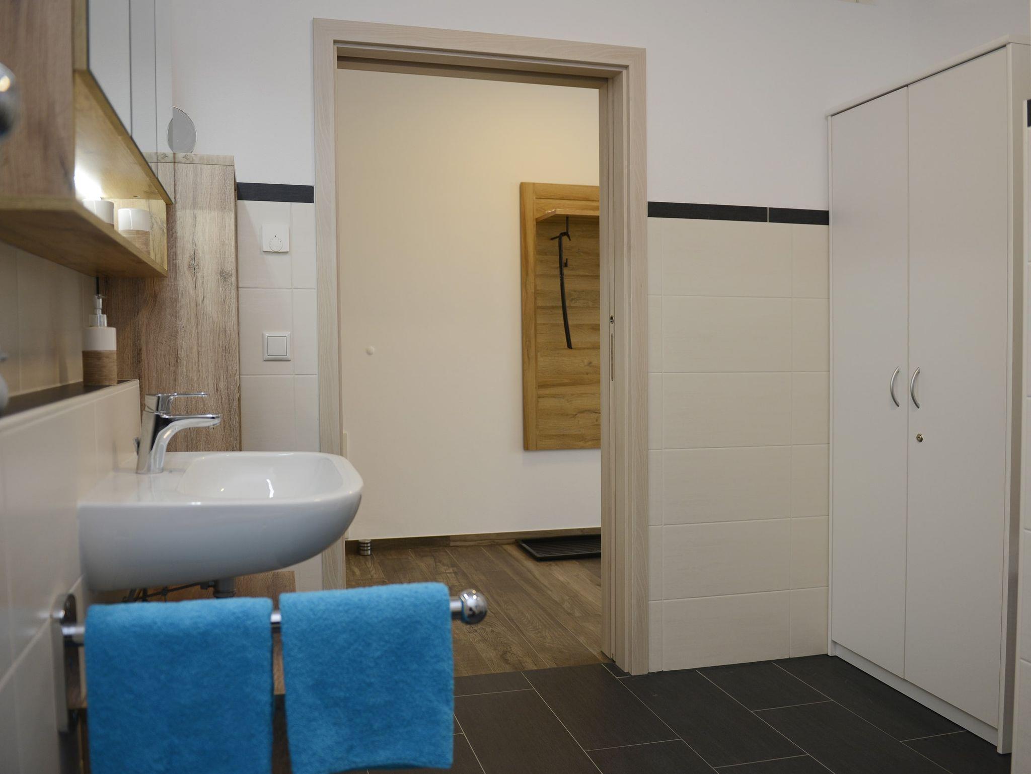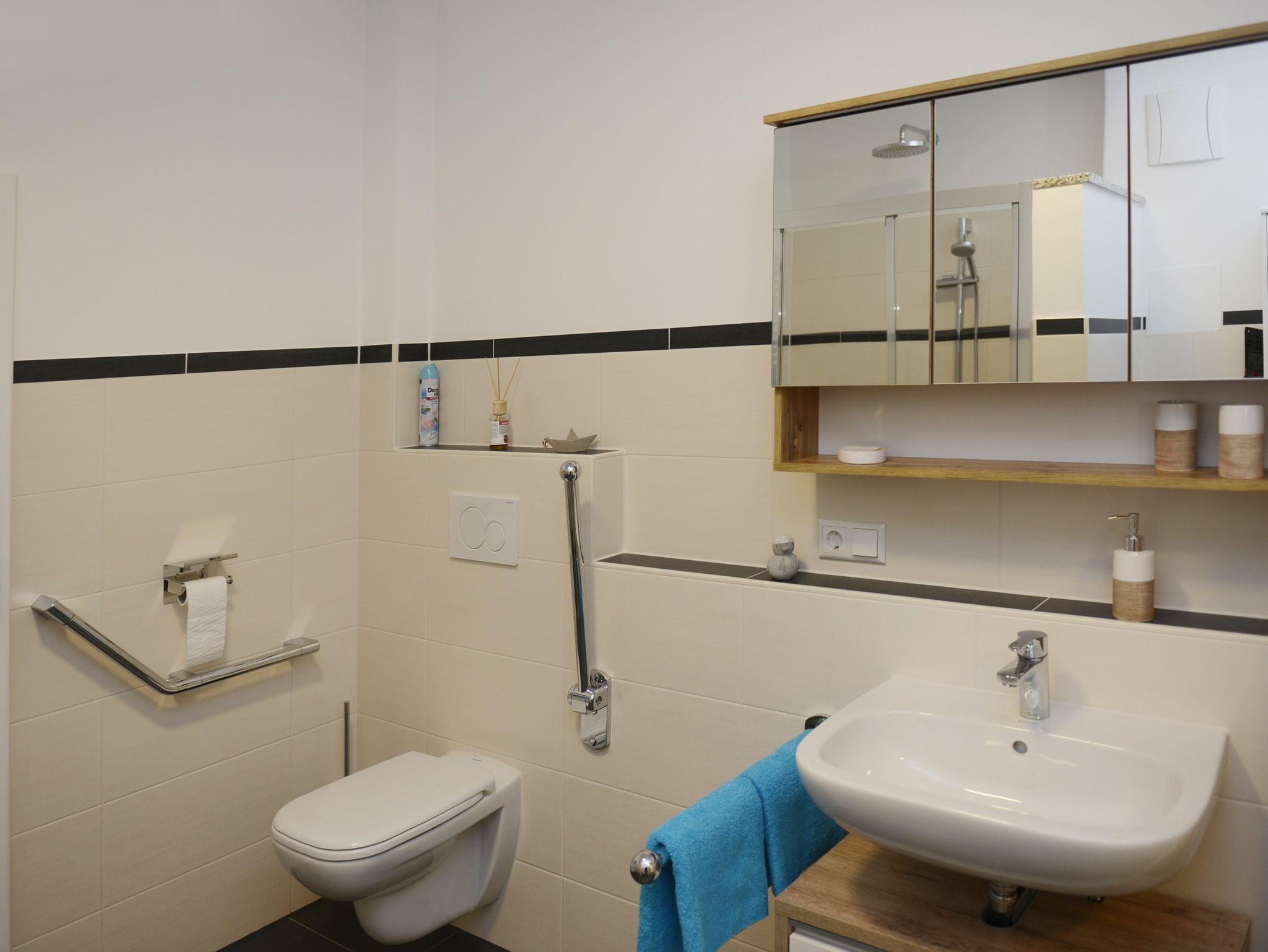 Wie schon mehrfach erwähnt, handelt es sich um eine barrierefreie und bedingt rollstuhlgerechte Wohnung. Hierzu gehört natürlich auch ein extrabreiter, barrierefreier Zugang zur Dusche, sowie Haltegriffe an der Toilette und dem Waschbecken.