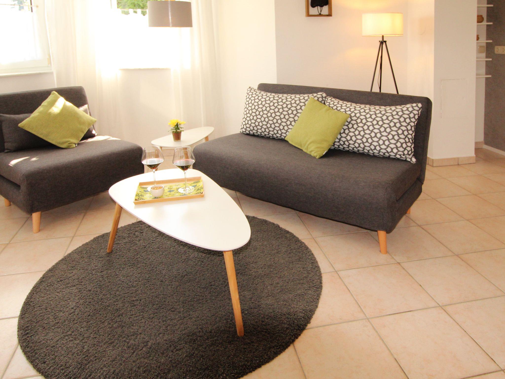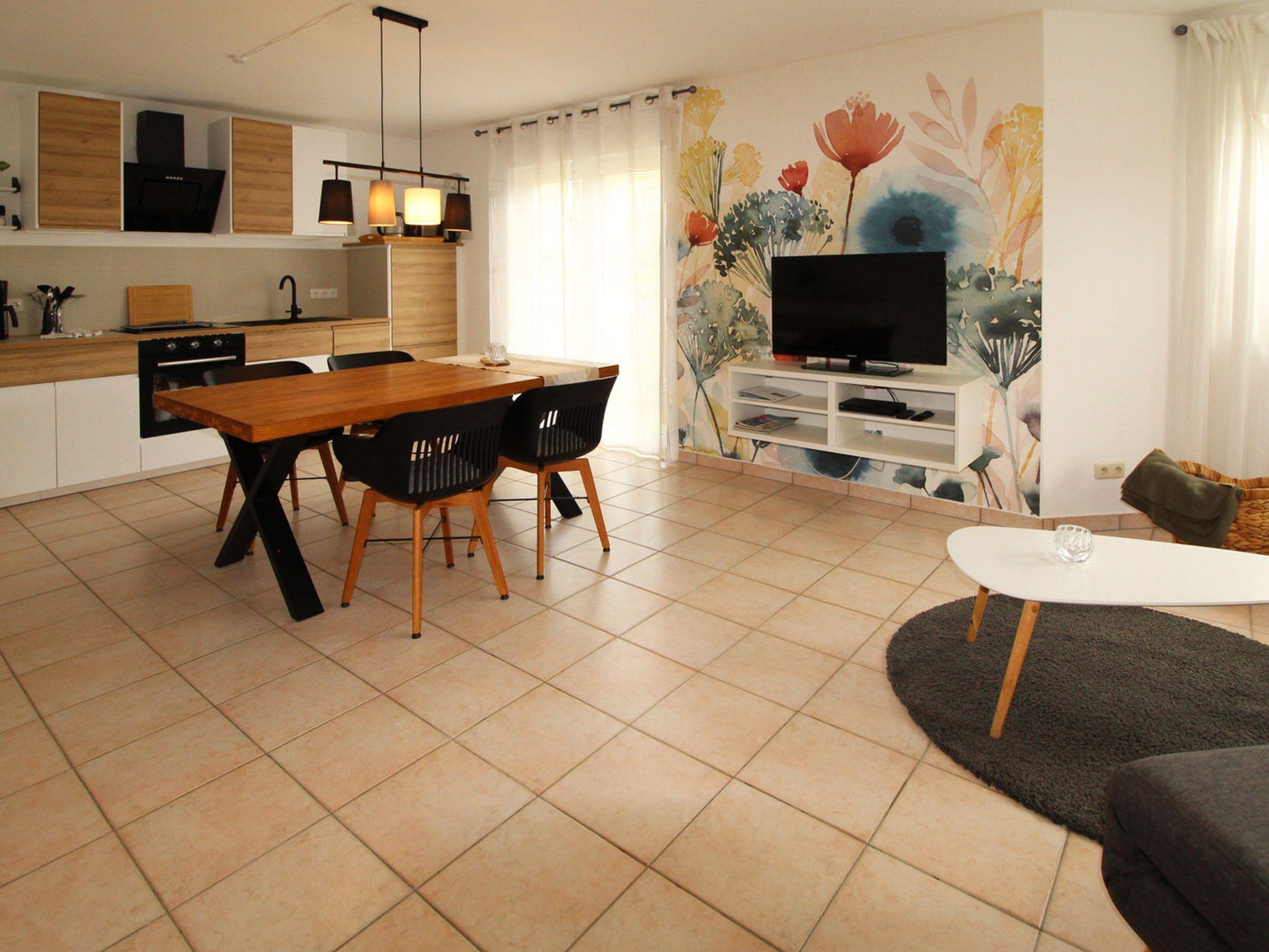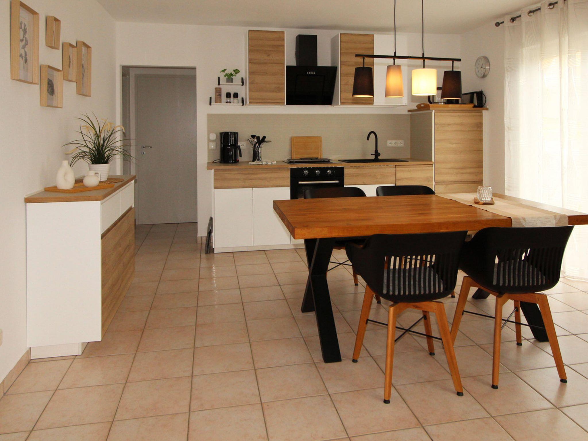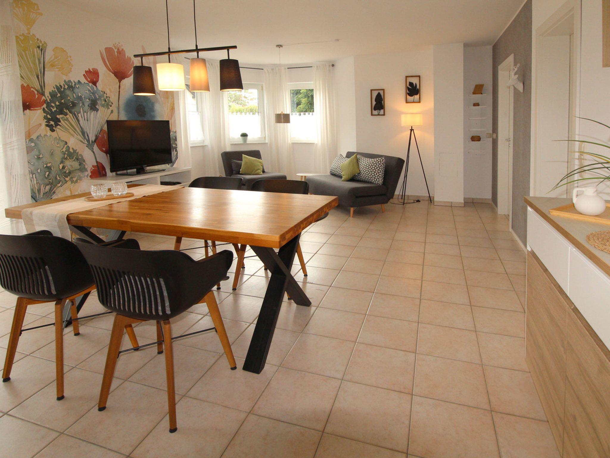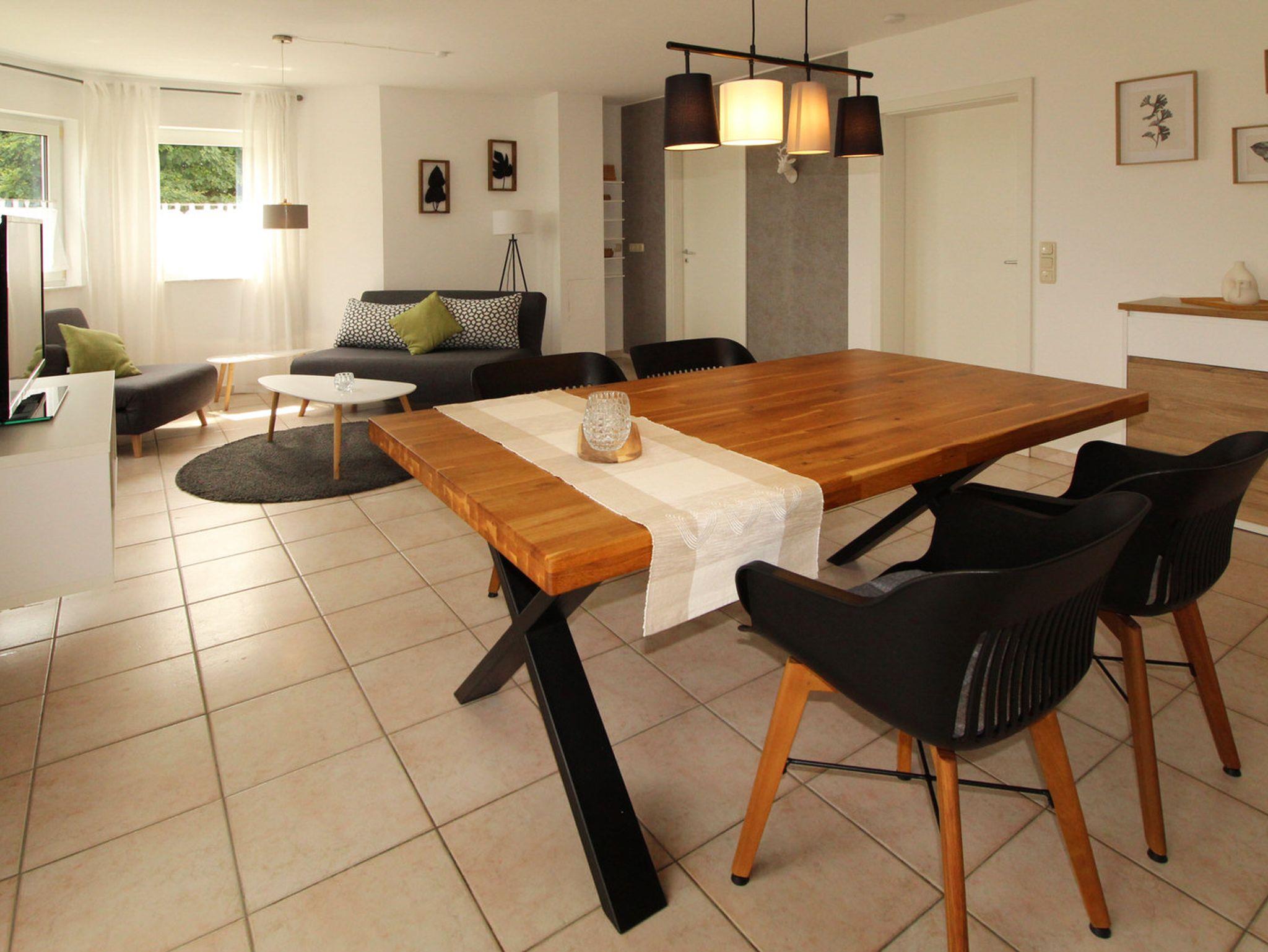 Zum gemütliche Beisammensein lädt die Wohnküche mit großzügigem Essbereich und das angrenzende Wohnzimmer ein. Das Sofa kann bei Bedarf zu zwei weiteren Schlafplätzen (1,50 m breit) verwandelt werden.