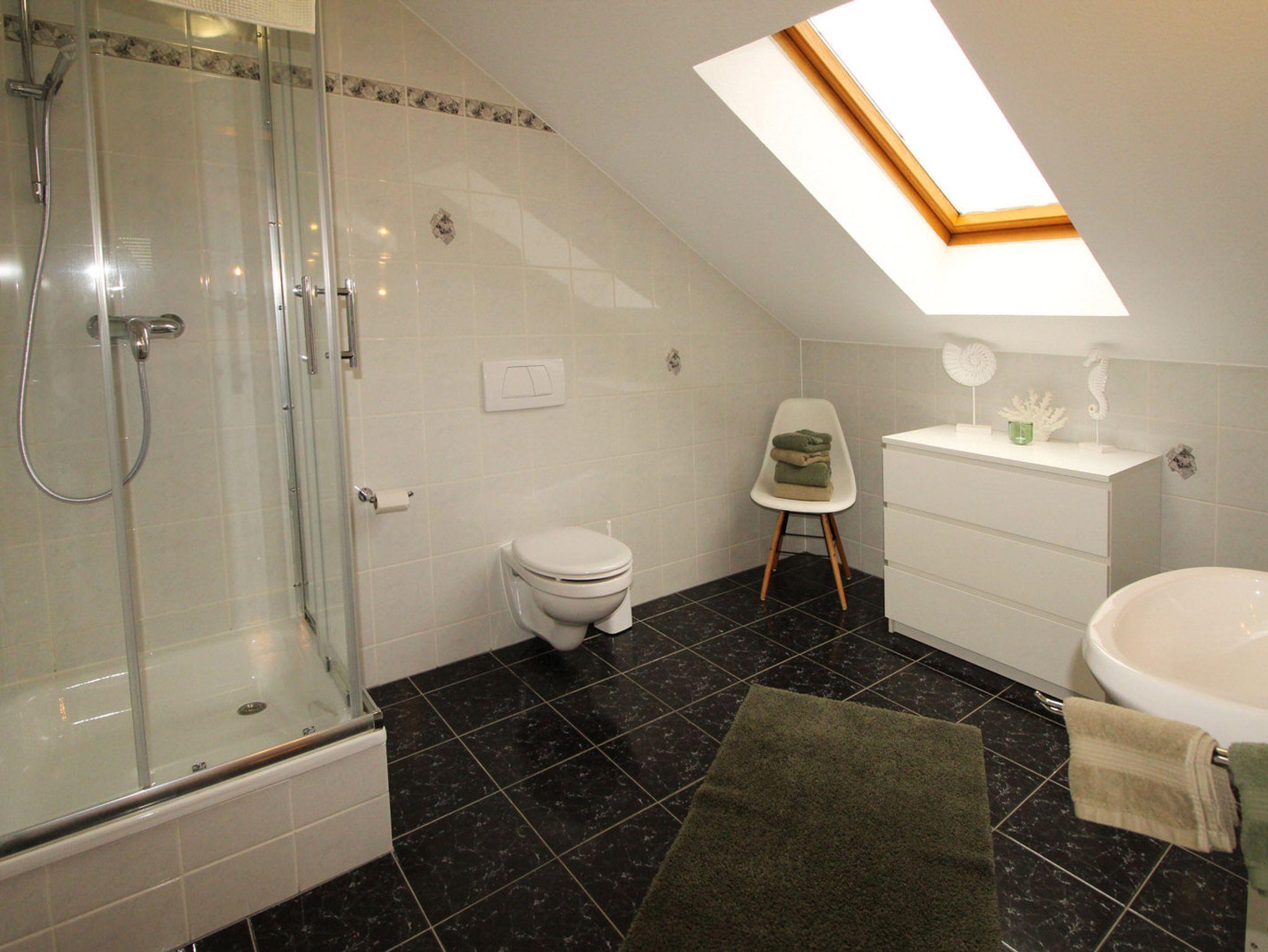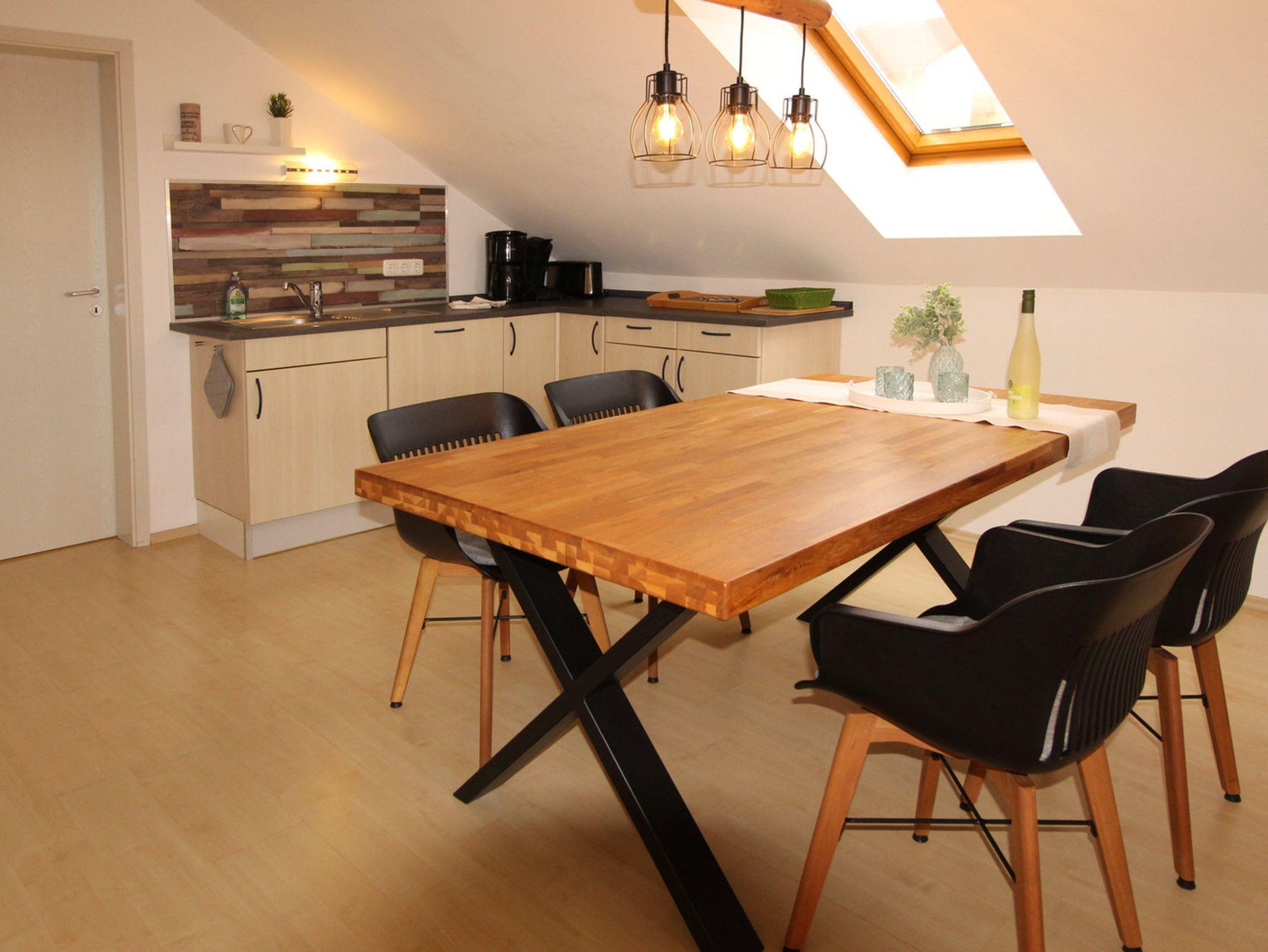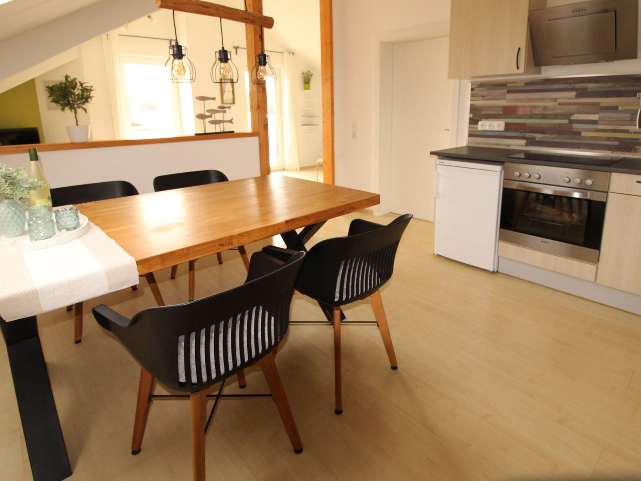 Die gemütlichen hohen Räume mit Dachschrägen laden mit einer Wohnküche und großzügigem Essbereich zum Beisammensein ein. Der Wohnbereich besteht aus 2 Bereichen. Einmal ein Fernsehbereich mit Sofa, TV-DVD/Blue Ray und einem separaten Bereich ebenfalls mit Sofa als gemütliche Lese- und Spielecke.