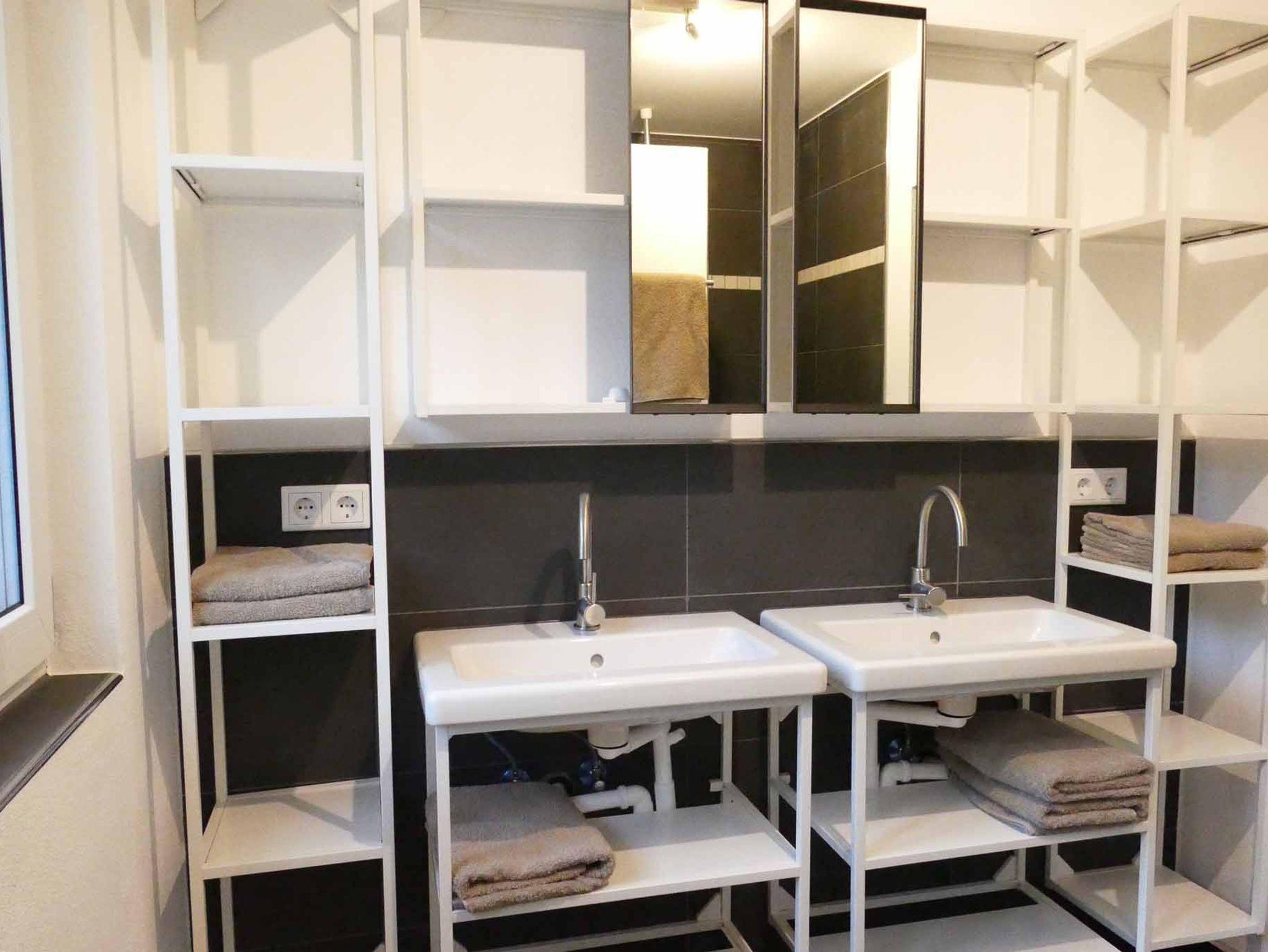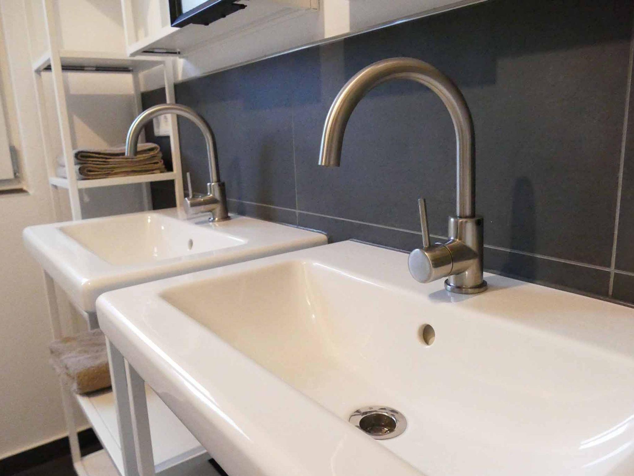 Die Tageslichtbäder sind mit Doppelwaschbecken, Dusche und WC ausgestattet.
