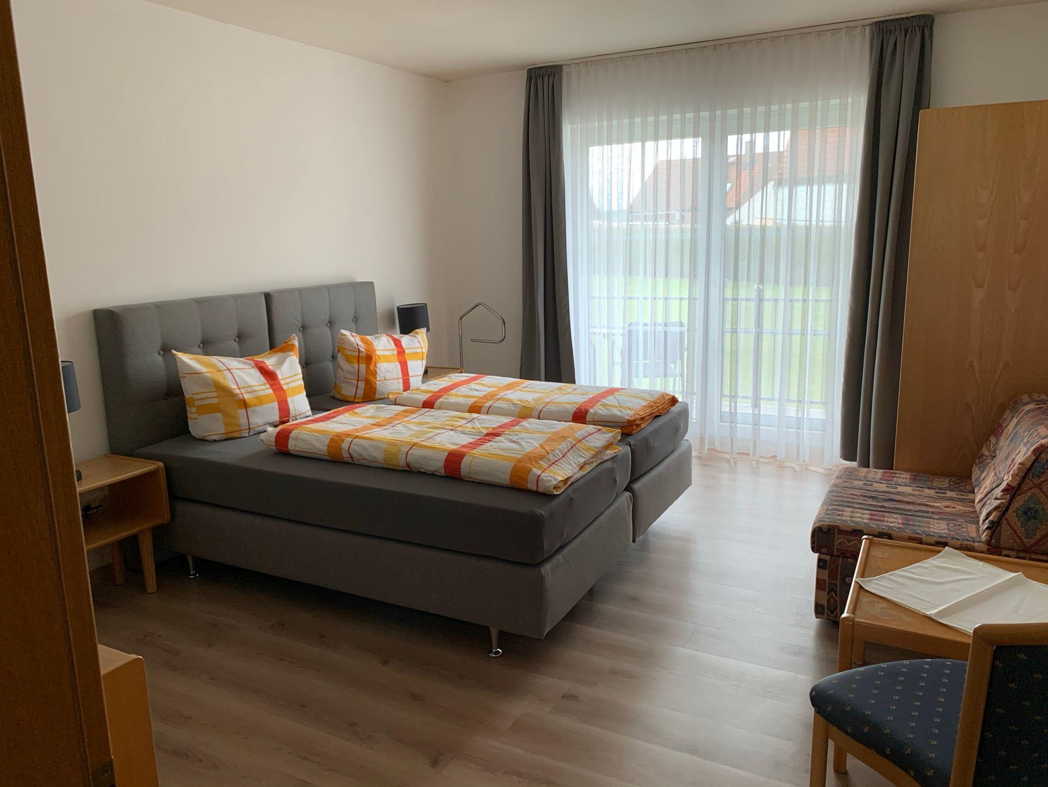 Dieses helle Komfort-Zimmer im 1. Obergeschoss bietet auf ca. 27?m² eine gemütliche Rückzugsmöglichkeit für erholsame Tage. Vom überdachten Südbalkon genießen Sie einen freien Blick auf den gepflegten Garten. Das private Badezimmer ist mit Dusche, WC und Haartrockner ausgestattet. Für Ihren Komfort stehen Ihnen ein Safe, SAT-TV, kostenfreies WLAN sowie ein Wasserkocher und ein Kühl-/Gefrierfach zur Verfügung. Das Zimmer ist allergikerfreundlich und ein reines Nichtraucherzimmer. Zur gemeinschaftlichen Nutzung stehen Grillplatz, Trampolin, Kinderspielplatz, Waschmaschine und Trockner sowie eine abschließbare Fahrradgarage mit E-Bike-Ladestationen bereit.