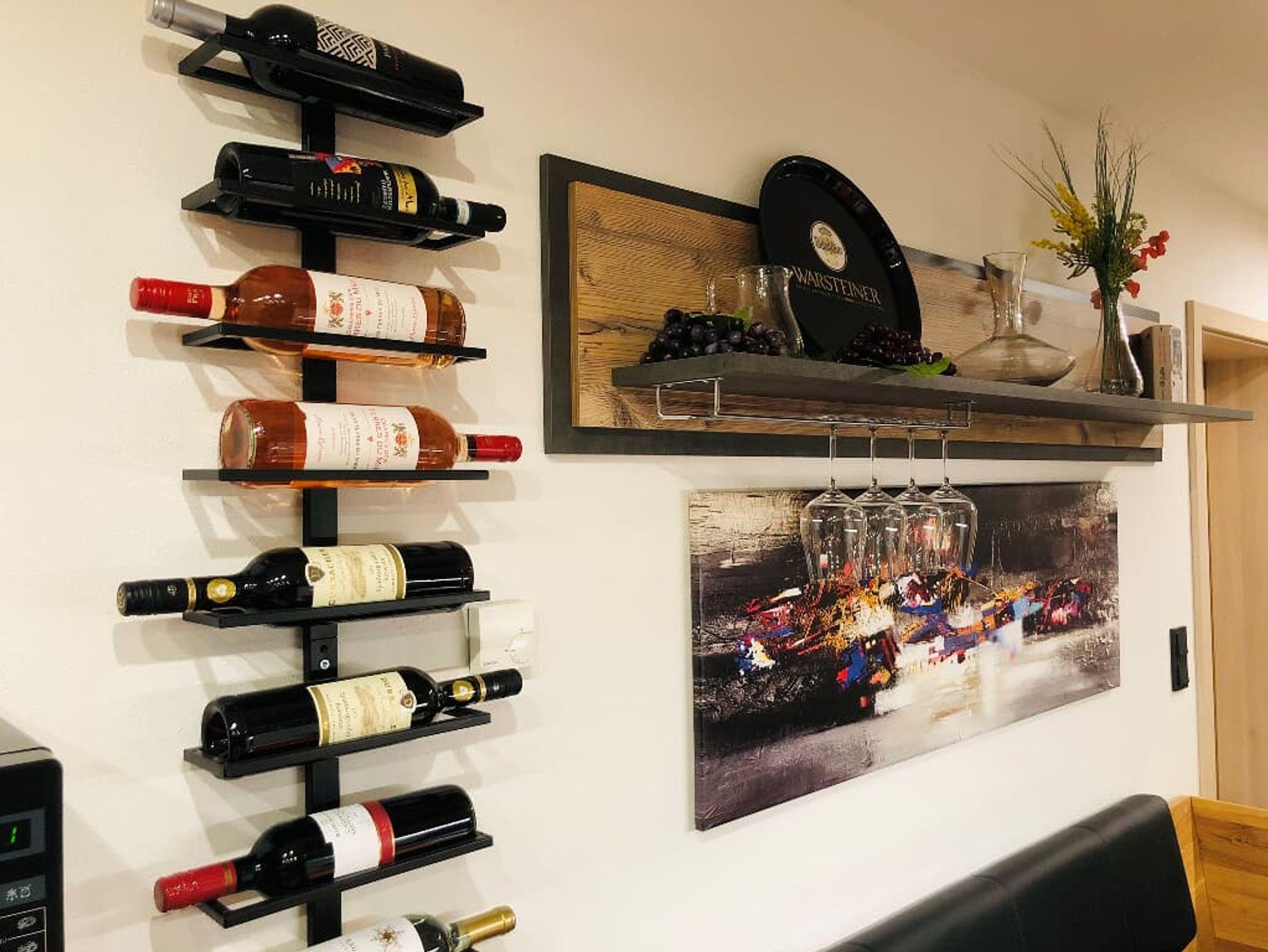 Der gemütliche Wohnbereich mit Kachelofen und „Weinregal“ mit edlen Weinen, lassen so manchen Abend auf der Terrasse besinnlich ausklingen.