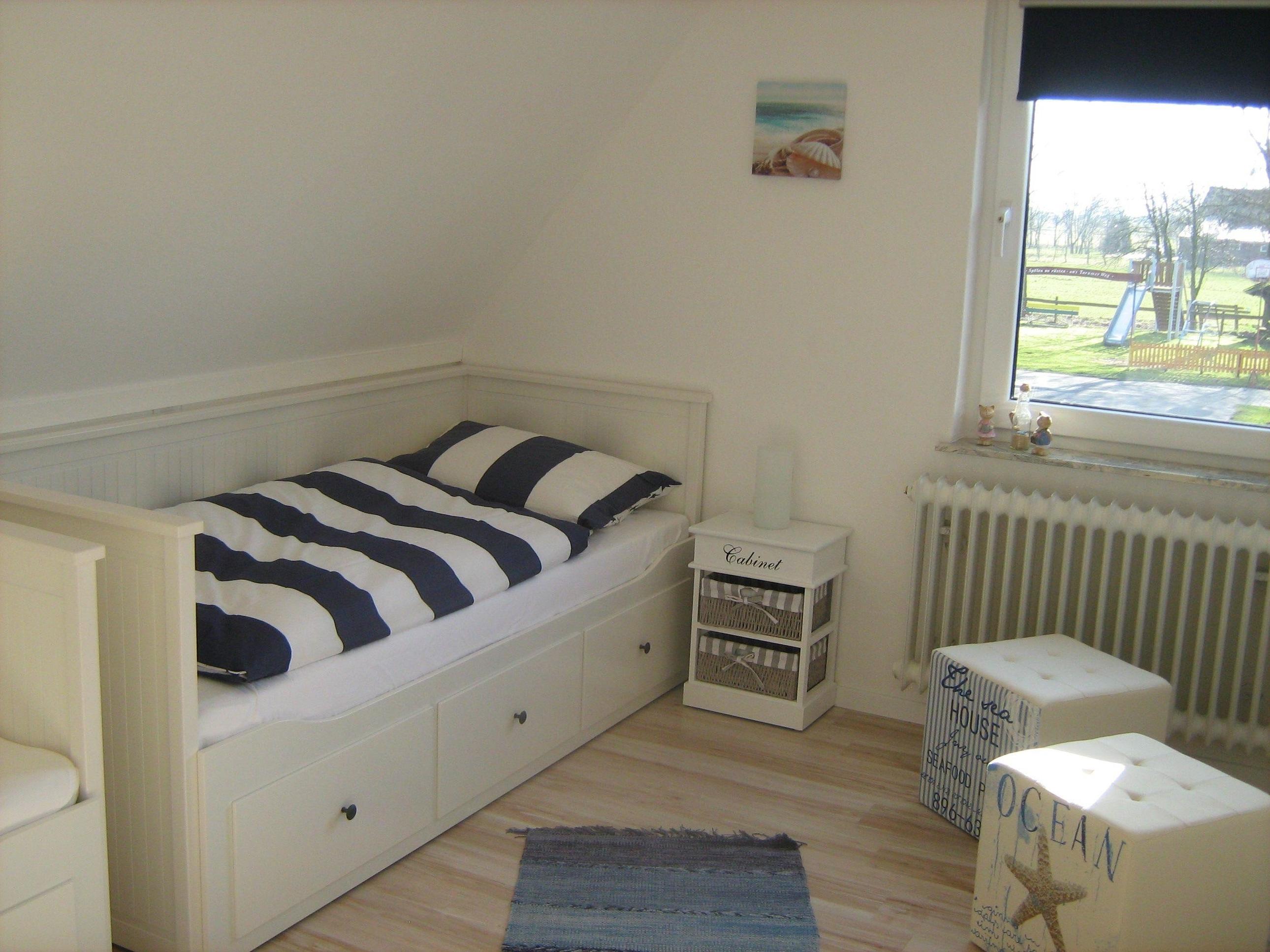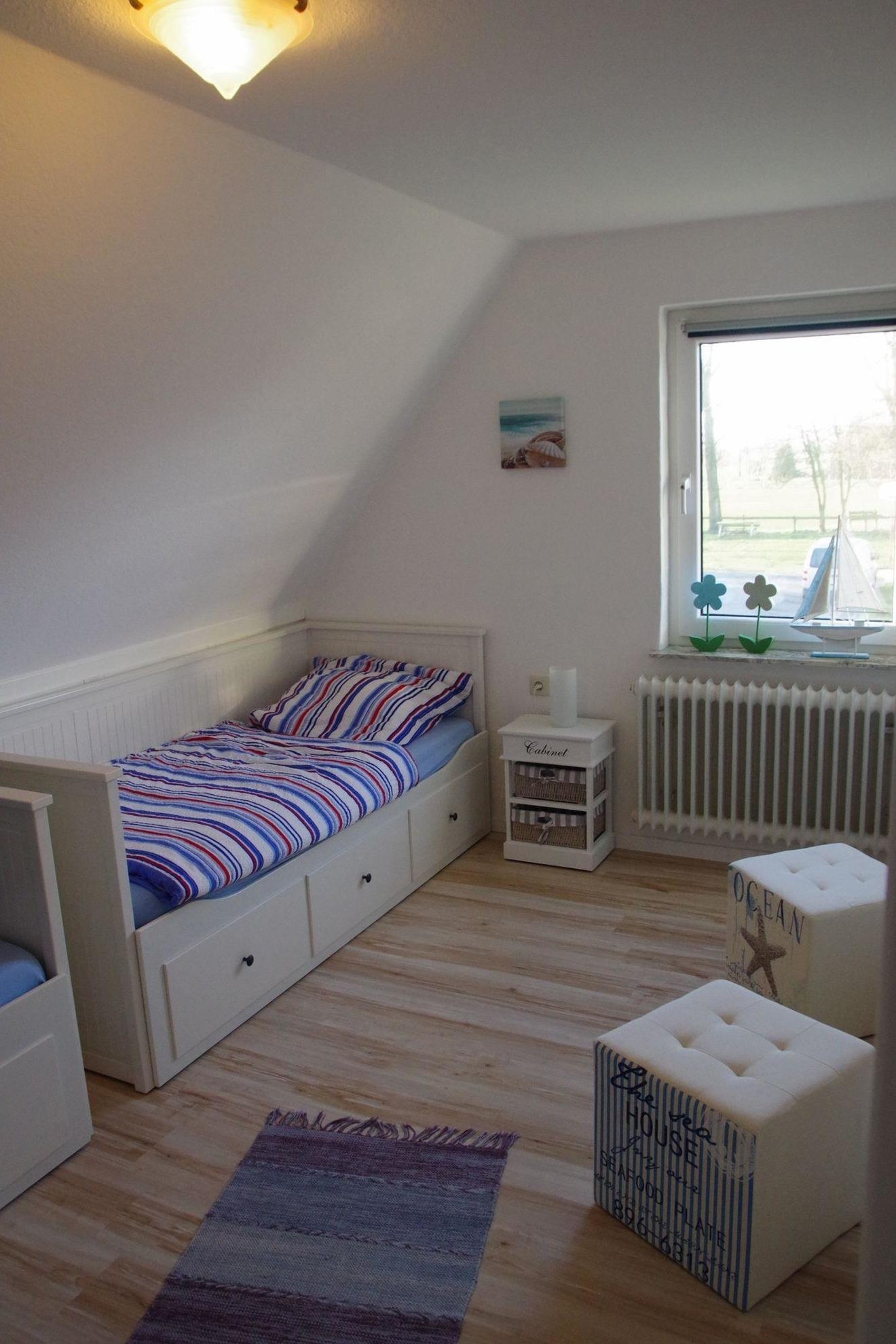 In dem zweiten Zimmer sind zwei einzelne Betten mit 80 cm Breite und für Kinder und Erwachsene geeignet. Auf Anfrage kann ein Bett zu einem 1,60 m Bett umgebaut werden. Somit können hier drei Personen schlafen.