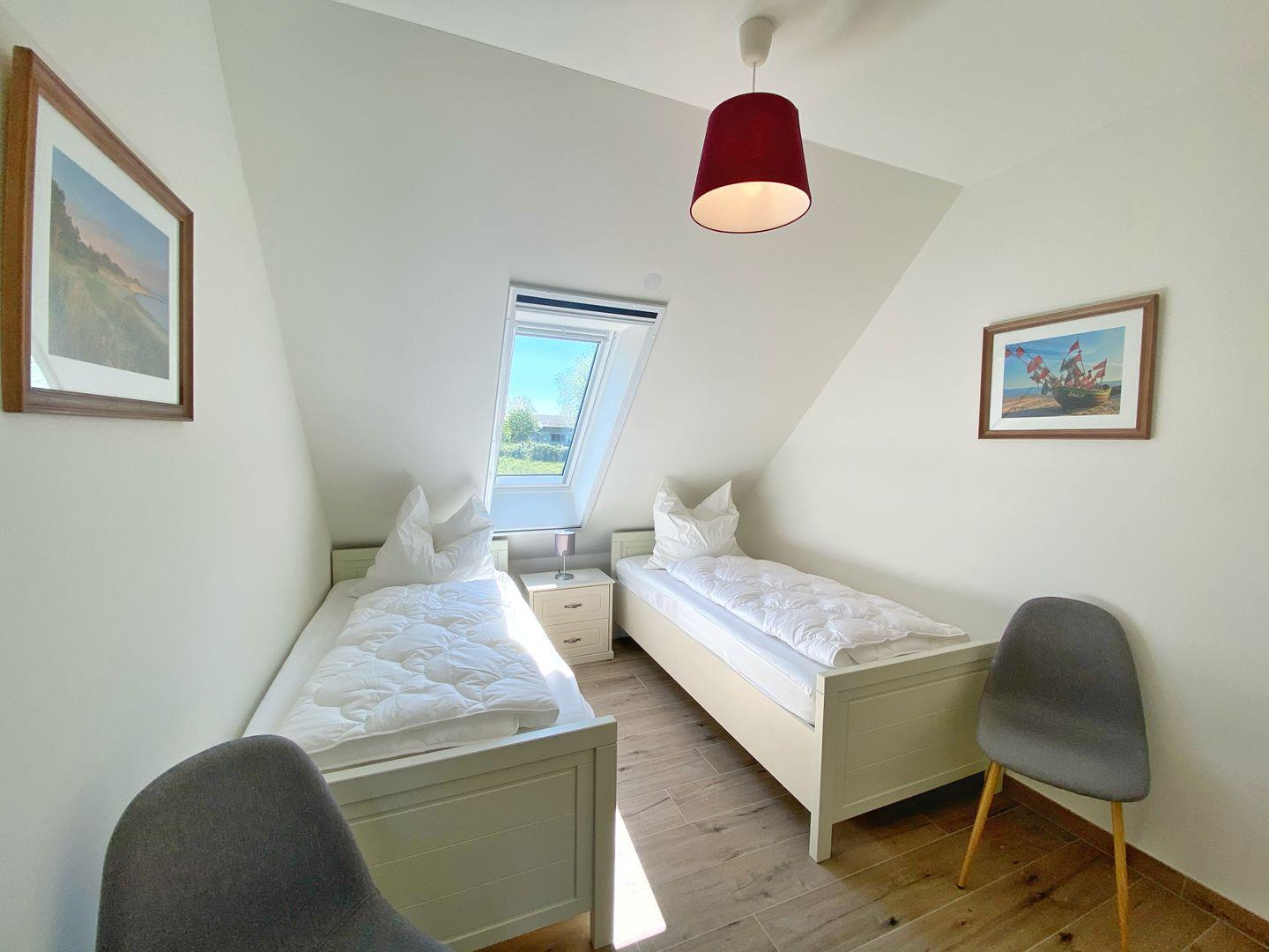 Die Wohnung bietet zwei separate Schlafzimmer, eines davon mit Doppelbett und das andere mit zwei Einzelbetten.
