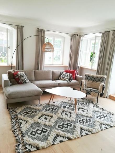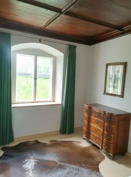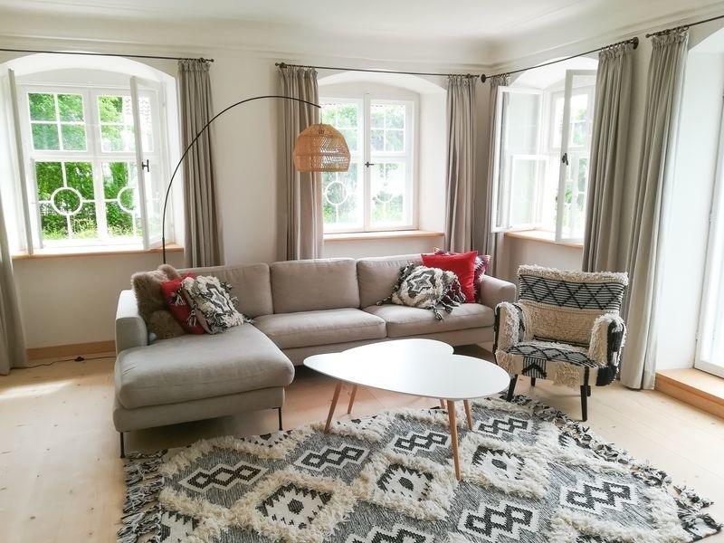 Das lichtdurchflutete Wohnzimmer besticht durch seine vielen historischen Kastenfenster, welche aufwendig restauriert wurden, um den geschichtsträchtigen Charakter des Hauses zu erhalten. Das großzügige Sofa und der schöne Blick in den umliegenden Garten sind beste Voraussetzungen dafür, entspannte Momente bei uns in Polling zu erleben. Ein zusätzliches Schlafsofa bietet neben dem Hauptschlafzimmer noch zwei weitere komfortable Schlafplätze.
