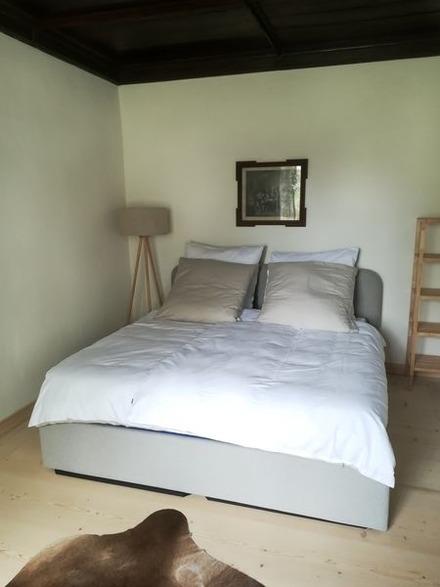 Das Schlafzimmer ist mit einem komfortablen Boxspringbett ausgestattet und bietet einen Blick ins Grüne. Bettwäsche und Handtücher sind inklusive. Die Deckenvertäfelung aus dem Jahre1803 verleiht dem Schlafgemach einen gemütlichen Charakter für entspannte Nächte. Für unsere kleinen Gäste steht ein Reisebett bereit.