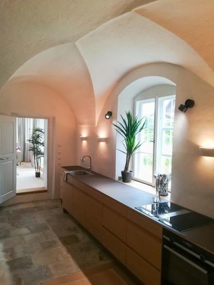 Die moderne, hochwertige und voll ausgestattete Wohnküche befindet sich in der ehemaligen Rauchküche und beeindruckt durch ihr bemerkenswertes Gewölbe und den originalen, historischen Steinboden. Im Bereich der ehemaligen Rauchhaube ist eine gemütliche Sofaecke entstanden, welche neben der modernen Essecke zum Verweilen einlädt.