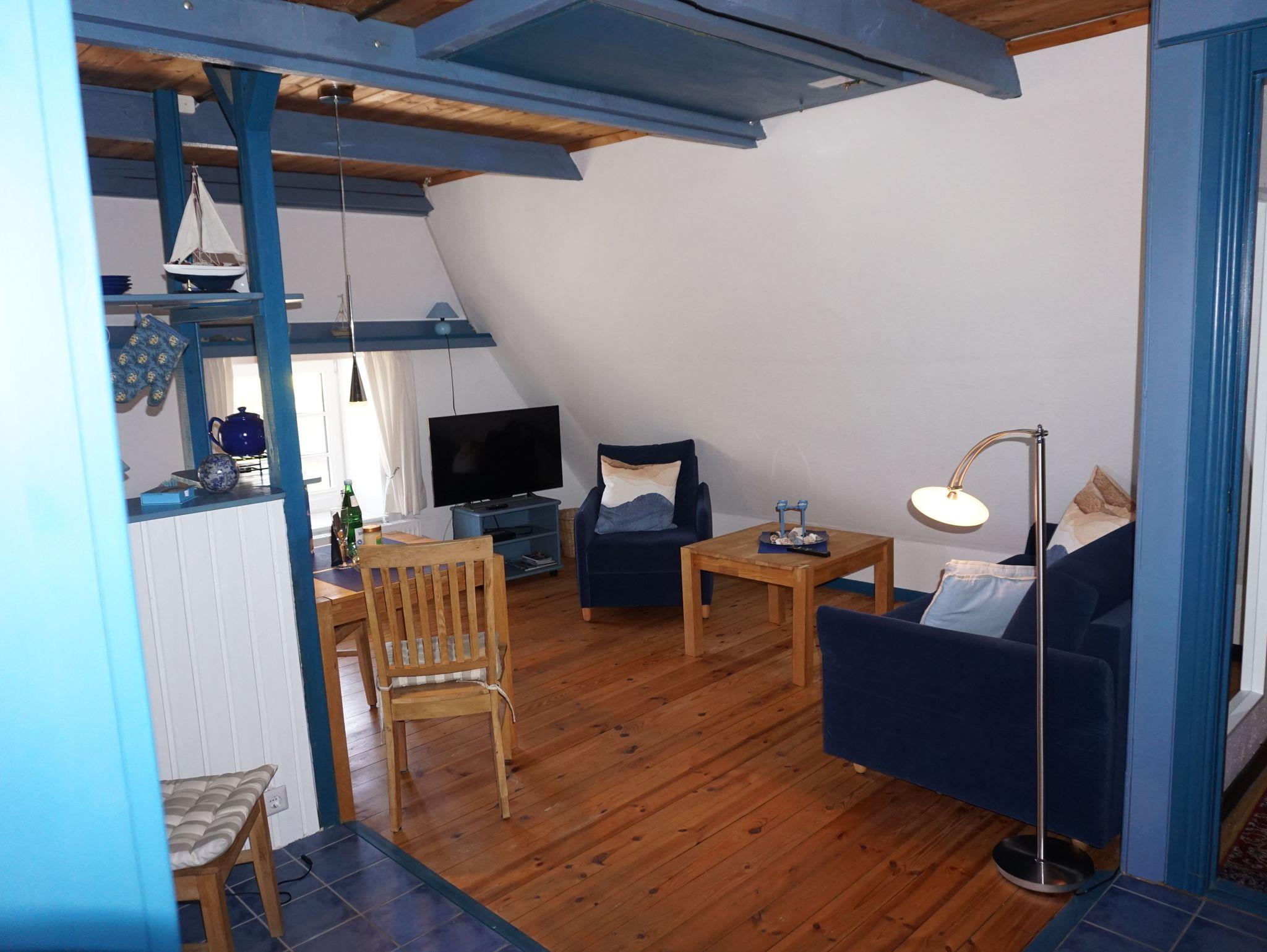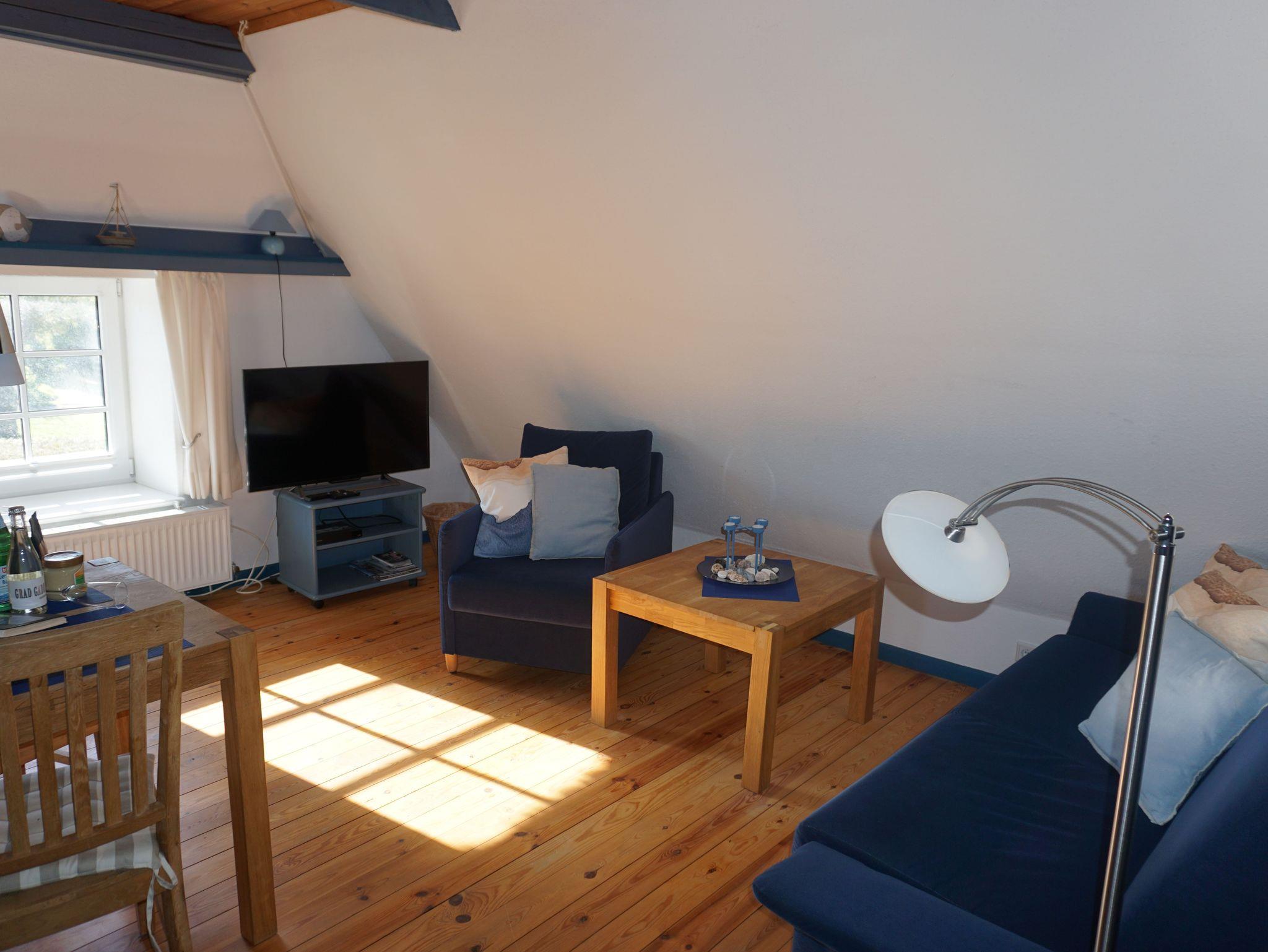 Die Ferienwohnung Zum Leuchtturm (50qm) befindet sich im Obergeschoß des wunderschönen Reetdachhauses und ist für bis zu 2 Personen voll ausgestattet.