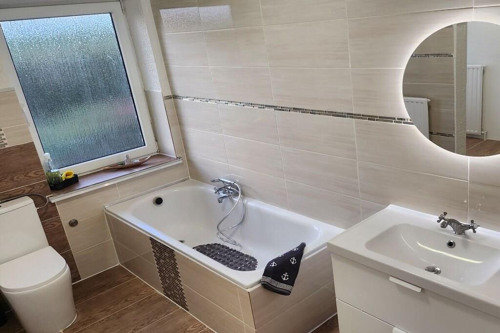 Stue med satellit-tv, radio, sofa, fuldt udstyret stort køkken med køleskab, fryser, kaffemaskine, brødrister, elkedel, mikroovn, blender. Det første soveværelse har en 2×2m dobbeltseng med to madrasser. Det andet soveværelse har en seng med en gennemgående 160×200m Badekar og rummelig bruser Fra stuen er der direkte adgang til en stor terrasse med siddepladser og grill. Gratis parkering på stedet i carport.