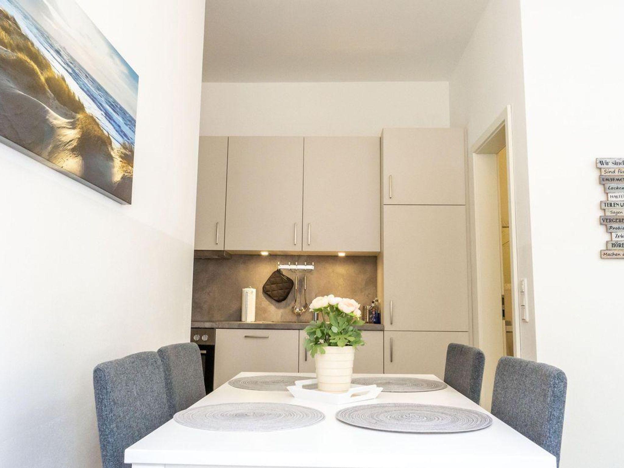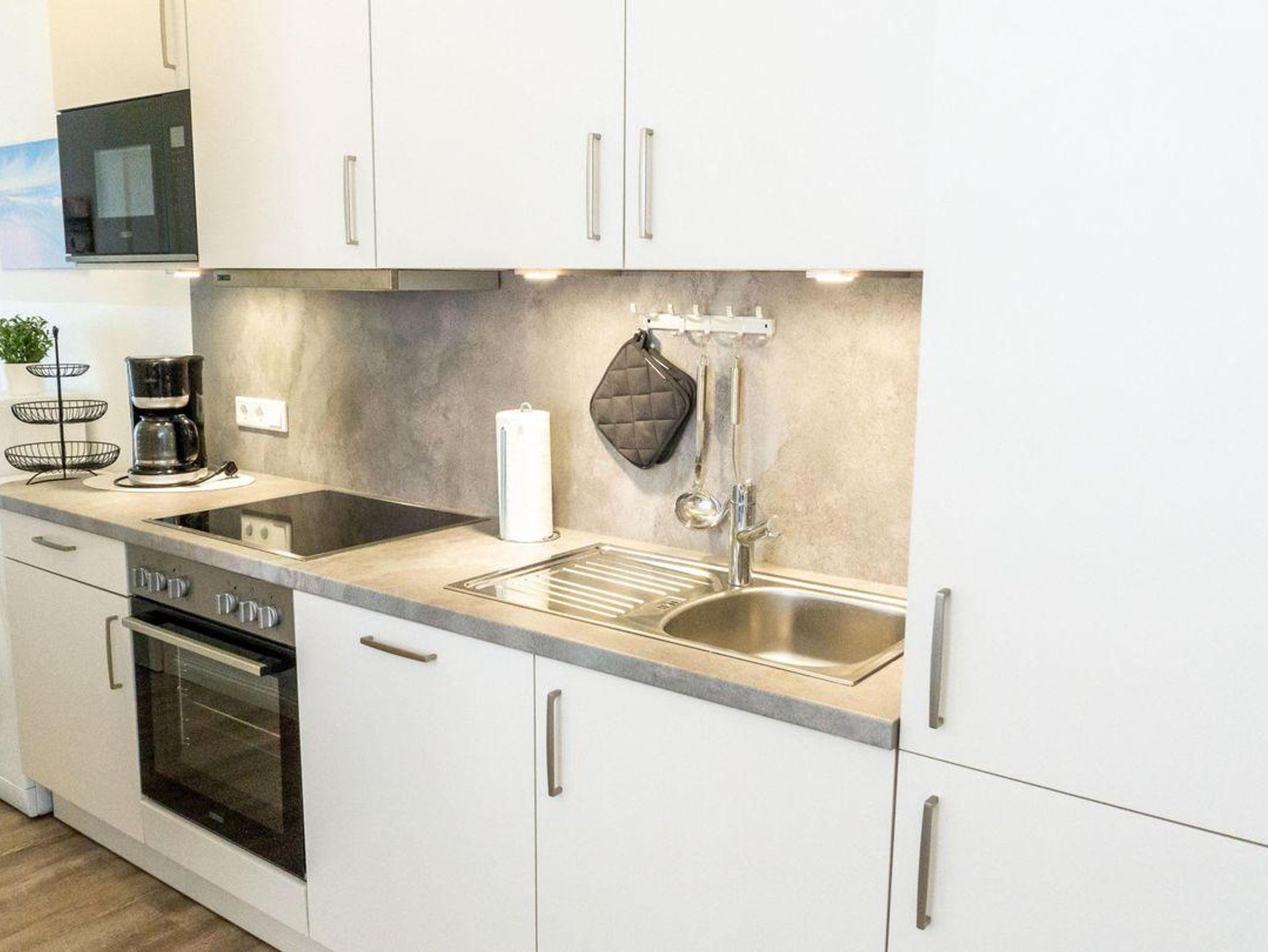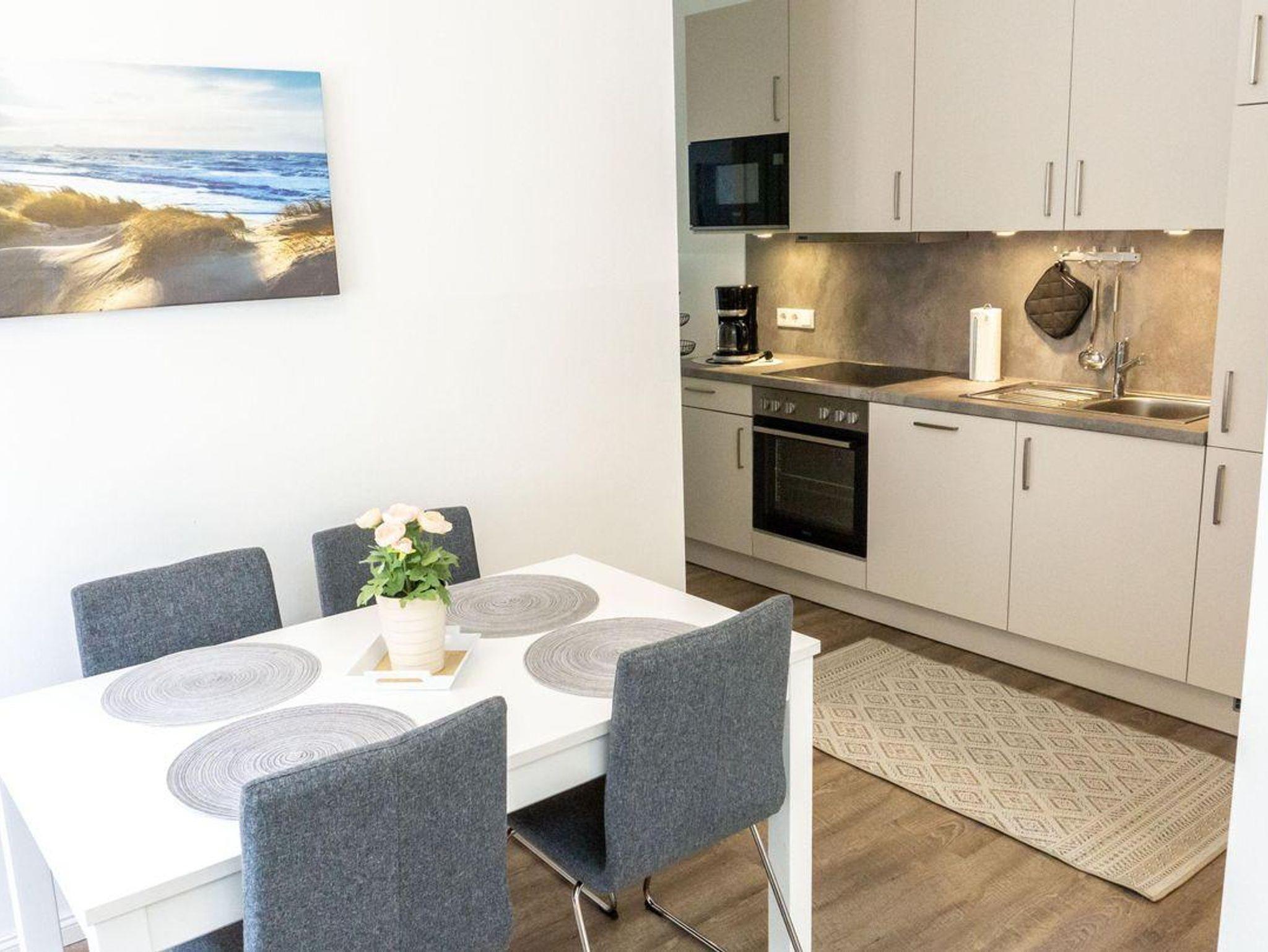 Das offene Wohnkonzept verbindet die vollständig ausgestattete Küche mit dem Wohn- und Essbereich. Hier finden Sie einen großzügigen Essplatz, eine Sofaecke und einen modernen Sat-TV (44 - 55 Zoll) mit internationalen Kanälen – ideal für gemeinsame Abende. Die Küche lässt keine Wünsche offen: Ceranherd, Backofen, Mikrowelle, Kühlschrank mit Gefrierfach, Spülmaschine, Kaffeemaschine, Wasserkocher, Toaster, Sandwich-Toaster sowie umfangreiche Küchenutensilien stehen zur Verfügung. Selbst an Details wie Geschirrhandtücher und Gewürze wurde gedacht. Ein Brötchenservice ist für einen entspannten Start in den Tag verfügbar.