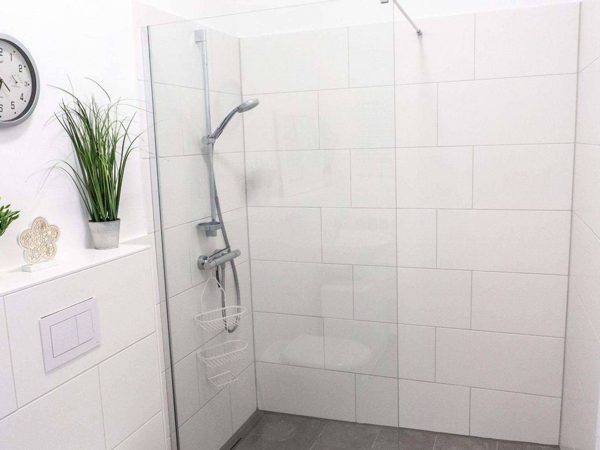 Das Bad ist mit einer bodentiefen Dusche, Handtüchern, Badetüchern, Haartrockner, Waschbecken und Spiegel hochwertig ausgestattet.
