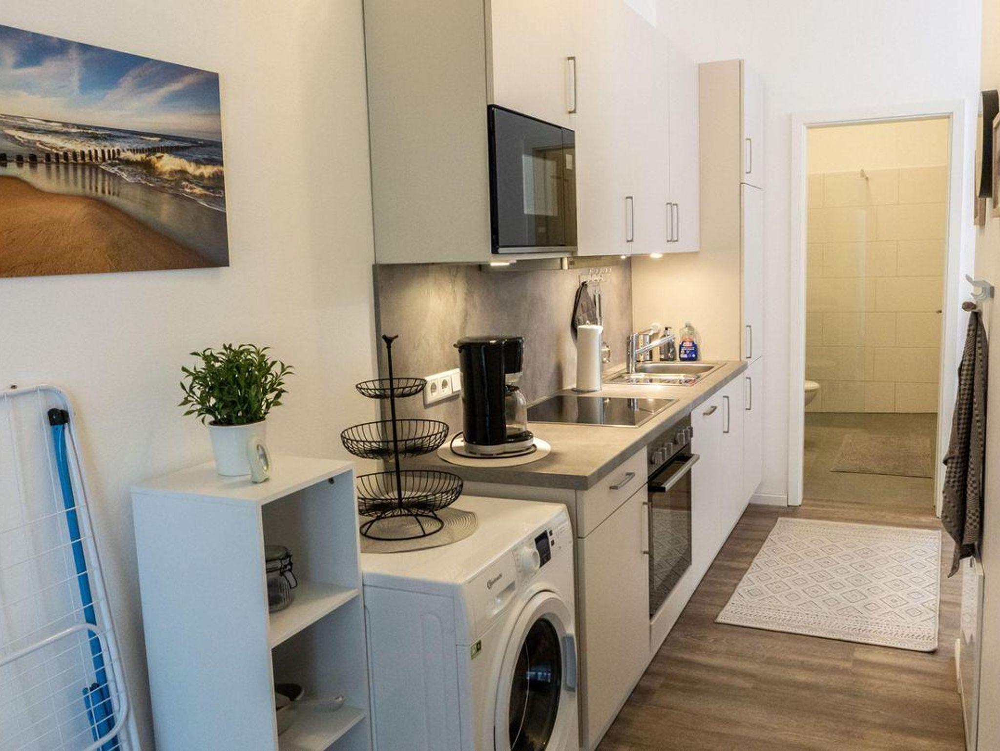 Waschmaschine (Eigennutzung), Trockner (gemeinschaftlich) und Wäscheständer bieten zusätzlichen Komfort für längere Aufenthalte.