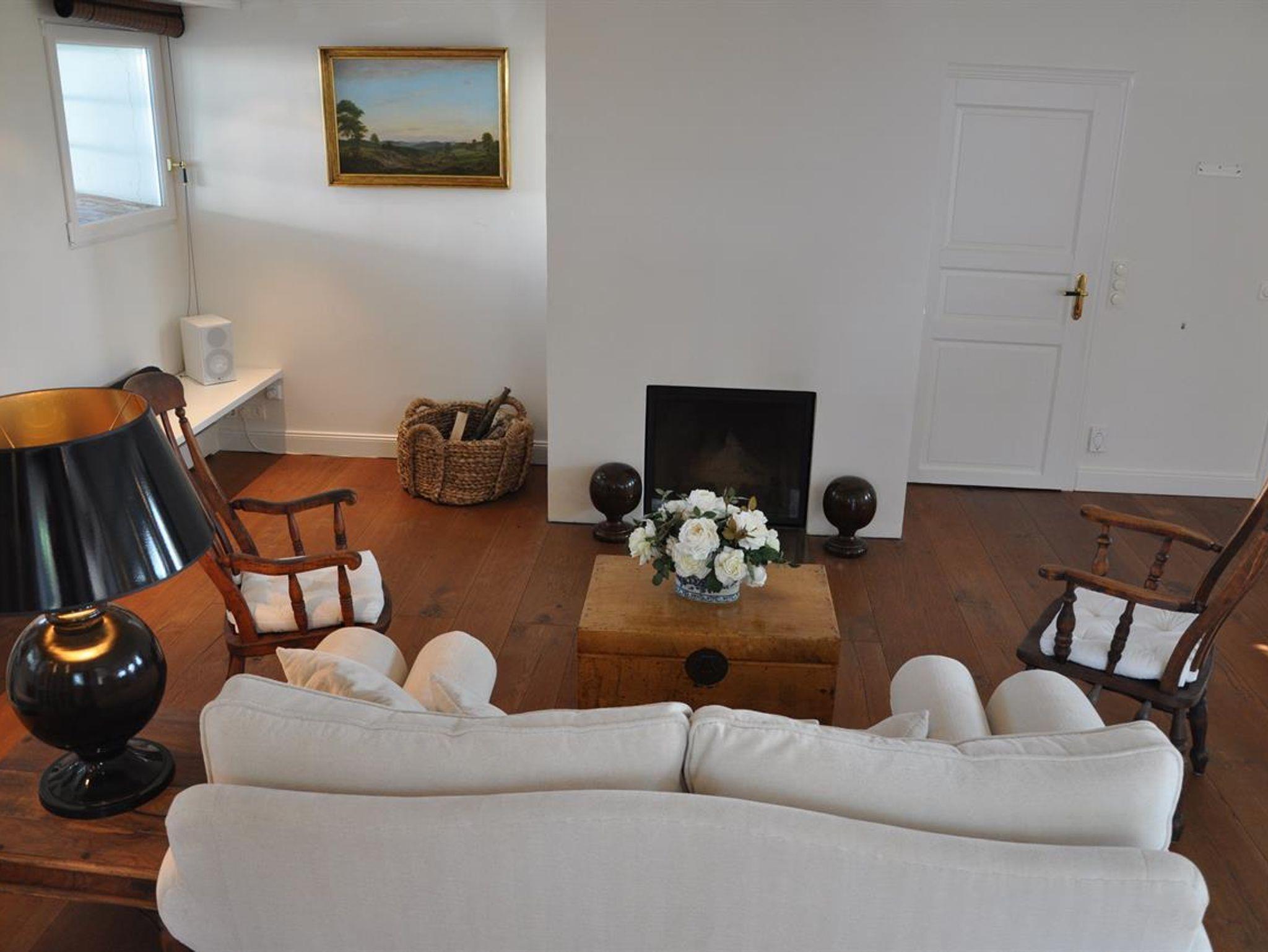 Großzügiger Wohnraum mit Schloßdielen und Kamin. Neben der separaten, vollausgestatteten Küche erwarten Sie ein wohnliches großes Schlafzimmer mit Doppelbett, Sofa, Leseecke, SAT-TV, Internetradio und einer HiFi-Anlage.