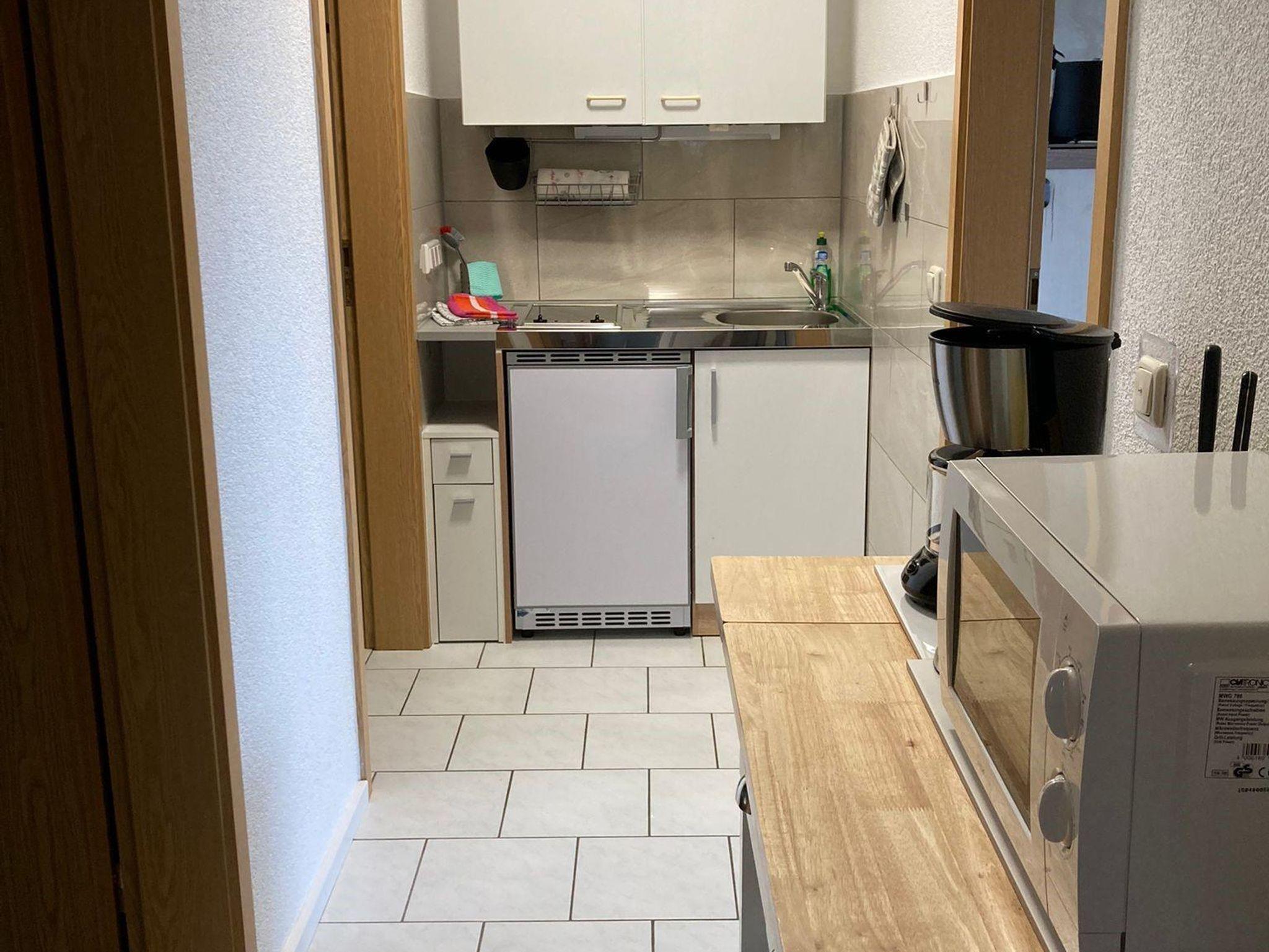 Waschgelegenheit, Bad mit Dusche/WC und eine komplett eingerichtete Küchenzeile sowie