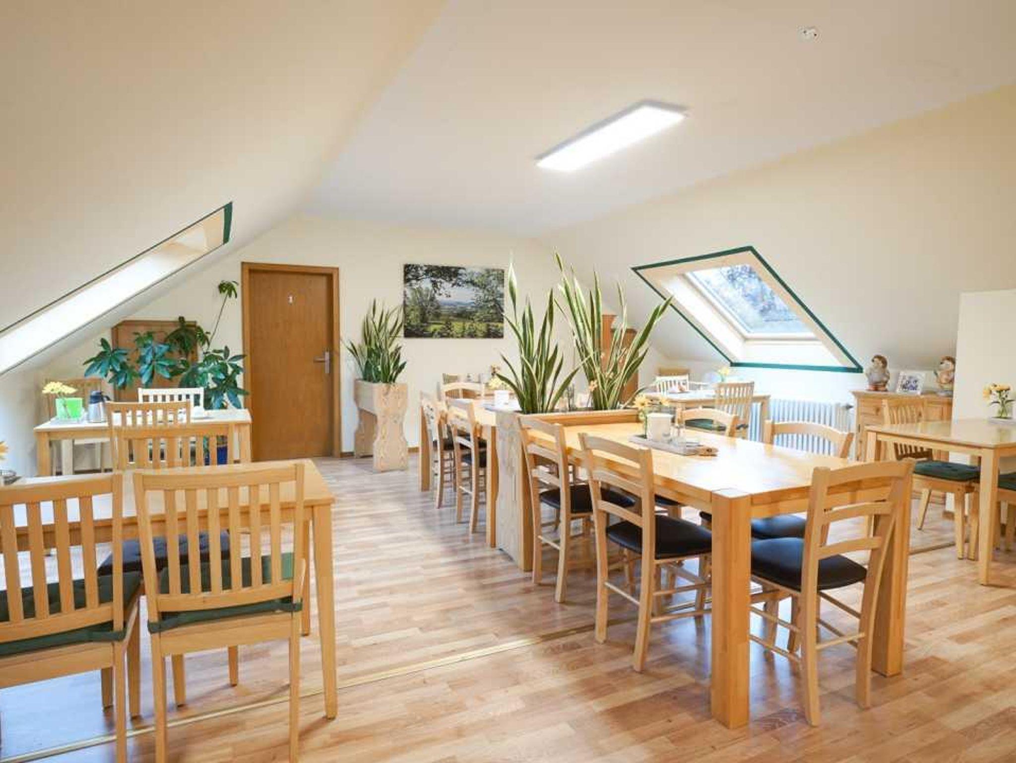 Ein reichhaltiges mit regionalen Produkten bestücktes Frühstück können Sie im gemeinschaftlichen Aufenthaltsraum in aller Ruhe zu sich nehmen. Dort finden Sie auch eine Teeküche, einen Kühlschrank mit Getränken, Gesellschaftsspiele und eine kleine Bibliothek, die Sie gerne benutzen dürfen. Gute Restaurants finden Sie in unmittelbarer Nähe des Hotels im Ort Poppenhausen.