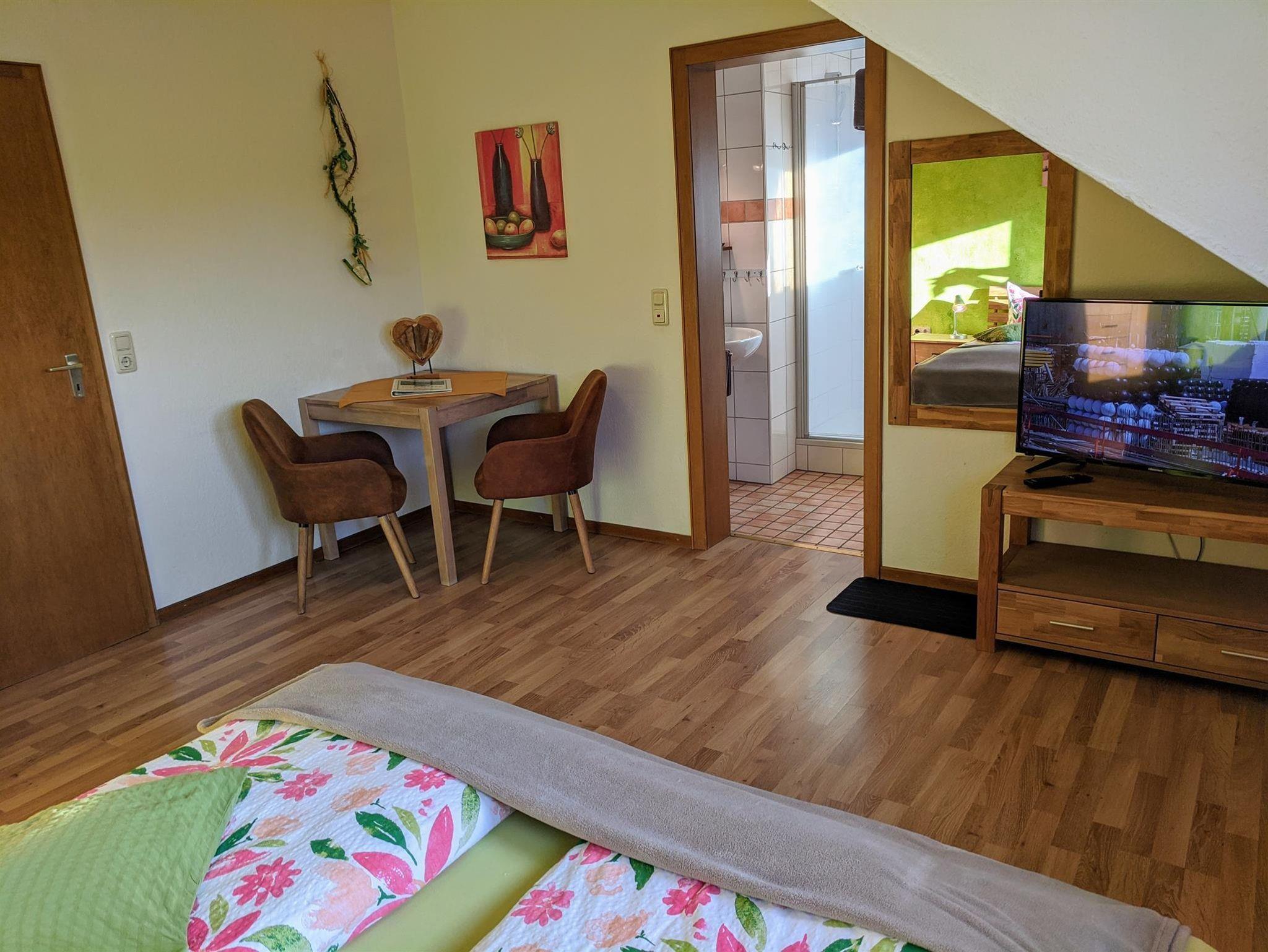 Unsere Doppelzimmer sind gemütlich eingerichtet mit einem kleinen Tisch und zwei Stühlen, sowie einem großen Flachbild - TV.