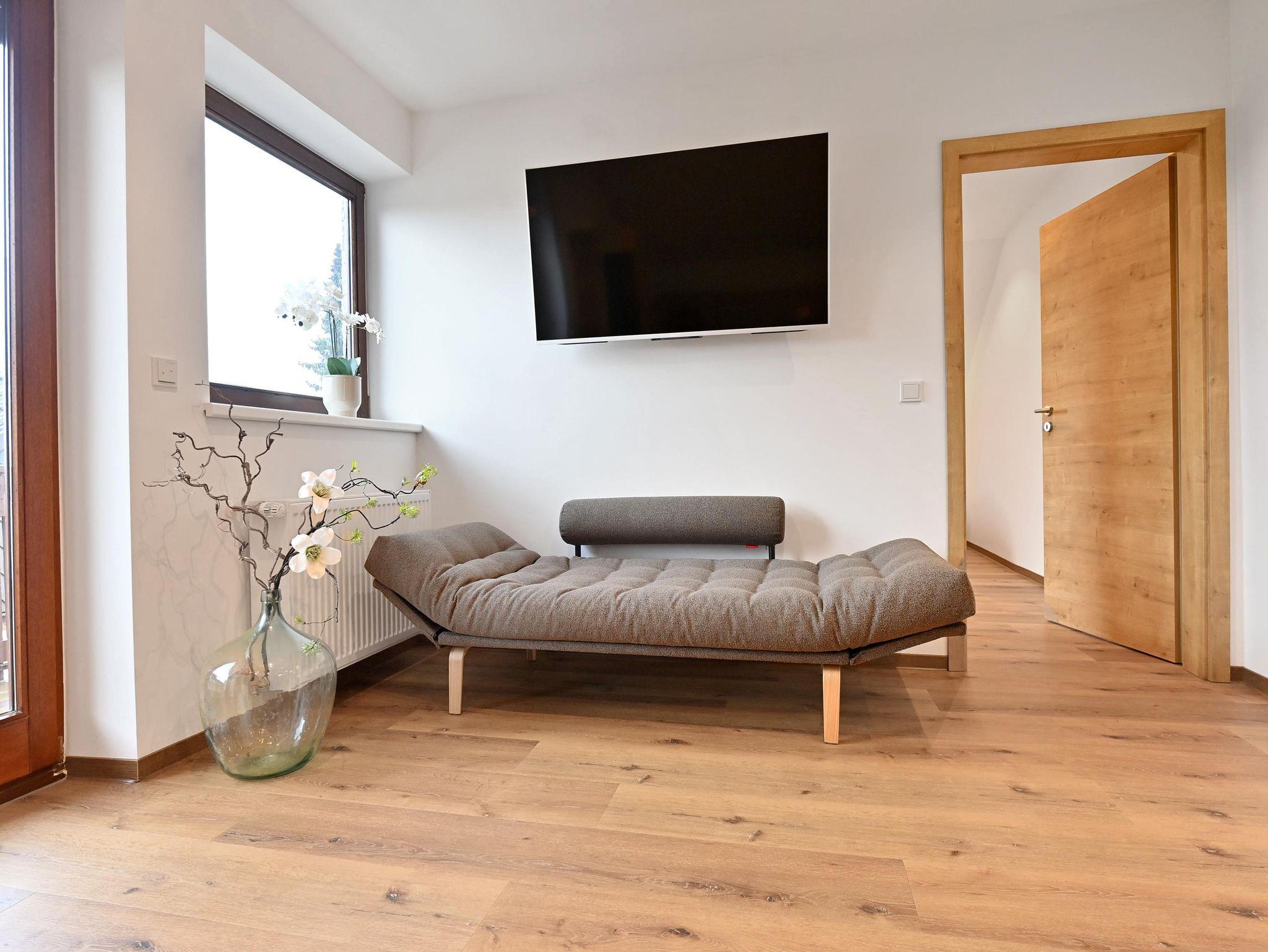 Vom restlichen Garten getrennt, liegt die Panoramasauna, mit Duschen, Ruhehütte und der dazu gehörigen Liegewiese. Diese steht ab der Wintersaison 2025/26 zur Verfügung. Aktuell können unsere Gäste unsere Sauna ca.200m von der Unterkunft entfernt nutzen.