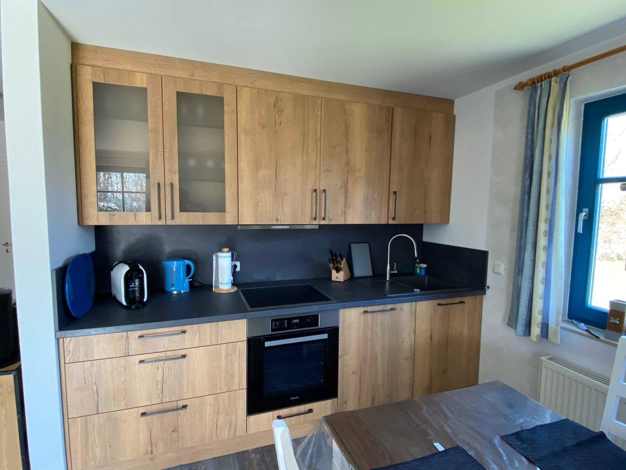 Küche mit Essecke und kompletter Ausstattung, E-Herd/Backofen, Mikrowelle, Geschirrspüler, Töpfe, Geschirr, Gläser etc.