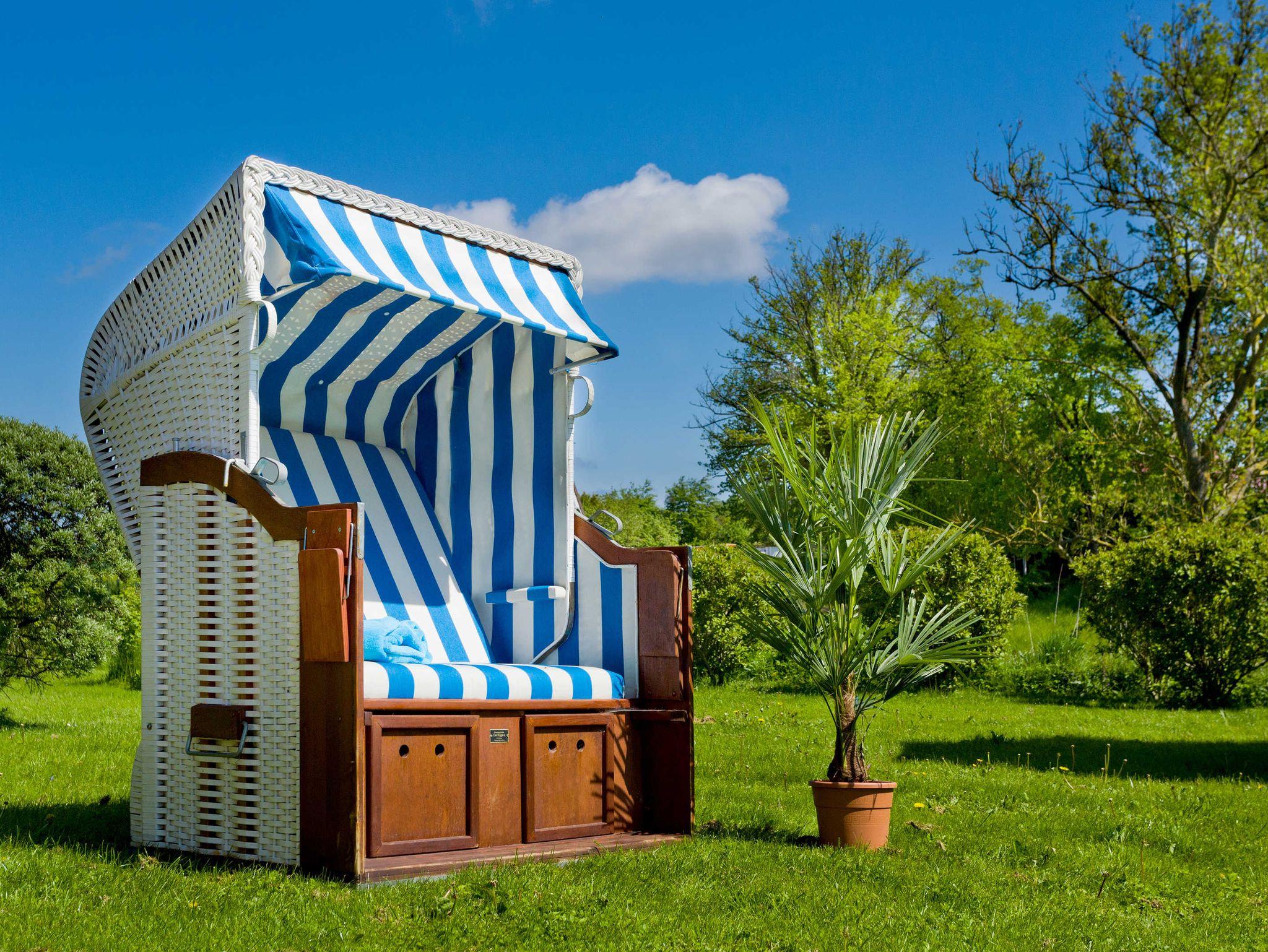 Die Terrasse ist ausgestattet mit Gartenmöbeln, Liegen, Sonnenschirm und eigener Strandkorb inklusive