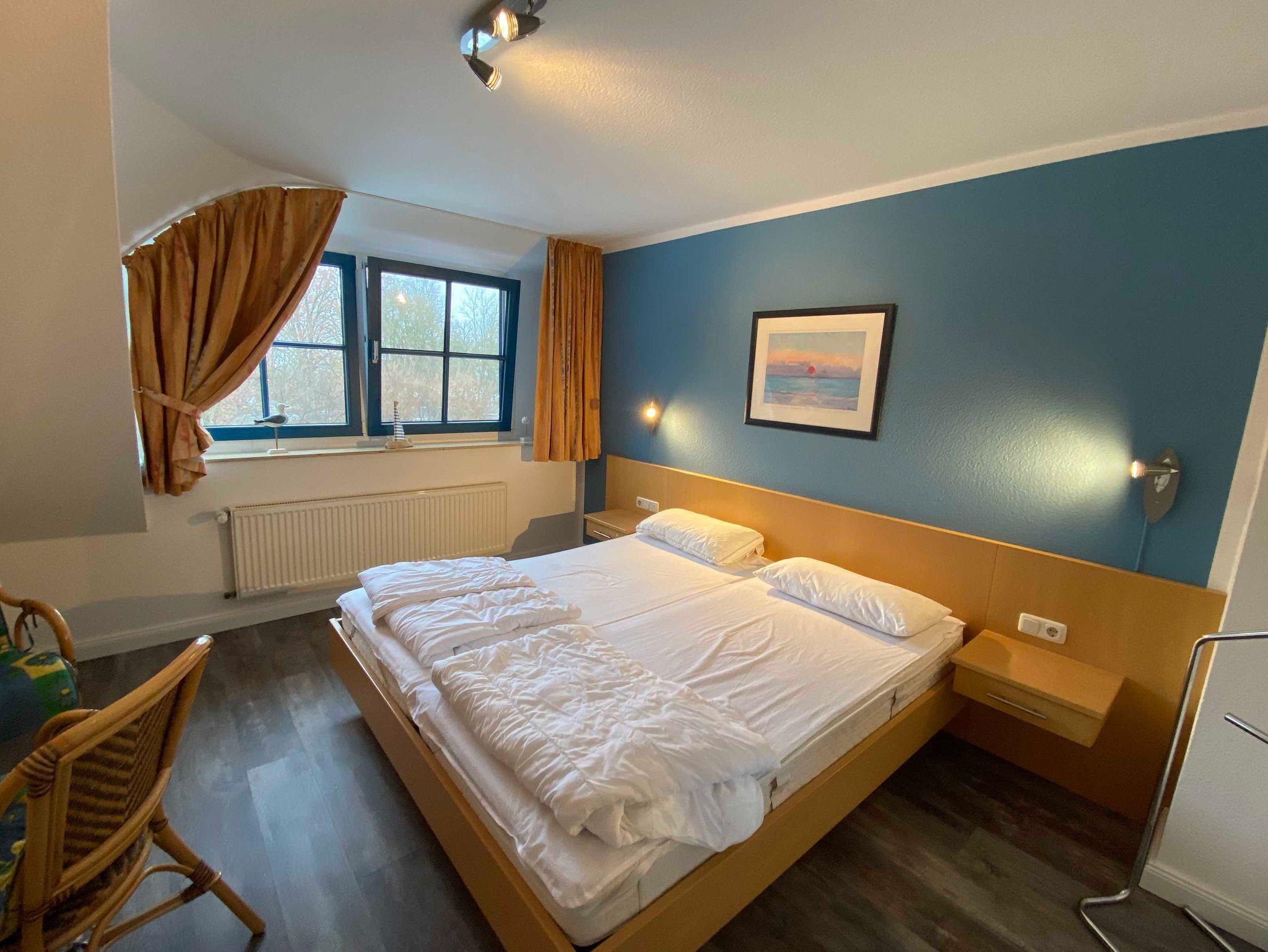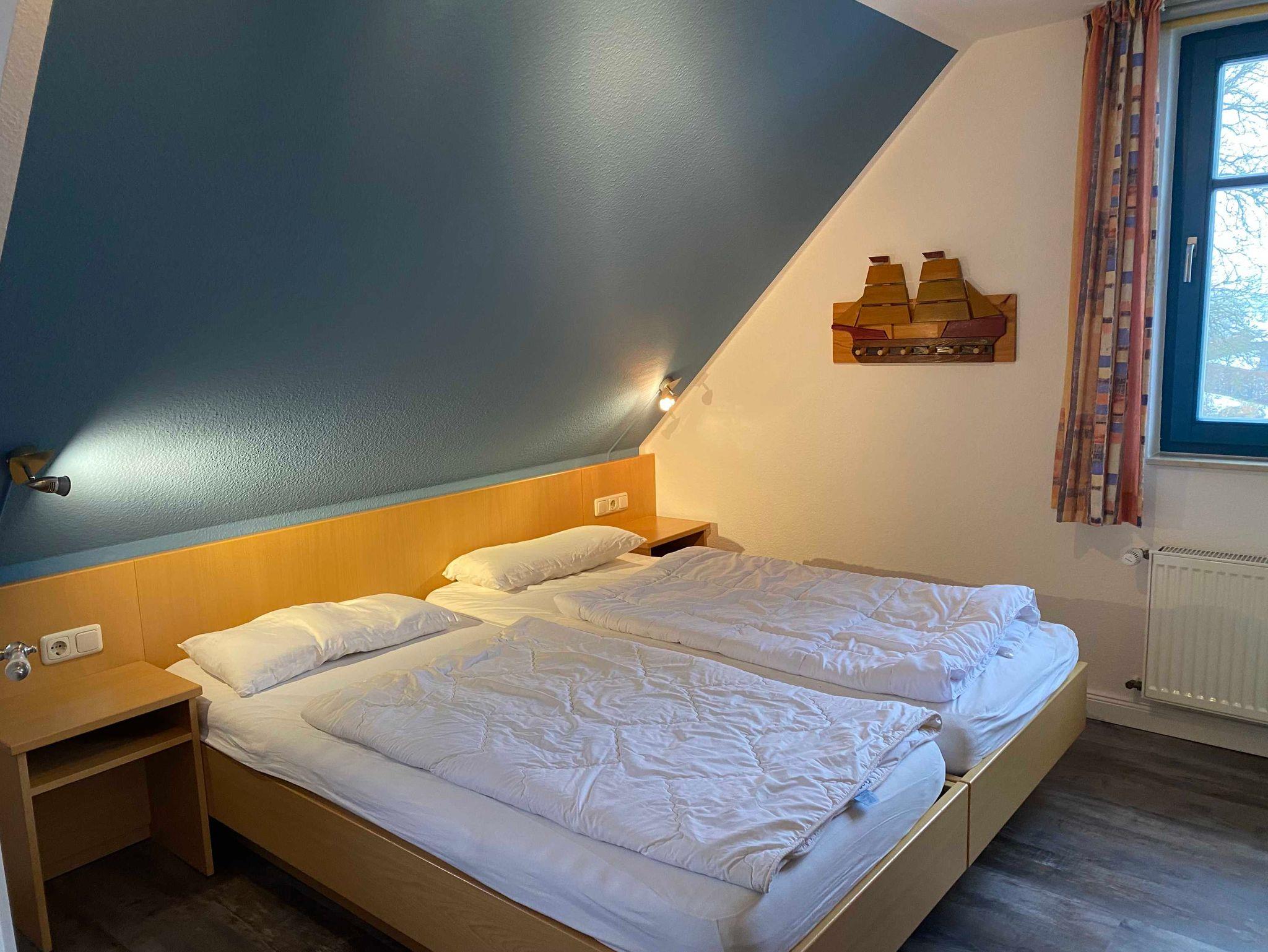 1 Schlafzimmer mit 2 Eimzelbetten und ein Duschbad