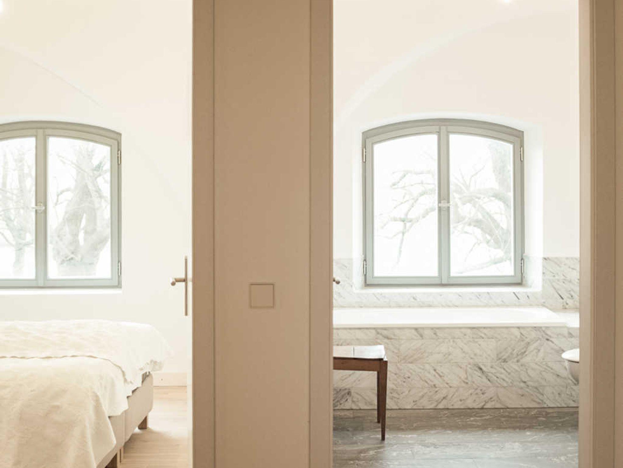 Die Grundmauern der alten Scheunenflächen des ehemaligen landwirtschaftlichen Guts sind wieder sichtbar gemacht worden. Der Ausblick von Haus und Park ist zu allen Seiten geprägt durch die Lage direkt am Wasser.
