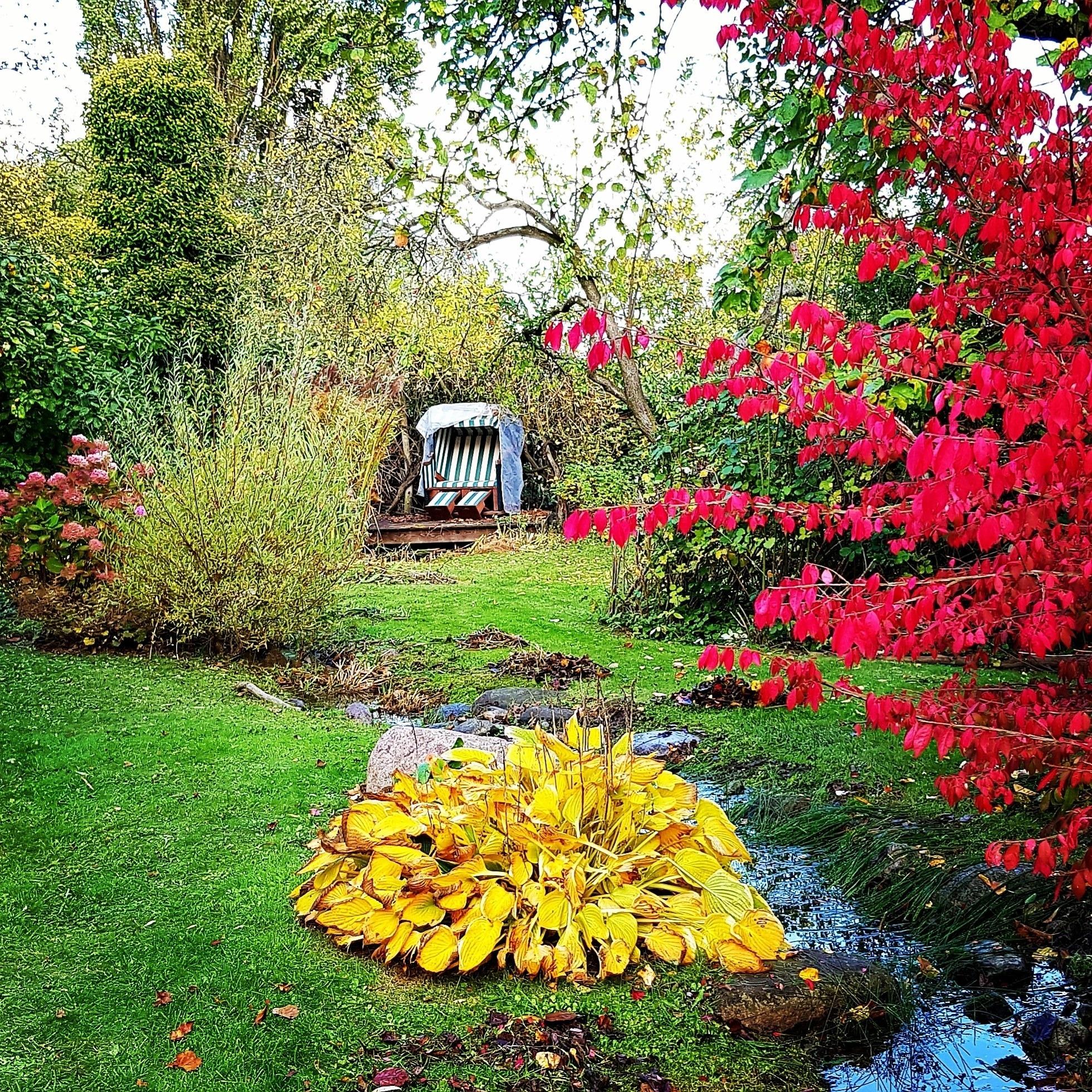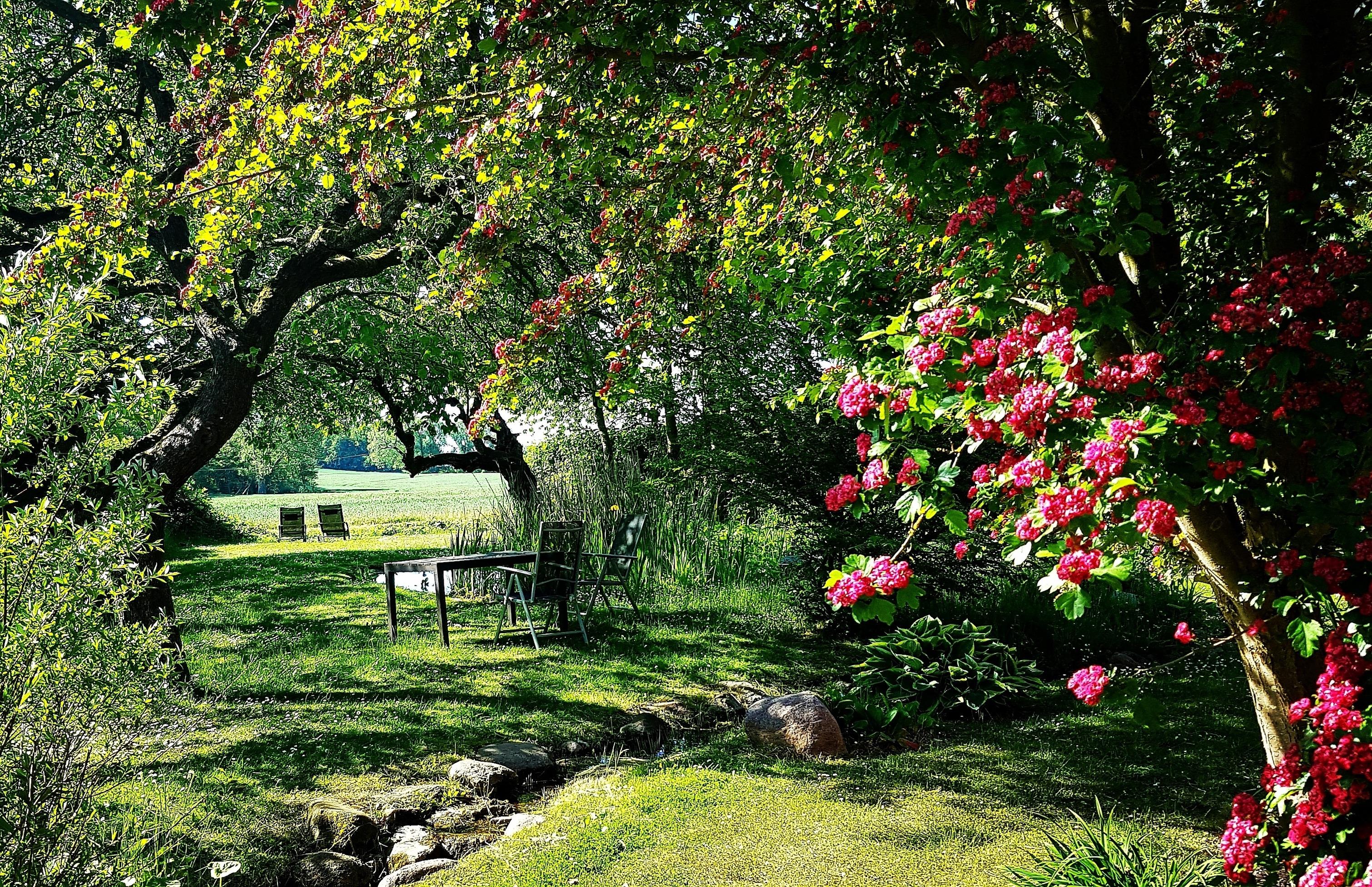 Der gesamte Garten mit seinen hochwertigen Gartenmöbeln steht Ihnen zur freien Verfügung. Auf den jeweiligen Terrassen haben Sie Gartenmöbel und Liegestühle nur für sich. Zusätzlich gibt es in unserem Garten überall die Möglichkeit, es sich in den unterschiedlichen Ruheoasen gemütlich zu machen. Eine Augenweide sind auch unsere drei Teiche, die durch einen Bachlauf verbunden sind. Gerne können Sie sich der Jahreszeit entsprechend an unseren vielen Obstbäumen satt essen oder zum Kochen frische Kräuter aus unserem Kräutergarten probieren. Dazu können Sie sich auf einem der Grills ein saftiges Steak zubereiten.