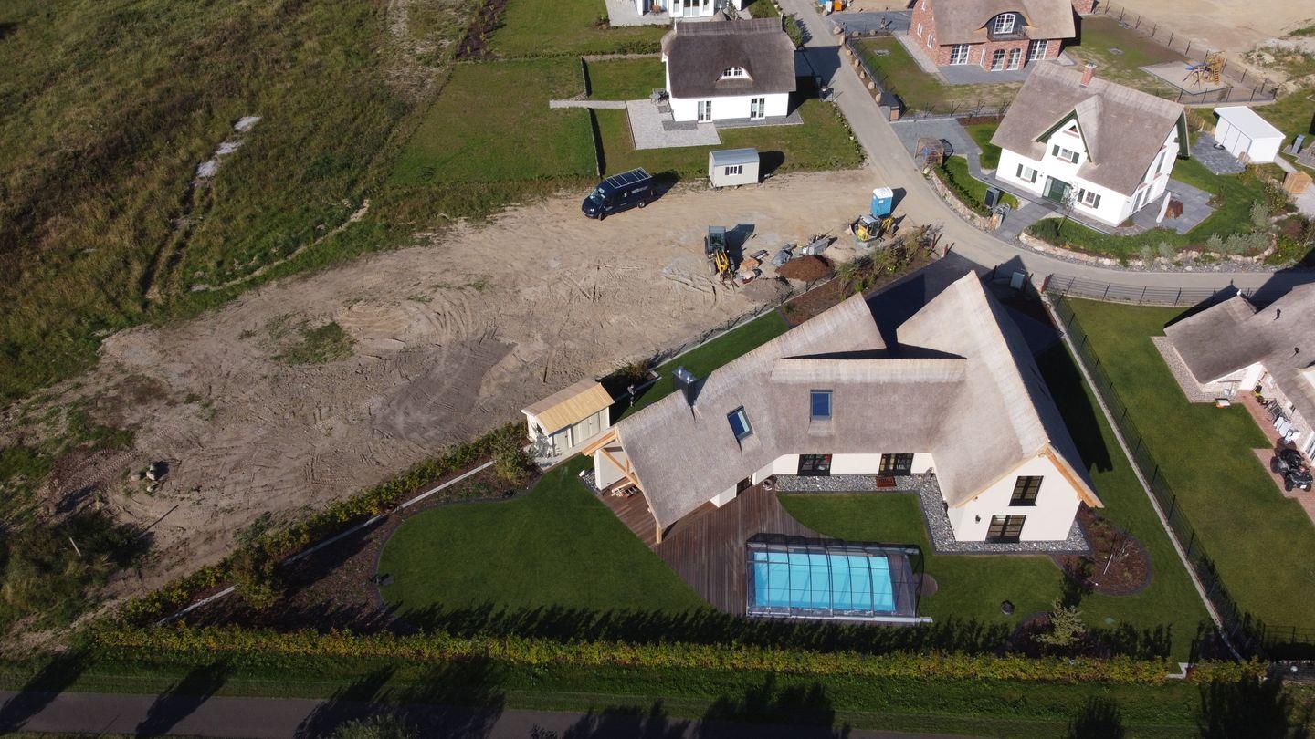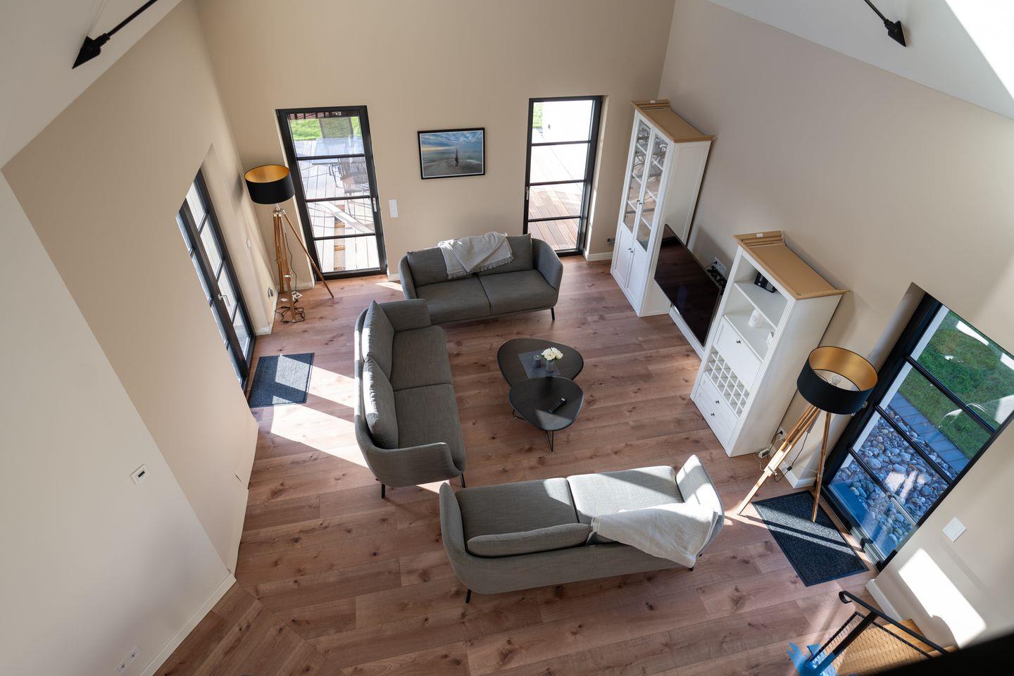 Im Herzen des Hauses lädt der offene Wohn- und Essbereich mit moderner Küche zu geselligen Stunden ein. Hier können Sie gemeinsam kochen, lachen und den Tag am großen Esstisch ausklingen lassen. Vom Wohnbereich führt eine Treppe zur offenen Galerie – ein gemütlicher Rückzugsort unter dem Reetdach für gute Gespräche, ein Glas Wein oder ein stilles Buch am Nachmittag.