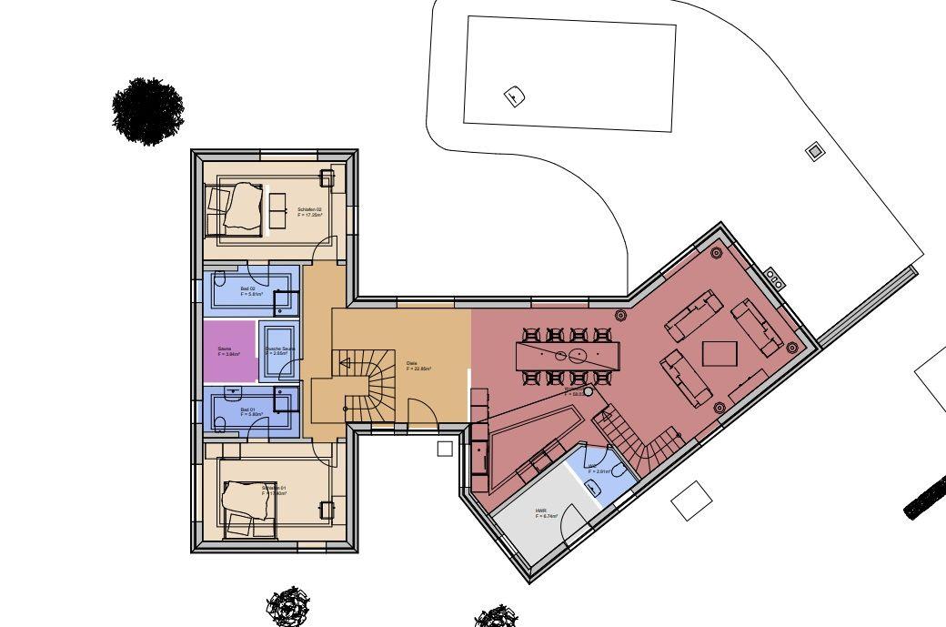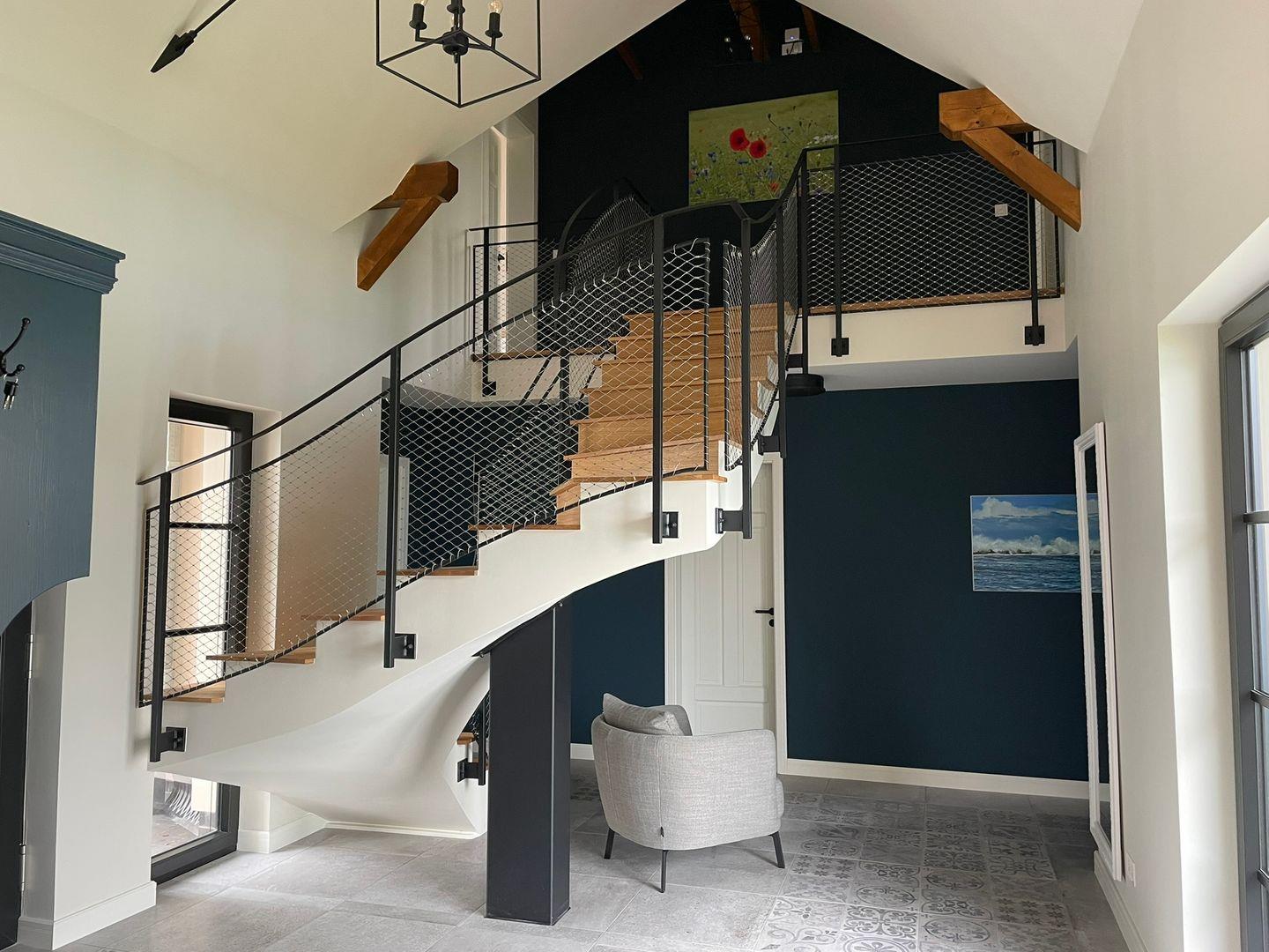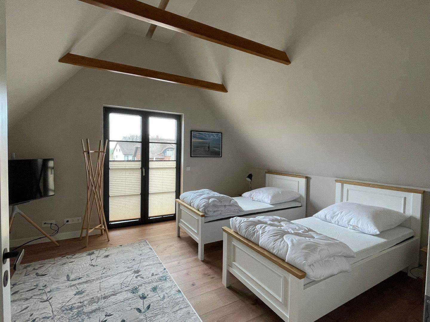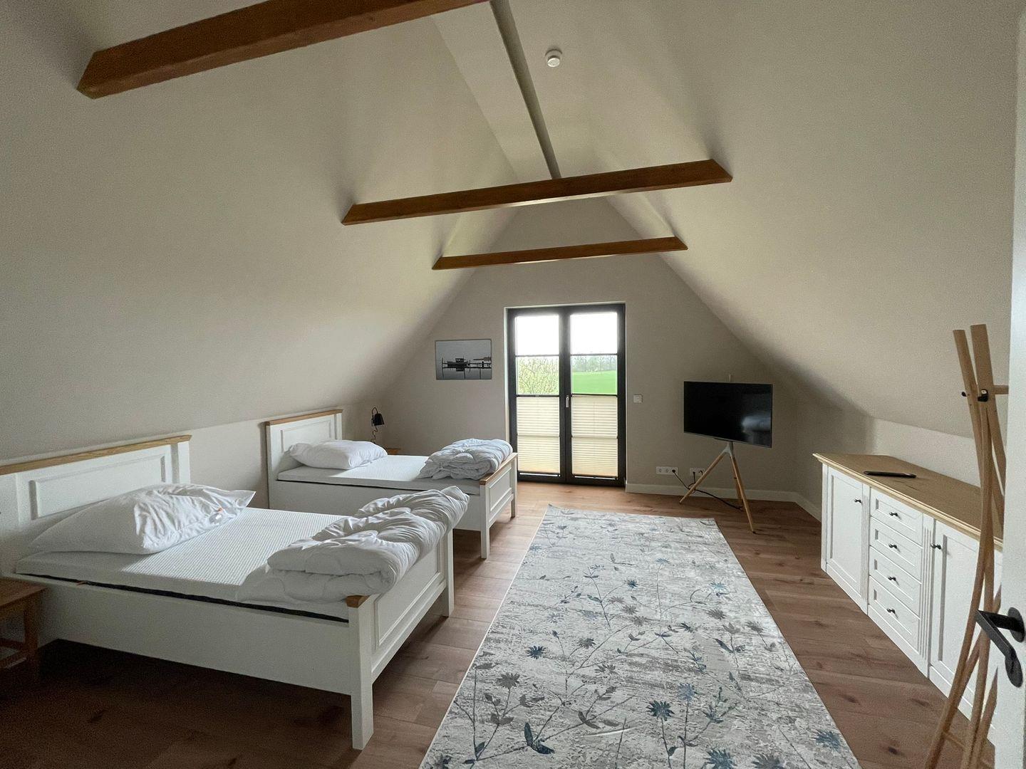 Das Haus bietet auf zwei Etagen Platz für bis zu acht Personen und überzeugt durch seine besondere Architektur und lichtdurchfluteten Räume. Vier komfortable Schlafzimmer, jeweils mit eigenem Bad und ebenerdiger Dusche, bieten Privatsphäre und Komfort – ideal für Familien, Freunde oder kleine Gruppen, die gemeinsame Zeit schätzen, aber auch Raum für sich wünschen.