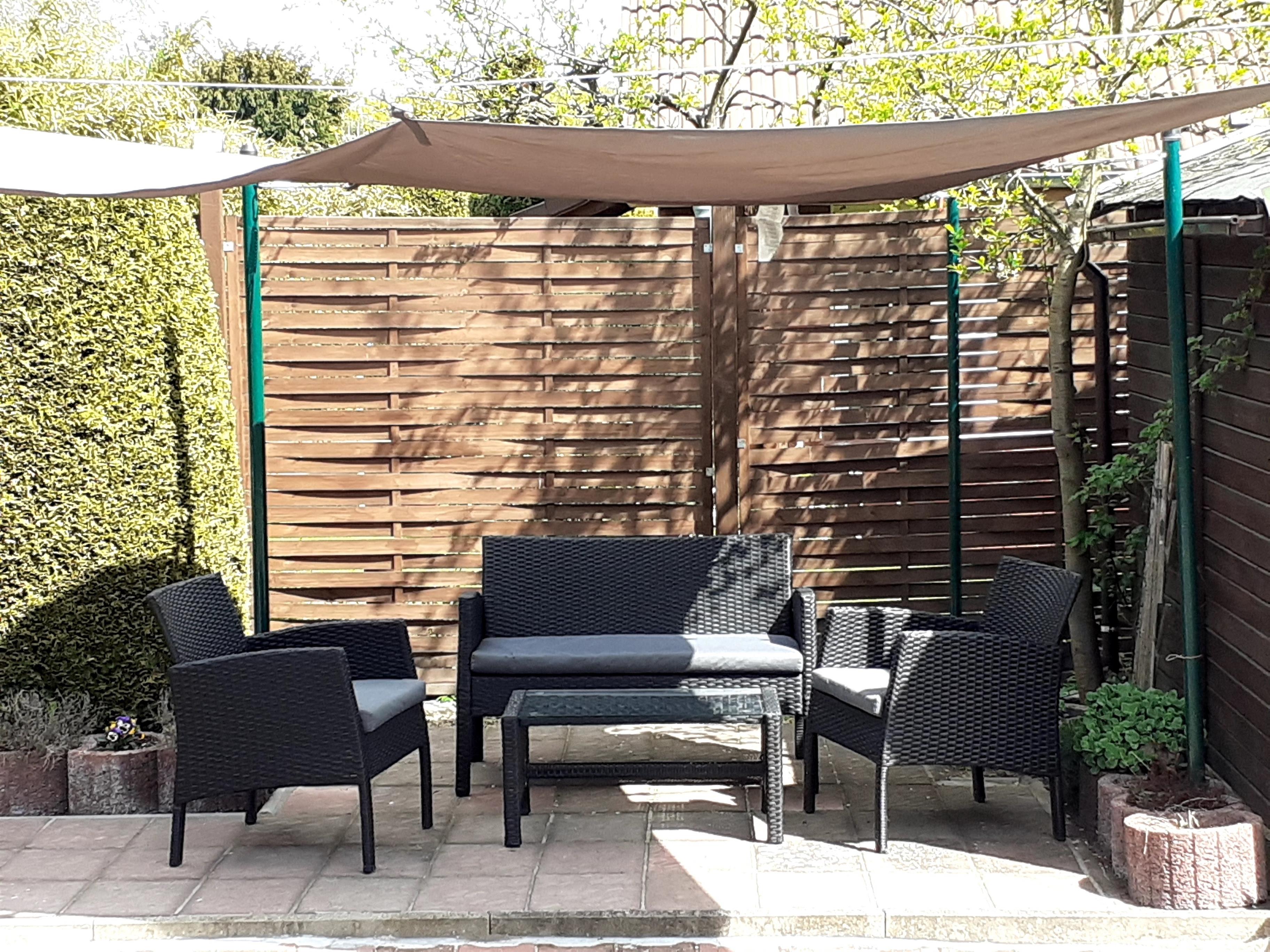 Eine Terasse mit Lounge und Sonnensegel ausgestattet. Grill und Feuerschale vorhanden.
