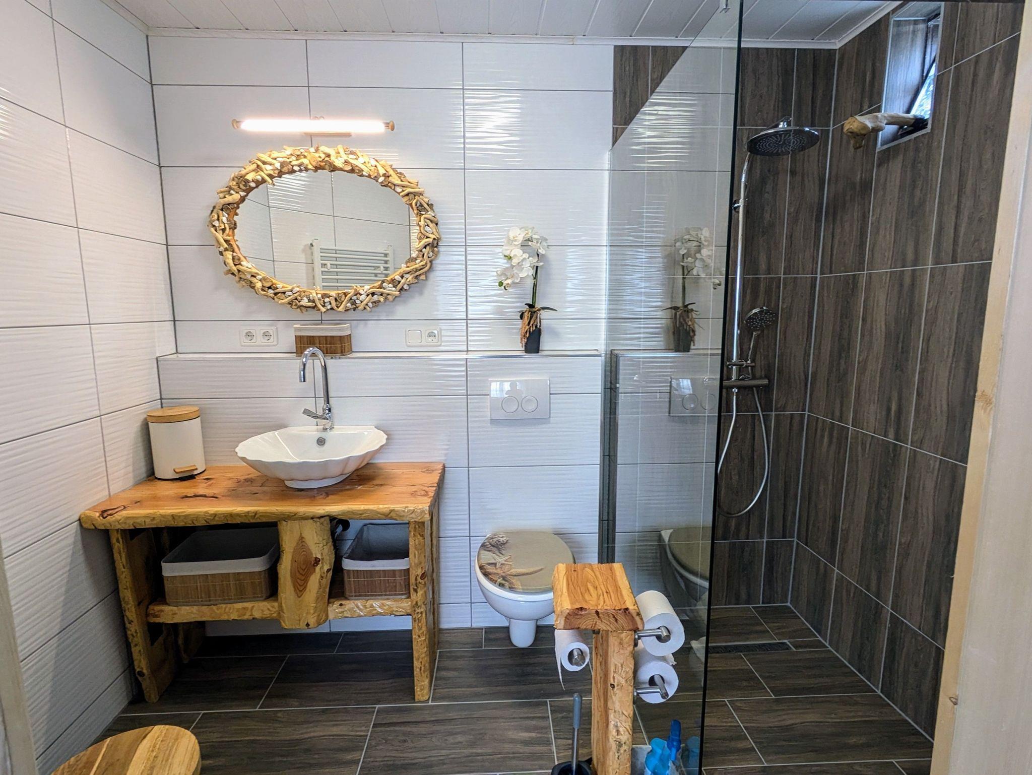 Das helle Bad betreten sie durch eine Glasschiebetüre. Dahinter verbirgt sich eine Walk-In Dusche mit Regenbrause. Eine Glasscheibe getrennt Dusche und Waschbereich. Eine Waschschale in Muschelform ziert den massiven Waschtisch aus Lärchenholz.