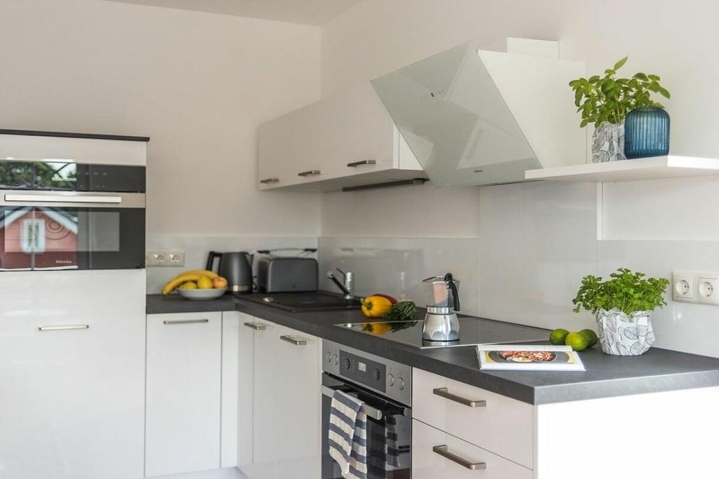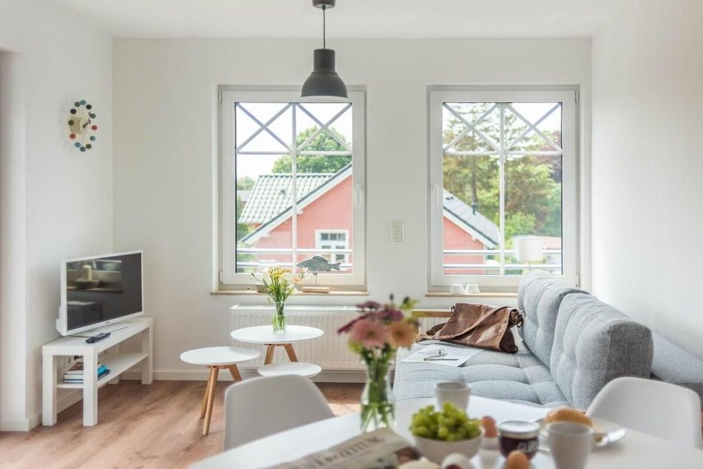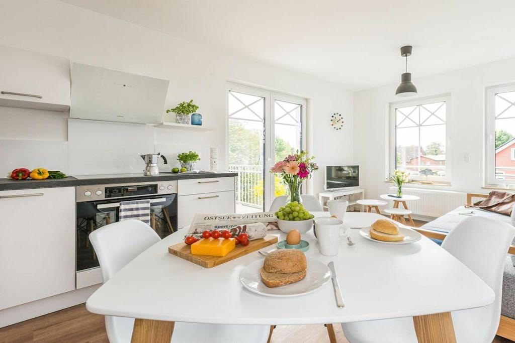 Stue(Fjernsyn, radio, CD-afspiller), Køkken(spisebord, elkedel, brødrister, kaffemaskine, ovn, mikrobølgeovn, opvaskemaskine , køleskab, barnestol), Stue/soveværelse, soveværelse(, dobbeltseng, barneseng), badeværelse(, toilet, bruser, håndvask), Internetadgang, vaskemaskine, balkon(havemøbler), parkering