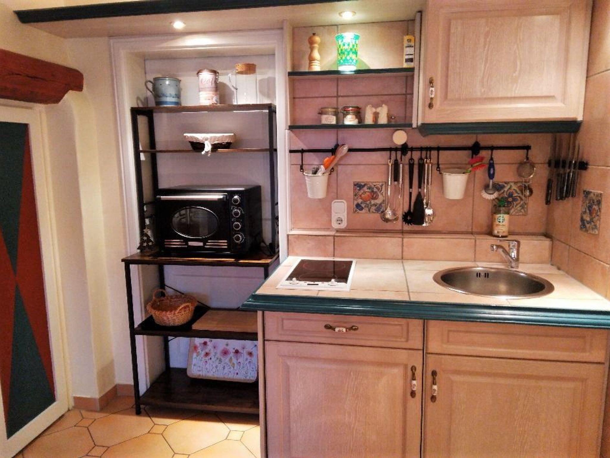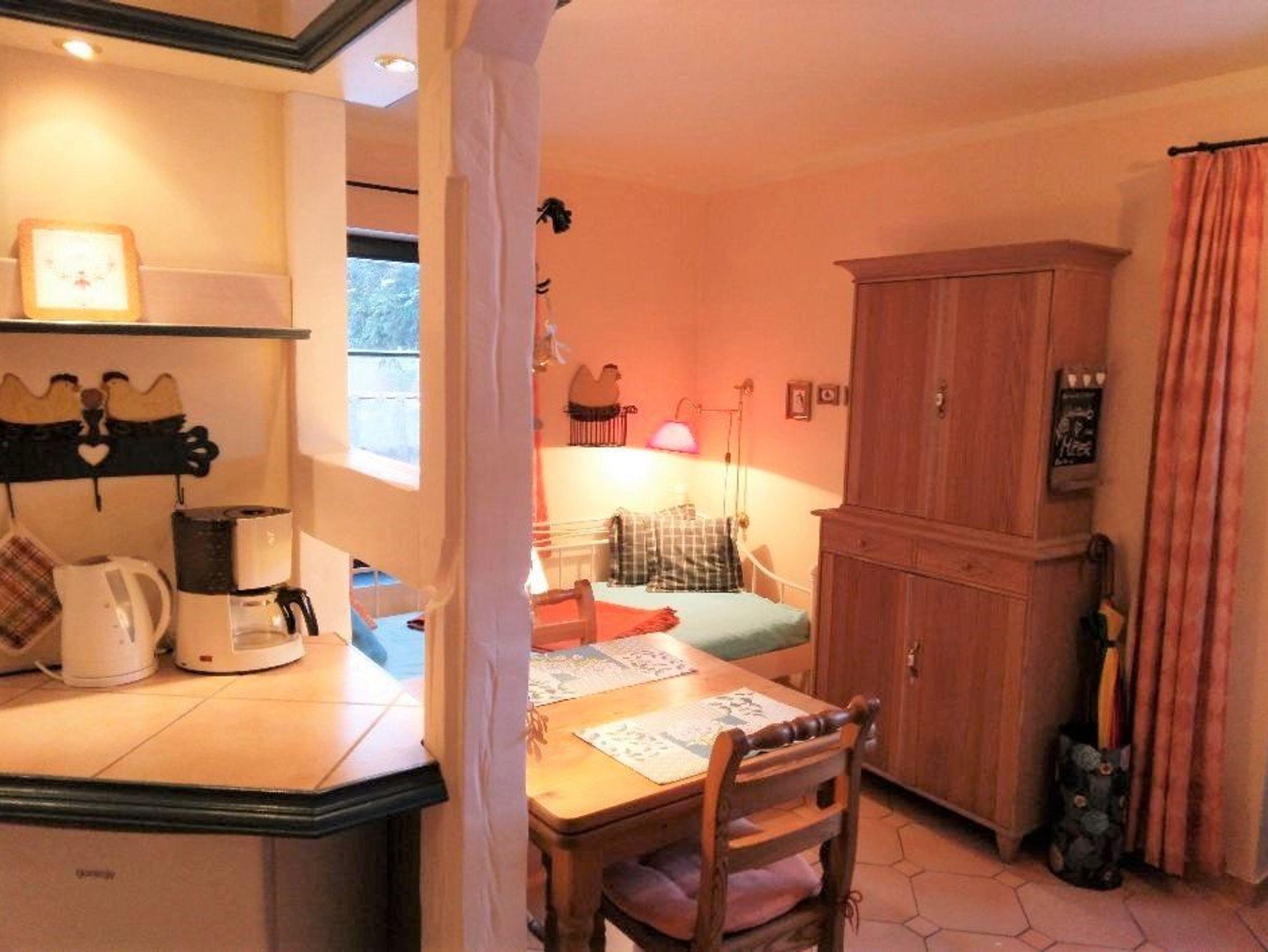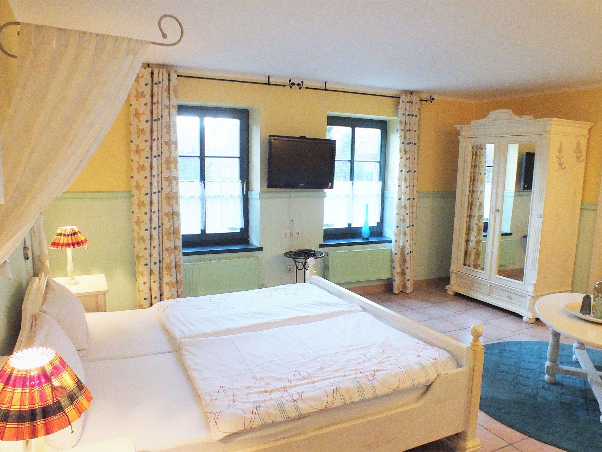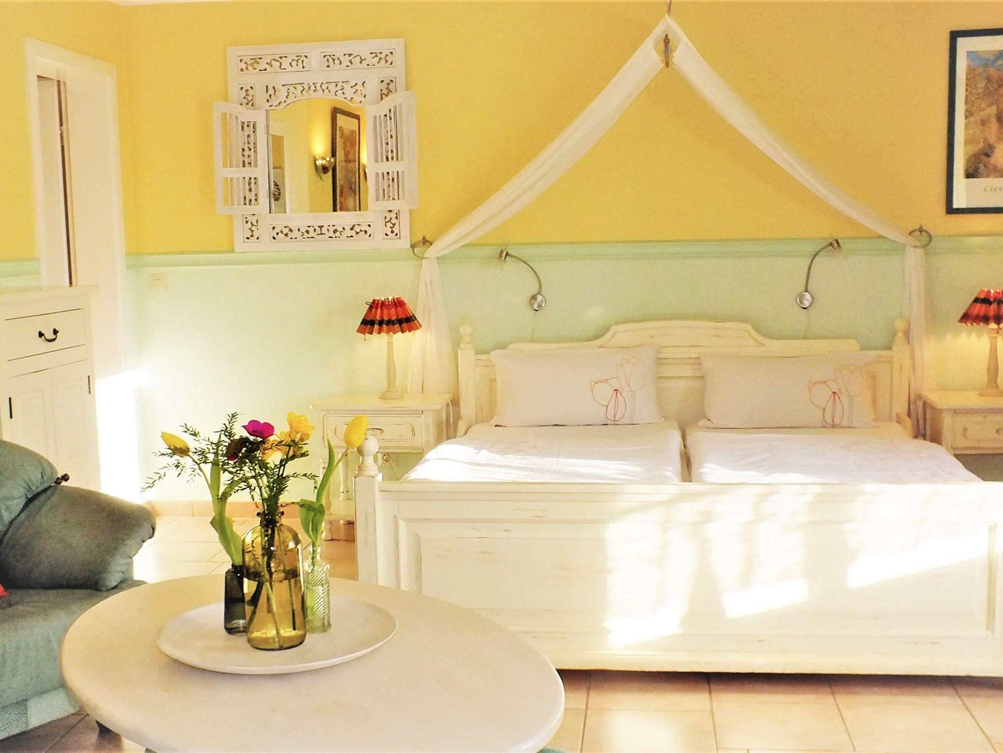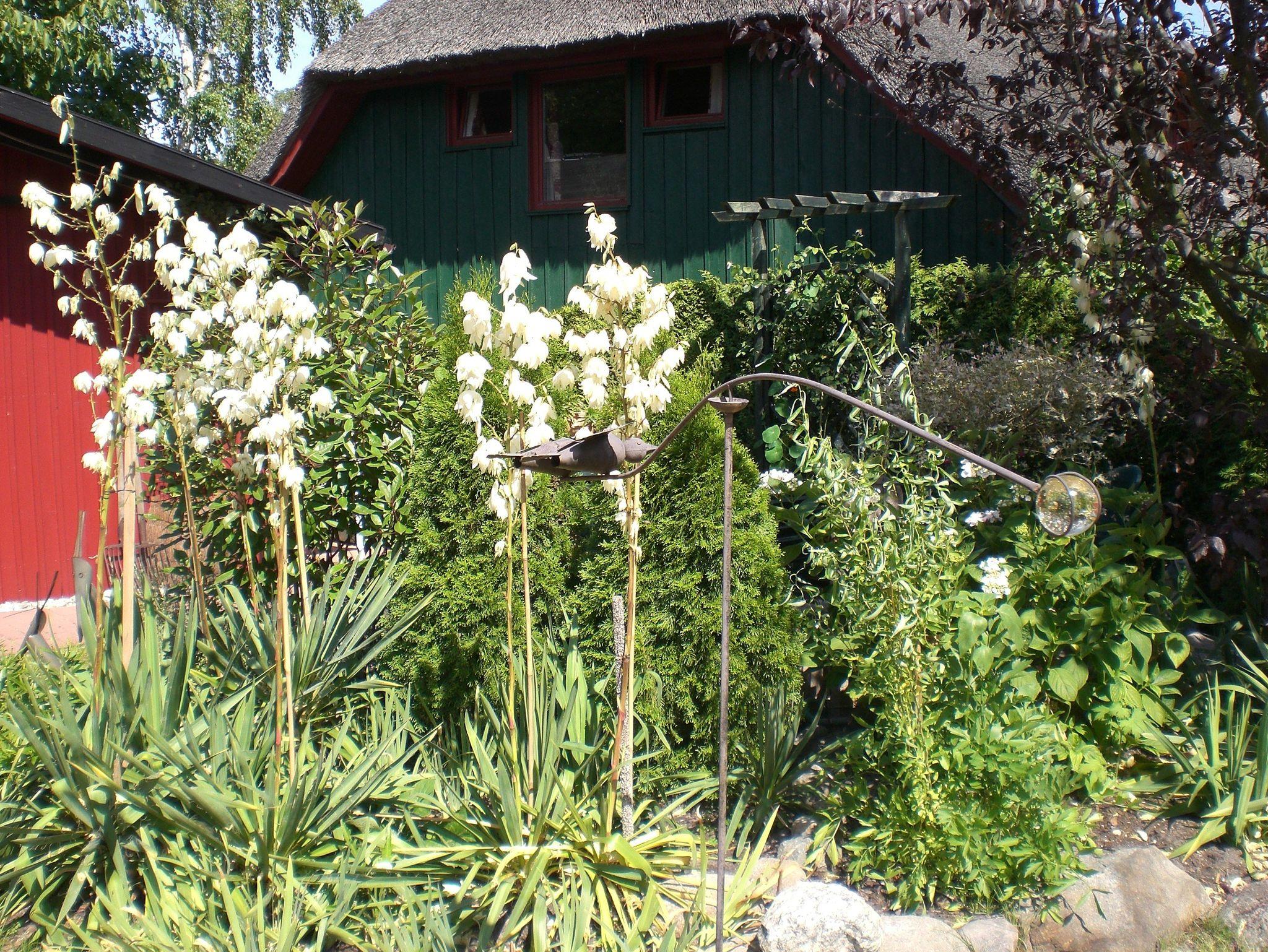 Unsere Ferienwohnung Käpt'n Sun empfängt Sie in offener Wohnart mit einer originellen Wohnküche, von der aus Sie direkt auf die Terrasse und in den weitläufigen Garten gelangen sowie mit Essbereich und Tagessofa. Im Schlafzimmer mit Himmelbett (180 x 200) und gemütlicher Lese-, TV- und Klönecke werden Sie von der Morgensonne geweckt. Den Blick in unseren schön eingewachsenen Garten geben zwei Fenster frei. Käpt'n Sun verfügt über ein schickes Bad mit gefliester, geräumiger Dusche.