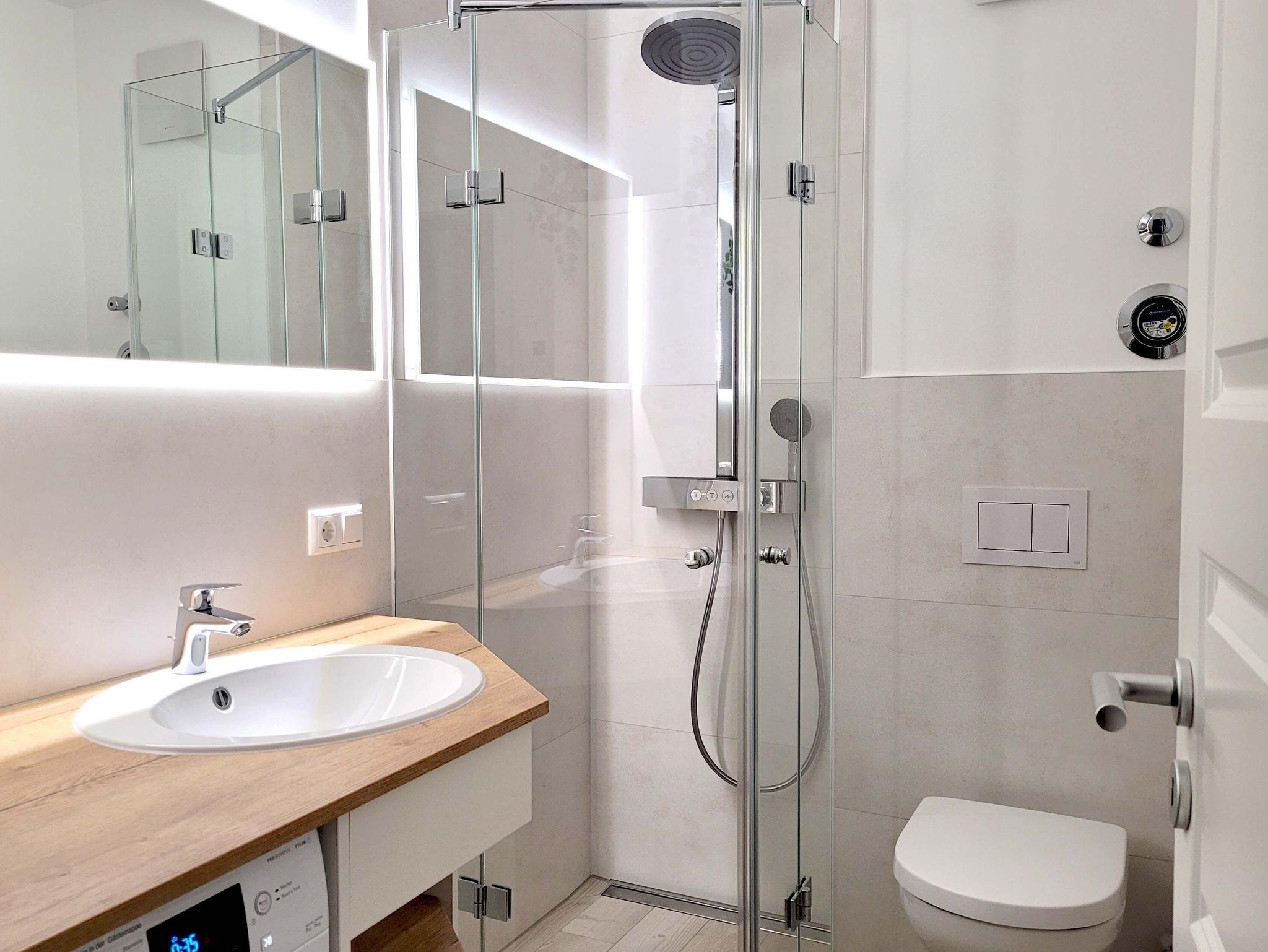 Das modern eingerichtete Badezimmer ist mit einer hochwertigen Dusche ausgestattet.