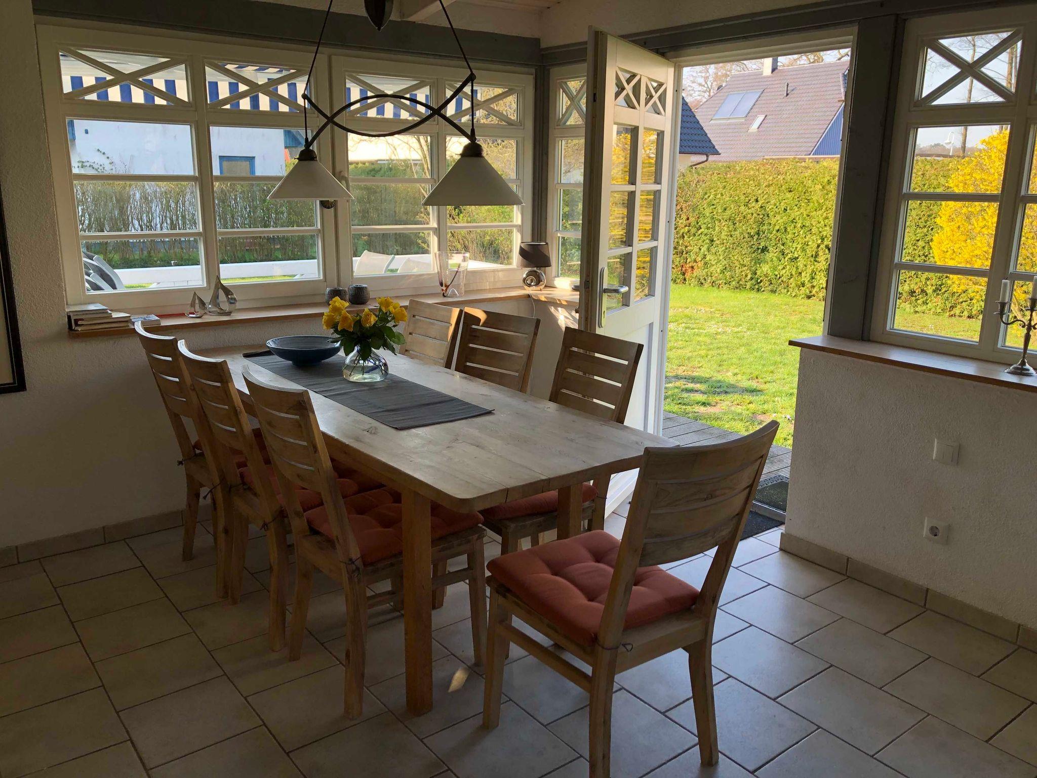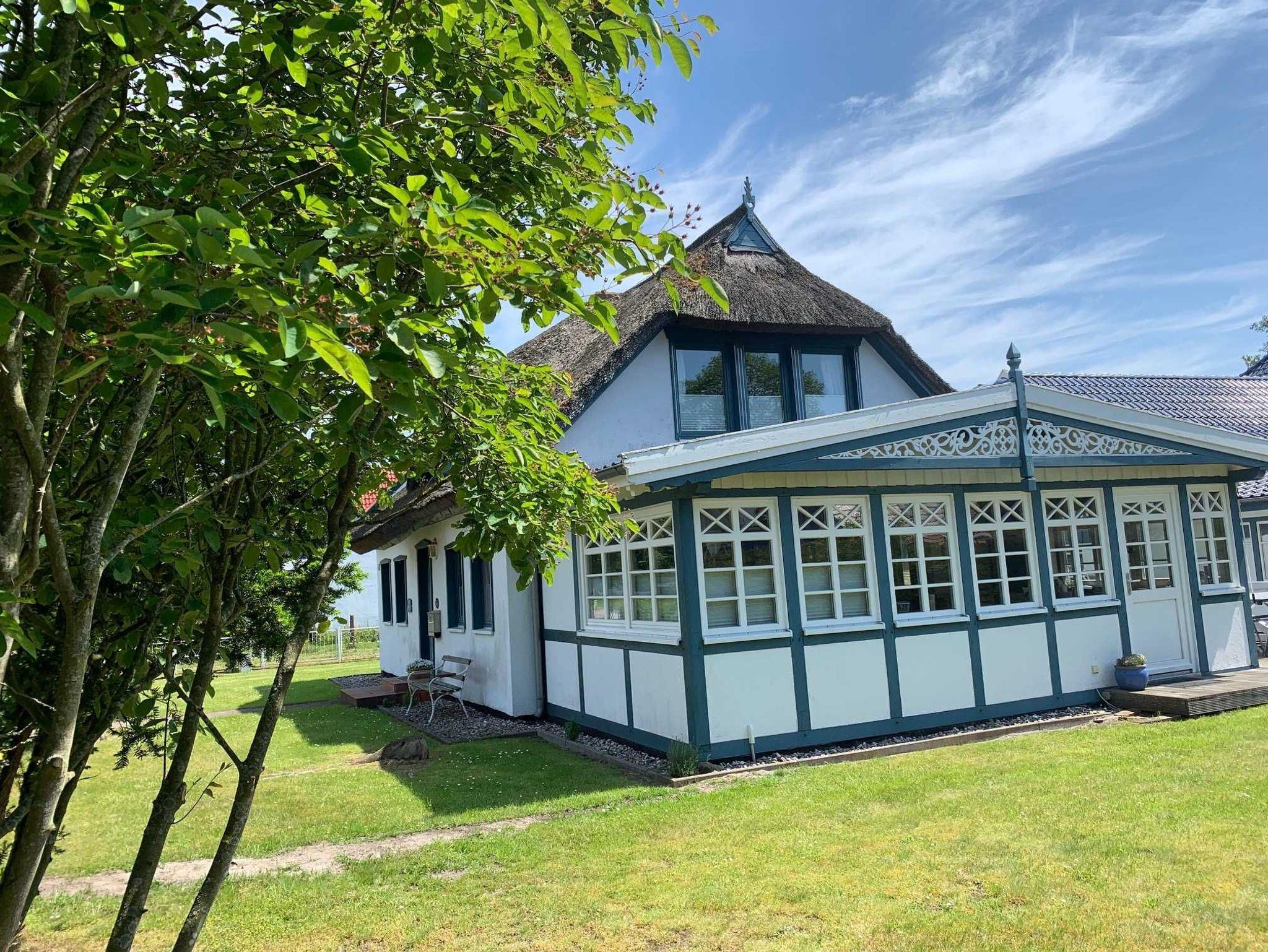 Die Ferienwohnung im Untergeschoss des reetgedeckten Ferienhauses bietet auf 90 qm großzügigen Platz für bis zu 4 Personen. Von der Darssveranda haben Sie Zugang zum großen Garten.