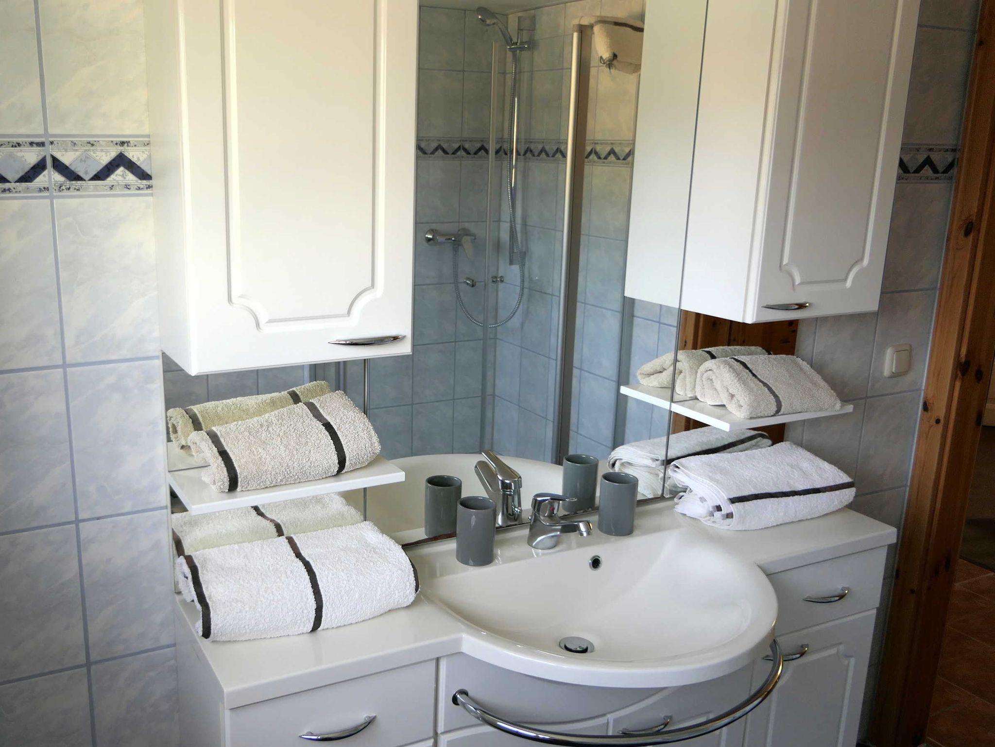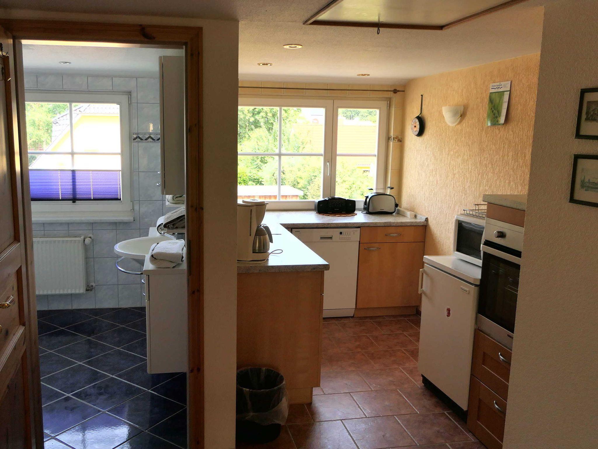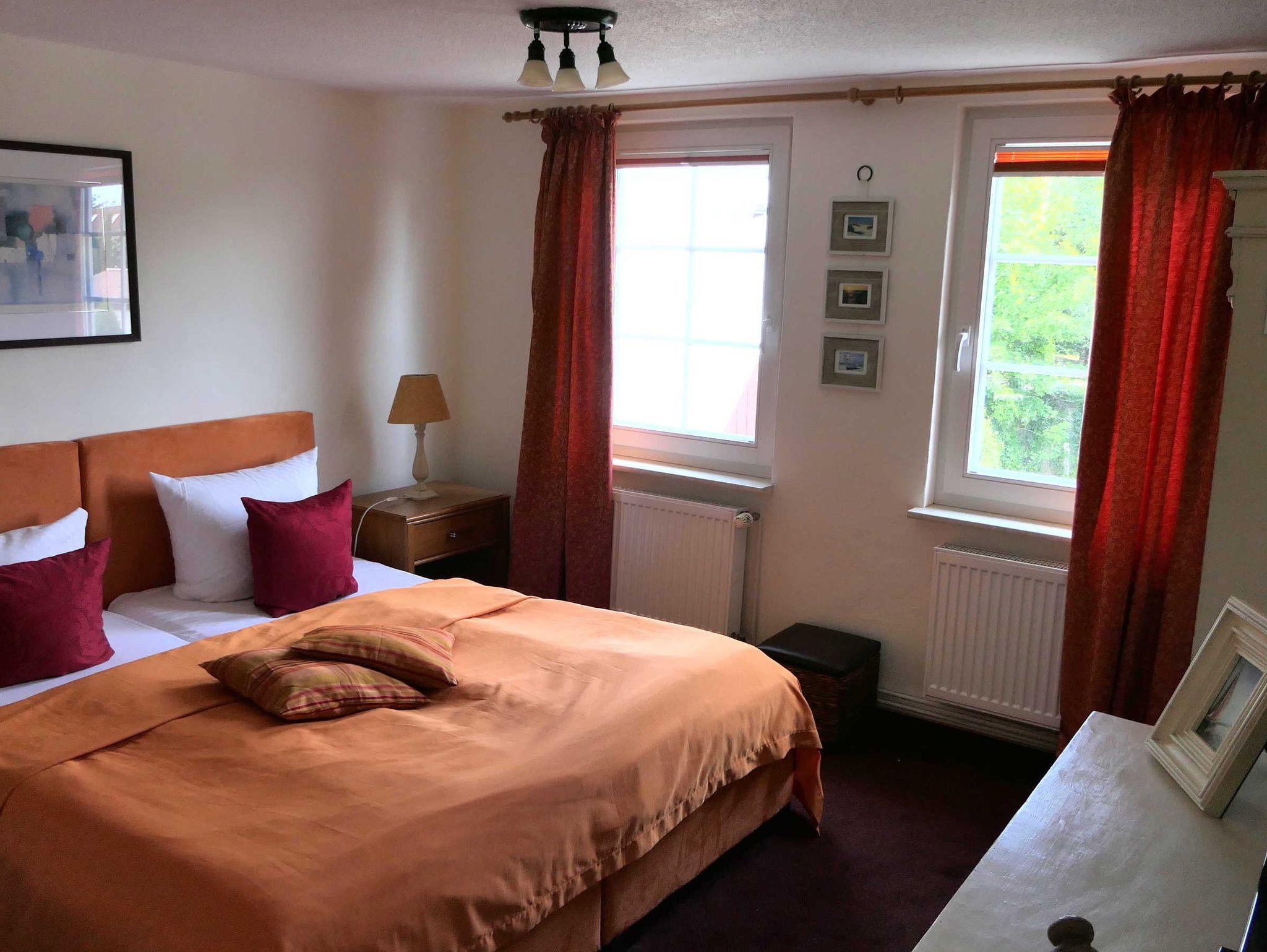 Die renovierte Ferienwohnung befindet sich im Obergeschoss des Hauses. Die Ferienwohnung besteht aus zwei Zimmern (einem Wohn-und einem Schlafzimmer), einer offenen Küchenecke mit Kühlschrank, Kochgelegenheit, Geschirr und Kochgeschirr. Zwischen den beiden Zimmern befindet sich die Sitz- und Essecke. Das Bad mit Dusche ist modern ausgestattet.