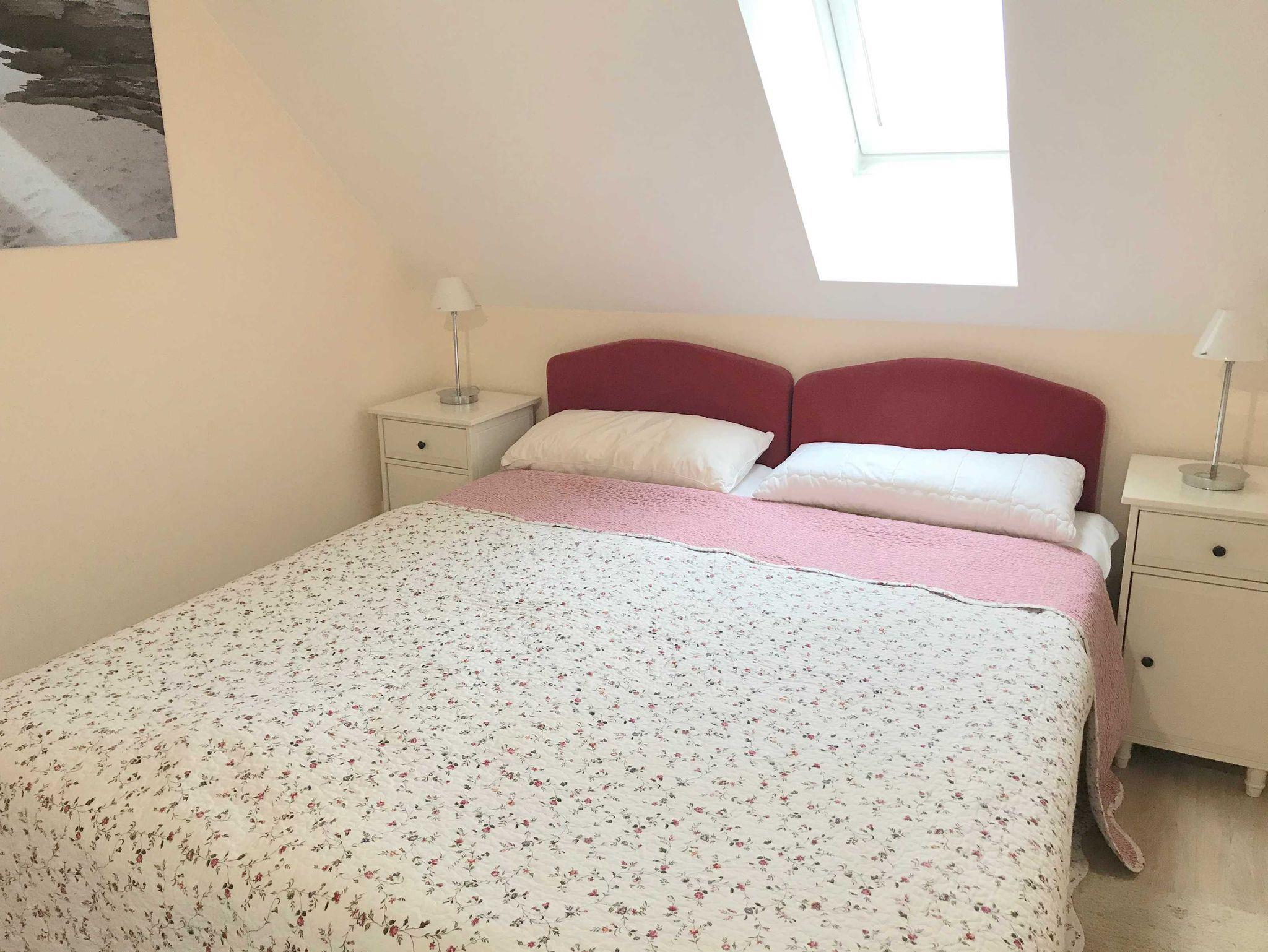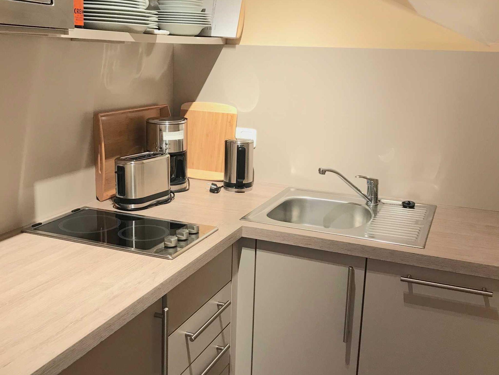Die Küche ist mit einem 2 Plattenherd, Mikrowelle, Geschirrspüler und Kochuntelsilien voll ausgestattet. Im Schlafzimmer gibt es ein Doppelbett (160x200) und einen Kleiderschrank und Nachtische. Das Tageslichtbad bietet eine bodentiefe Dusche.