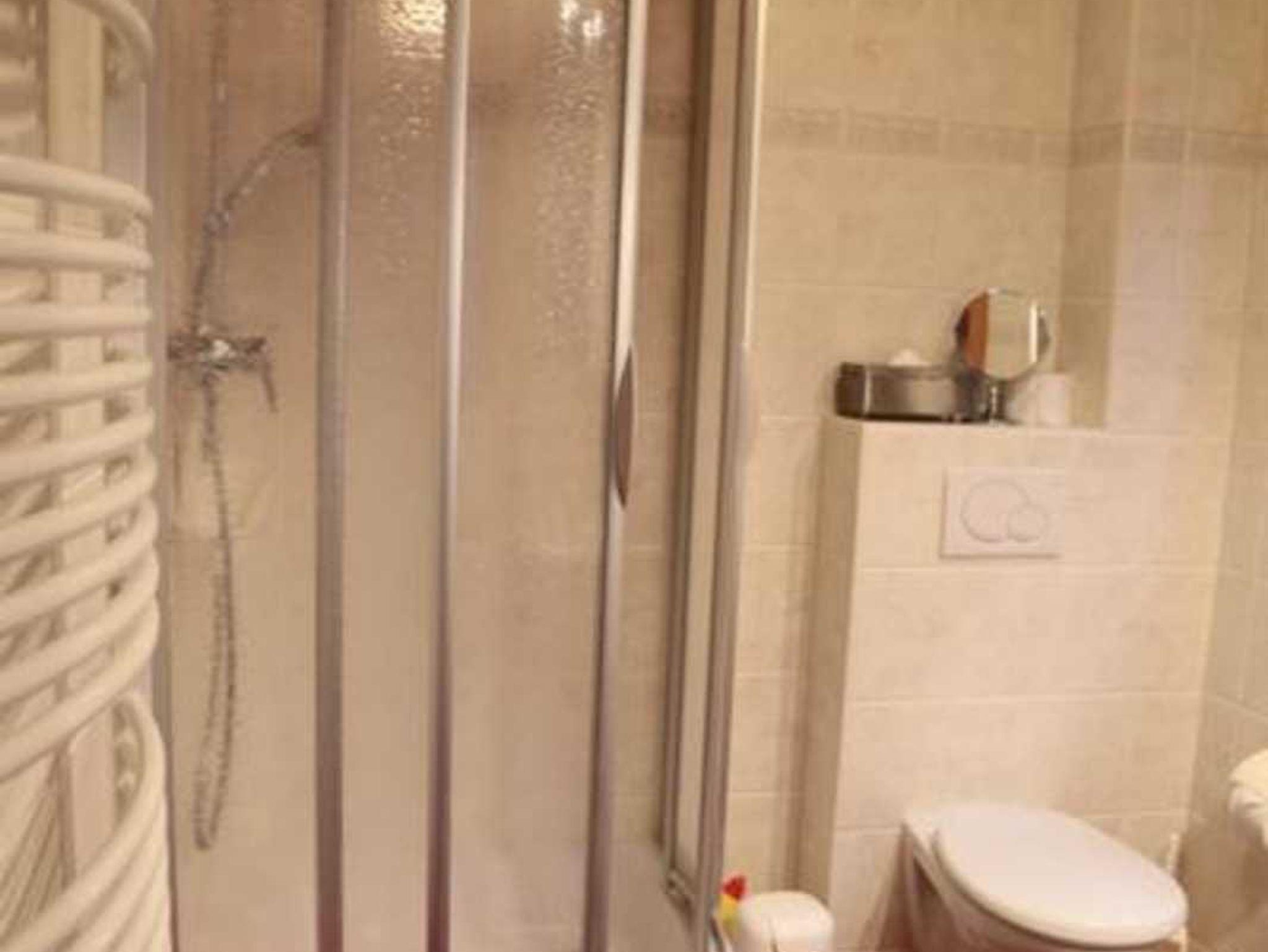 Bad: 4 m², mit runder Dusche, WC, Spiegelschrank, Grundausstattung an Sanitär und Putzmittel