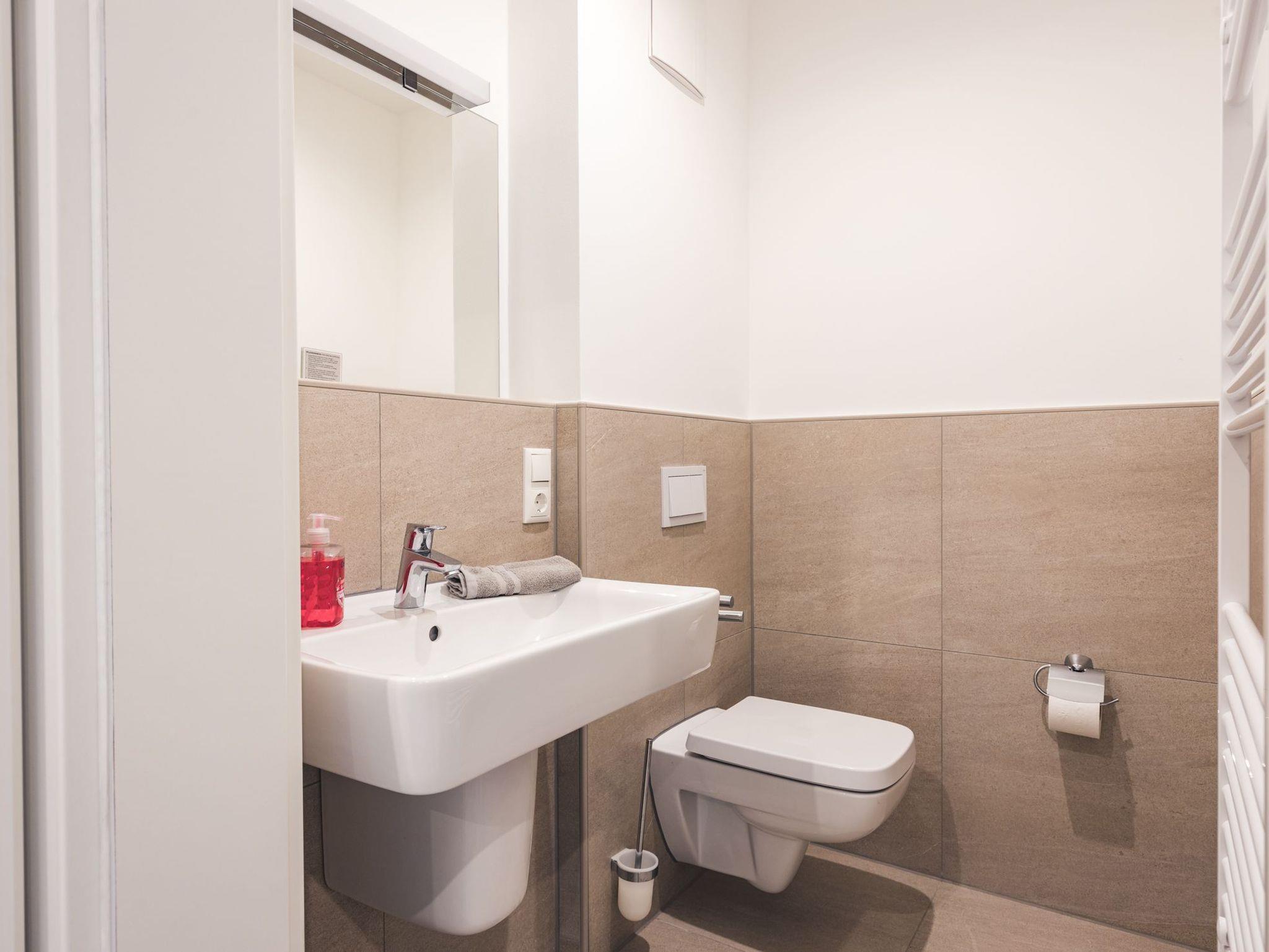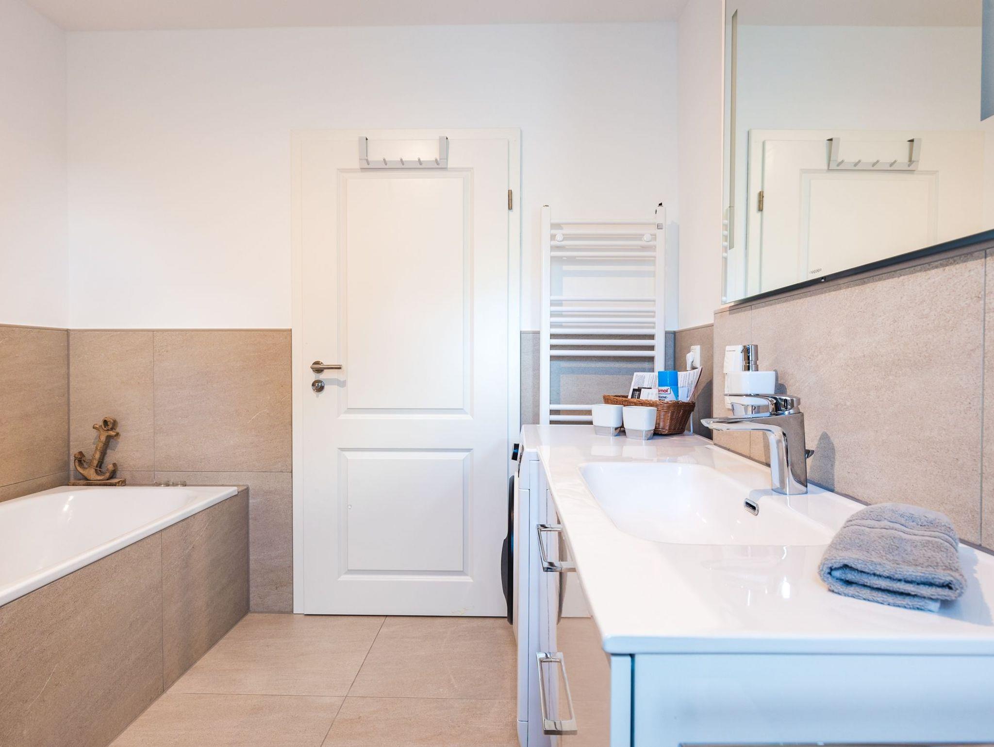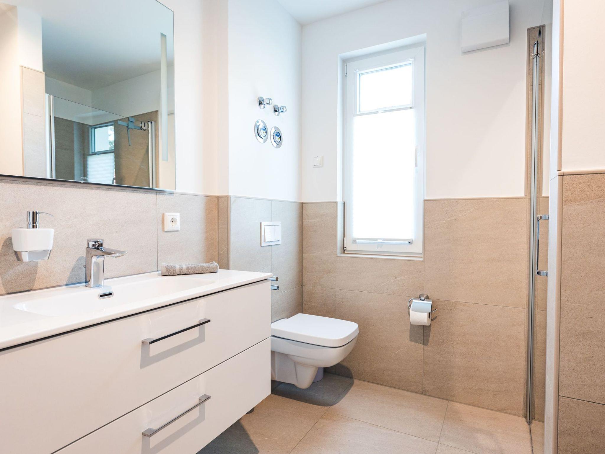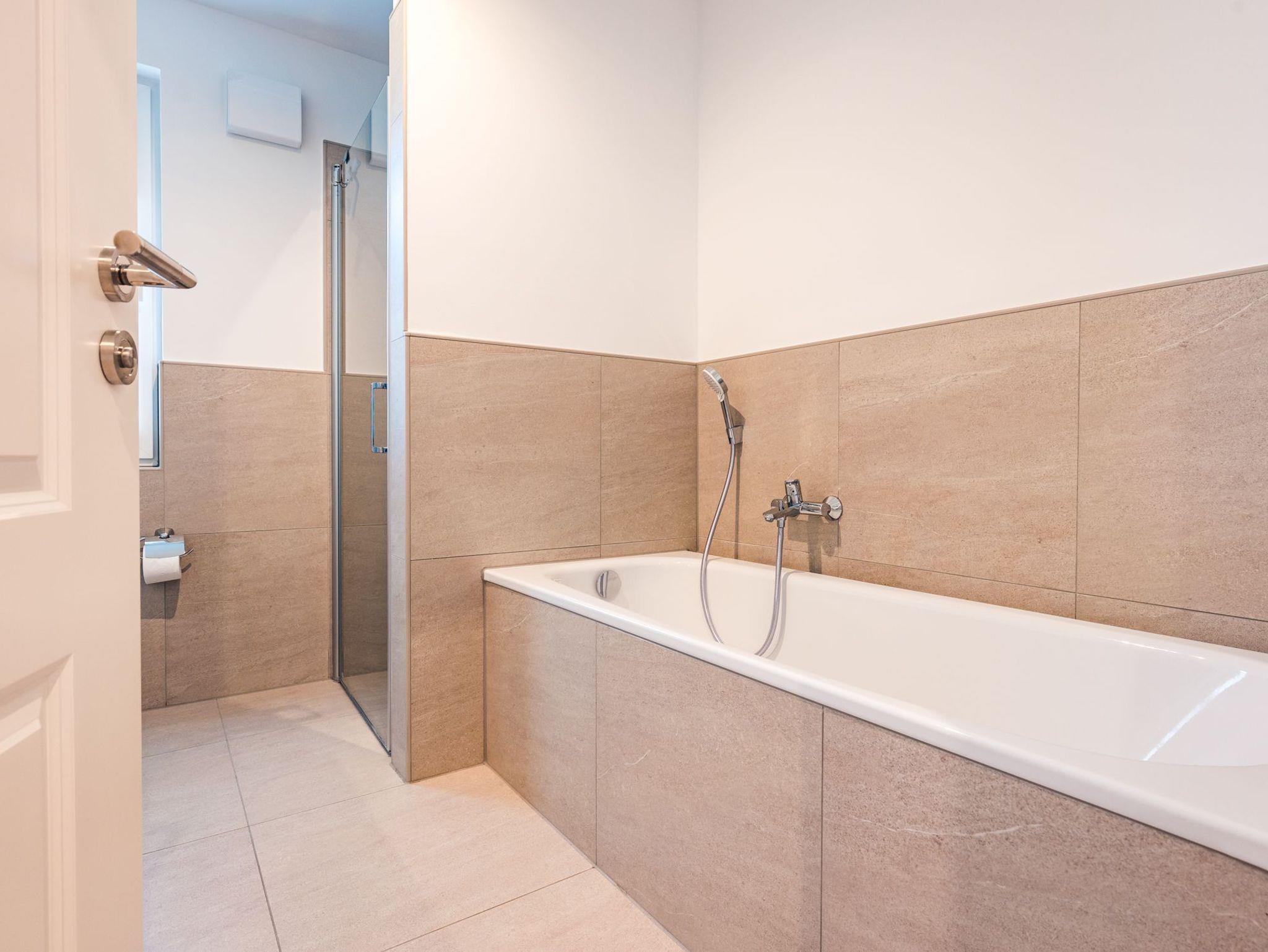 Das modern eingerichtete Badezimmer ist mit einer hochwertigen bodengleichen Dusche, einer Badewanne sowie einer Waschmaschine ausgestattet.