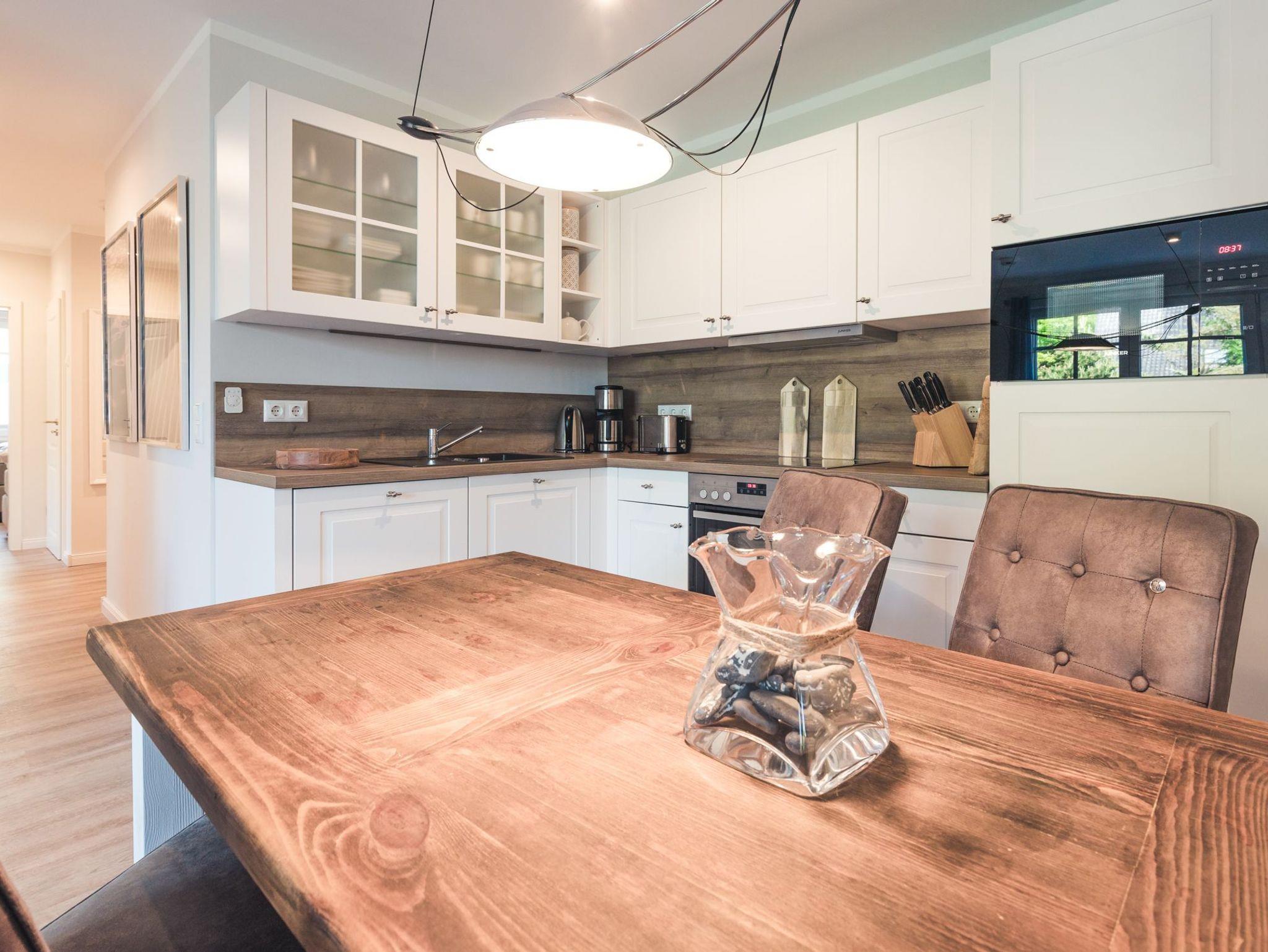 Sie verfügt über einen eleganten Wohnbereich mit einer offenen Küche und gemütlichem Essbereich. Die Küche ist hochwertig ausgestattet und lässt keine Wünsche offen.