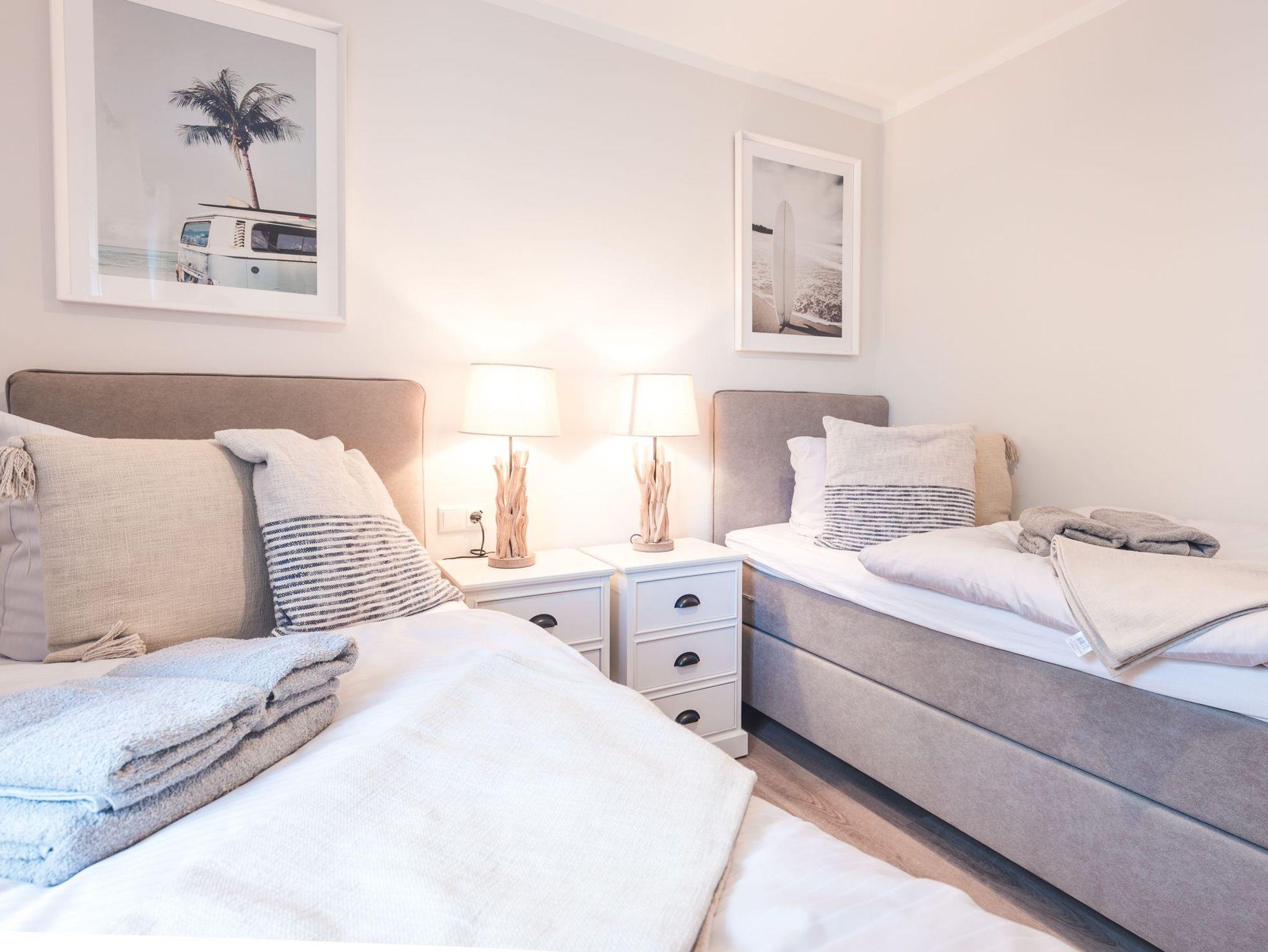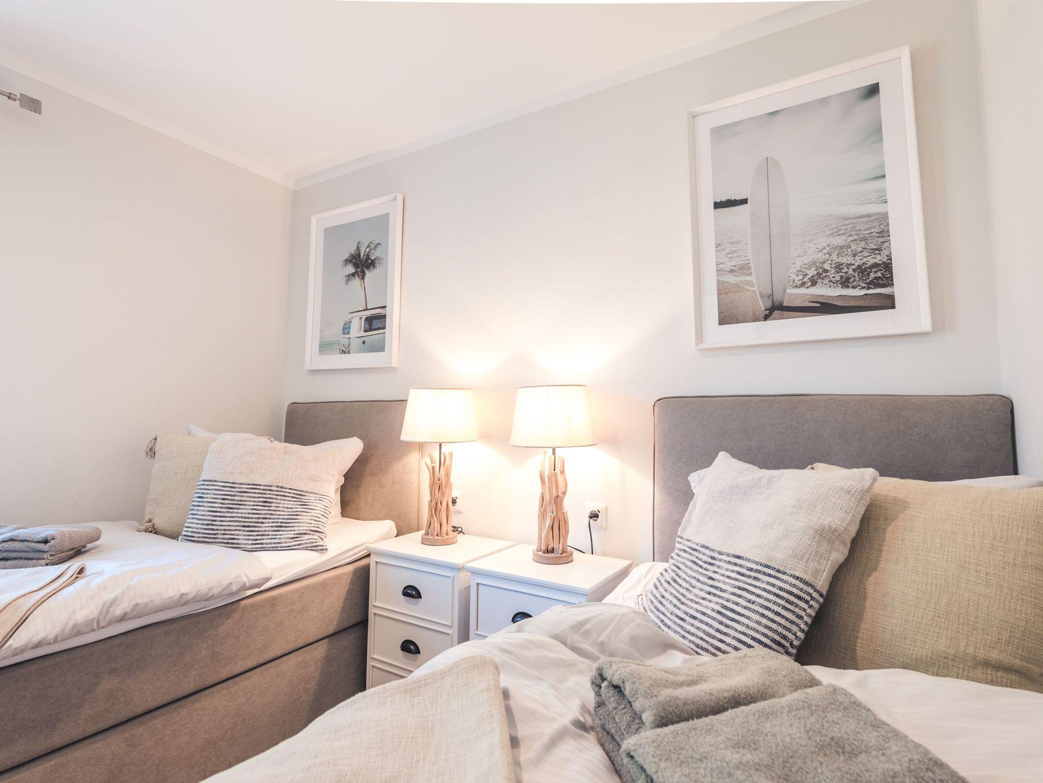 Im anderen Schlafzimmer garantieren zwei Boxspring-Einzelbetten erholsamen Schlaf. Beide Schlafzimmer sowie das Wohnzimmer sind mit TV-Geräten ausgestattet.