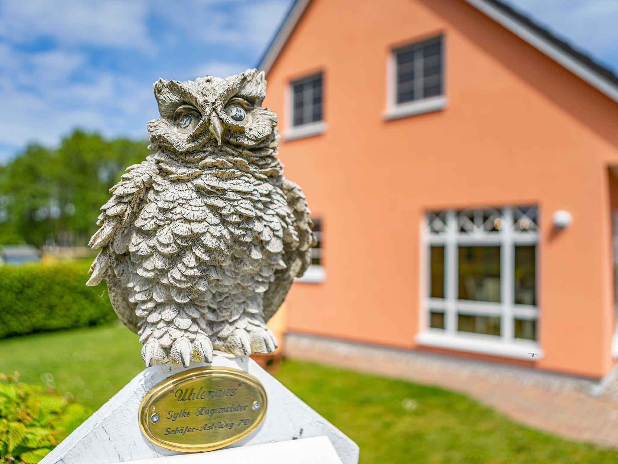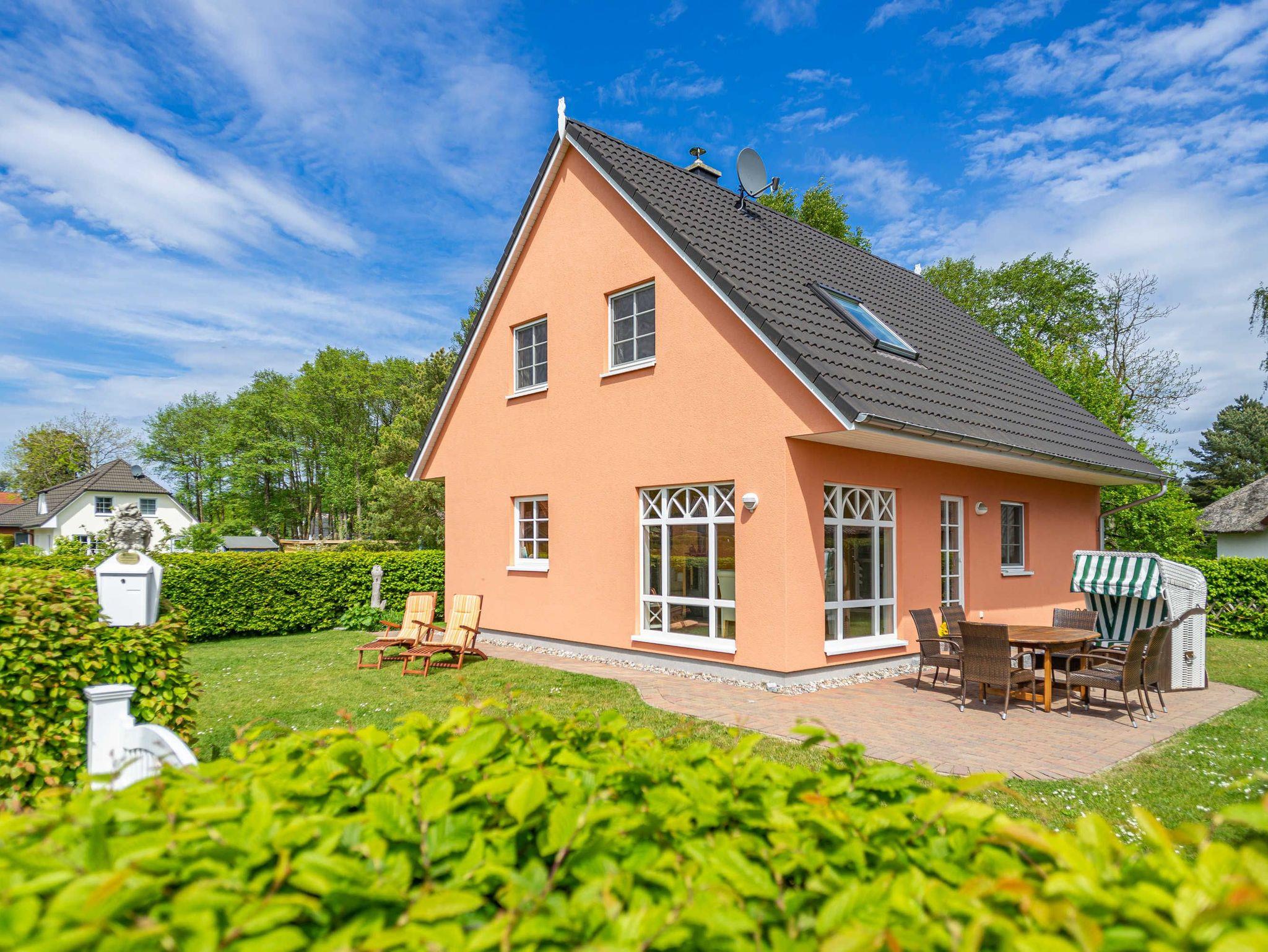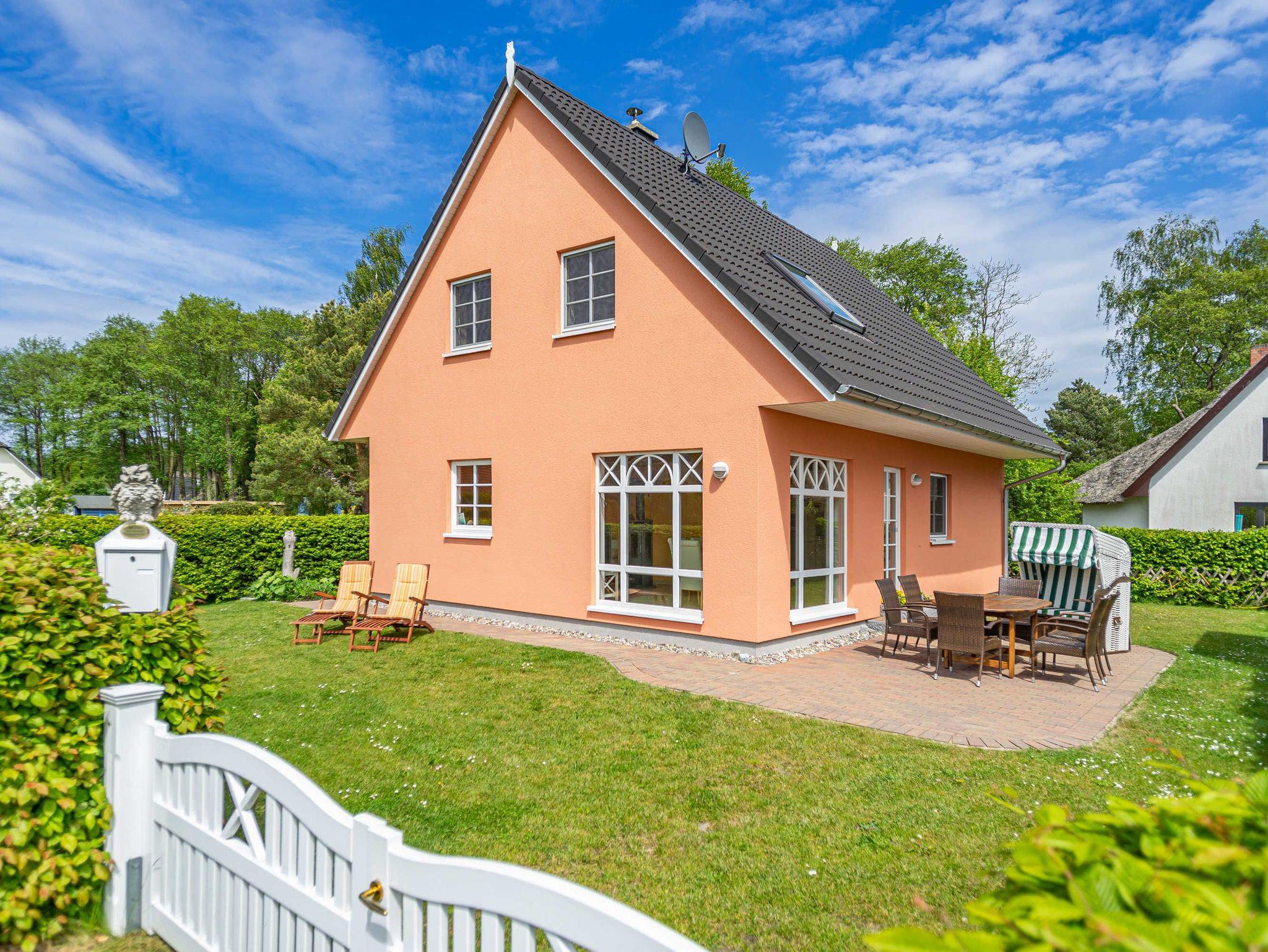 Das exklusive Ferienhaus erwartet seine Gäste auf einem ruhig gelegenen Grundstück, am Rande einer Wiese, mit traumhaftem, freiem Blick über die Wiese zum Rand des Darßer Waldes.