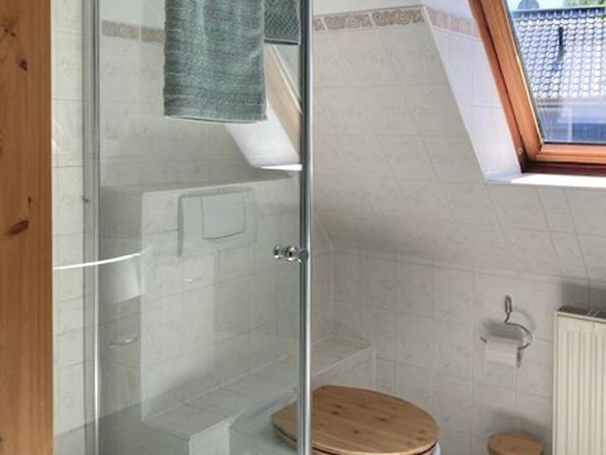 Im Obergeschoss befinden sich die beiden Schlafzimmer mit Boxspringbett (2,00 x 1,80), einem ausziehbaren Doppelbett (2 x 90) mit ausgewählt guten Matratzen und ein Duschbad mit einem weiteren WC. Bettwäsche und Handtücher sind im Reisepreis enthalten.