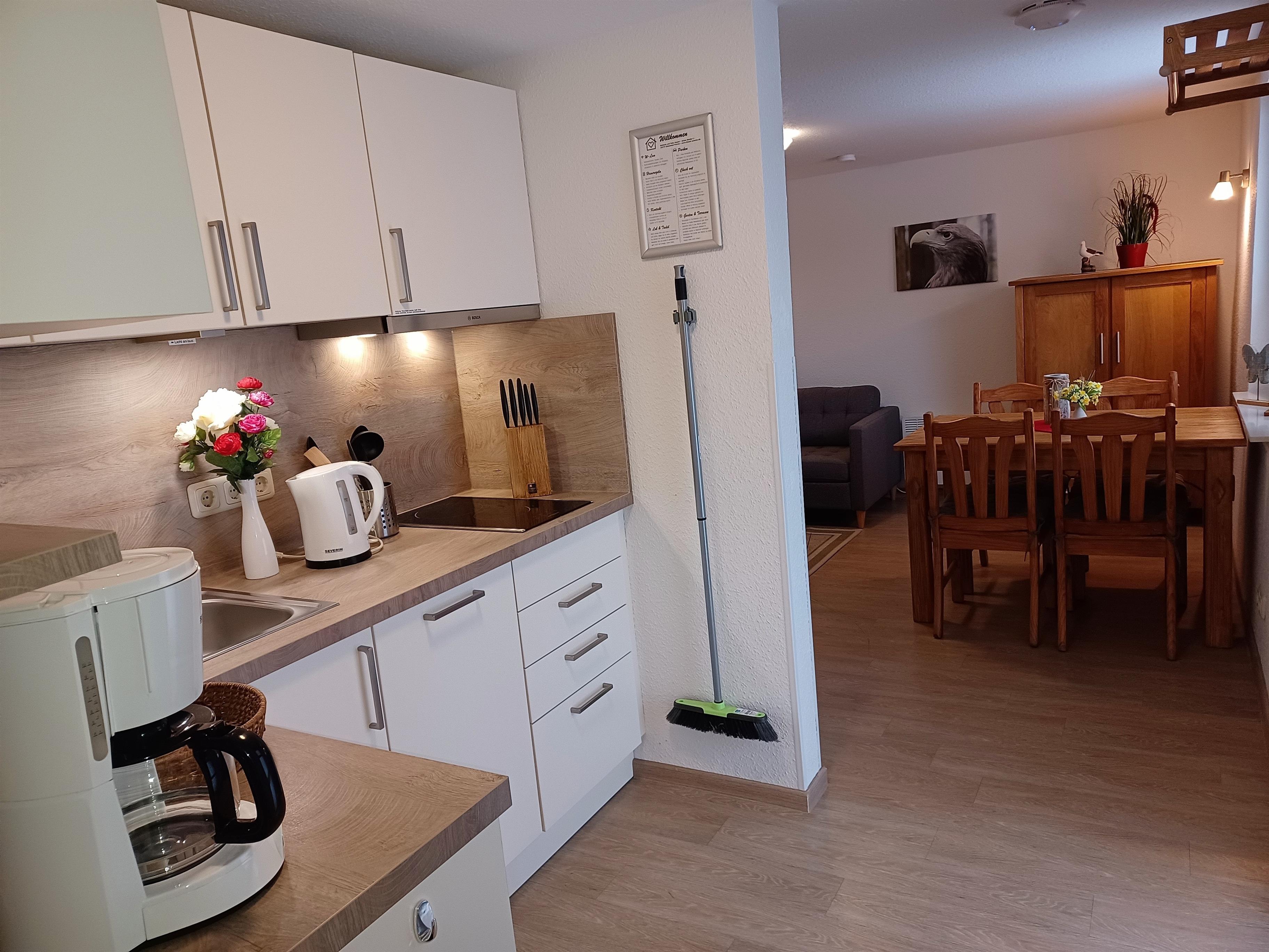 * Die Wohnung Seeadler mit separatem/eigenem Eingang ist 45 qm groß und verfügt über 2 Schlafzimmer mit 1 Doppelbett sowie 2 Einzelbetten, 1 Wohnzimmer mit Sat-TV, 1 Bad mit Dusche und Föhn sowie 1 Küche mit Geschirrspüler, Mikrowelle, 2 Kochfeldern, Kühlschrank mit Gefrierfach, Toaster, Kaffeemaschine und Wasserkocher. Bettwäsche buchbar ab 3 Nächten gegen Gebühr. Handtücher sind mitzubringen. Eine eigene Terrasse mit Gartenmobiliar ist direkt vor der Wohnung vorhanden. Unseren Gästen steht ein Grill im kleinen Garten sowie ein Parkplatz auf dem Grundstück zur Verfügung. Hausgäste können E-Autos bequem an der Unterkunft laden (Typ2, 11kw).