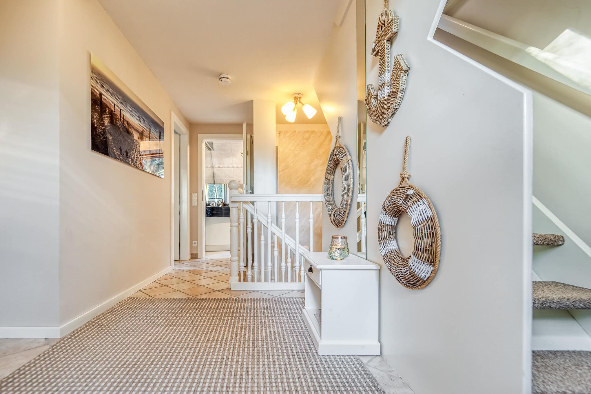 Der gut ausgestattete Küchenbereich mit Induktionsherd, Backofen, Geschirrspüler, Mikrowelle und Kühlschrank bietet jeglichen Komfort einer modernen Küche. Es gibt sowohl eine Nespresso-Kapsel-Maschine also auch eine Filter-Kaffeemaschine. In der Abstellkammer steht eine Waschmaschine zur kostenfreien Nutzung. Ebenfalls auf dieser Wohn-Etage befindet sich das Haupt-Schlafzimmer mit einem Doppelbett und Kleiderschrank. Im Bad gibt es eine geräumige Dusche, einen Waschtisch mit Spiegel und ein WC. Vom kleinen Balkon aus können Sie einen Blick in die Abendsonne genießen.