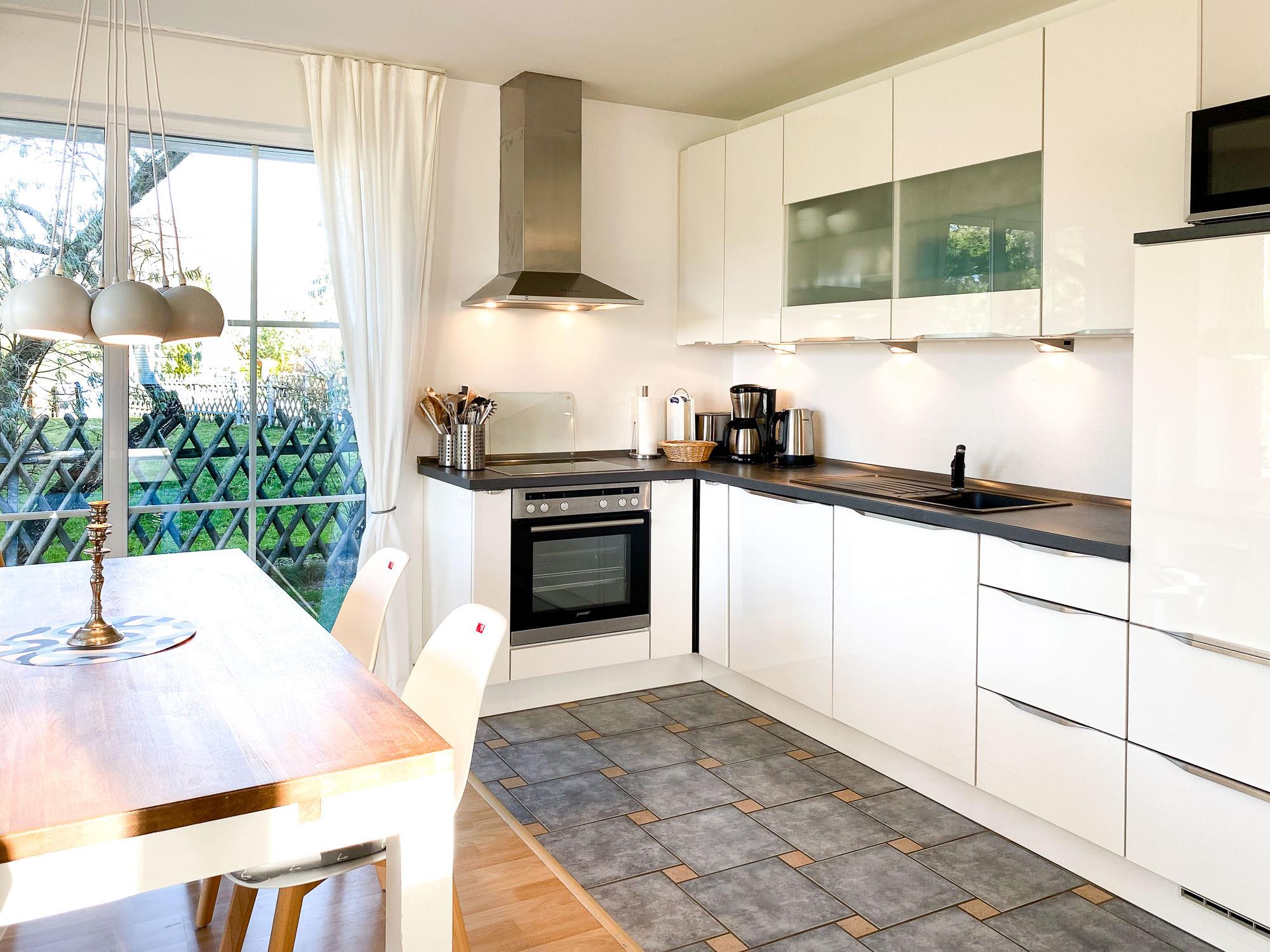 Küche: Voll ausgestattete Küchenzeile mit Backofen, Kochfeld, Mikrowelle, Kühlschrank, Geschirrspüler, Filterkaffeemaschine, Toaster und Wasserkocher
