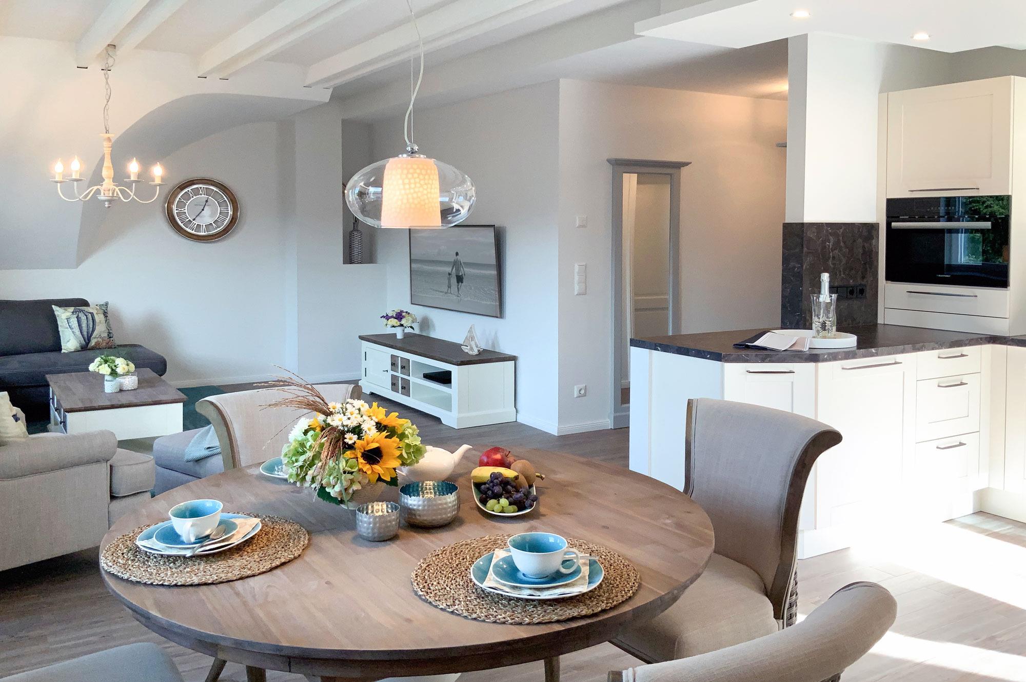Küche: Offene Küche im Landhausstil, voll ausgestattet mit Spülmaschine, Mikrowelle, Kühlschrank, Backofen, Kochfeld, Filterkaffeemaschine, Toaster und Wasserkocher